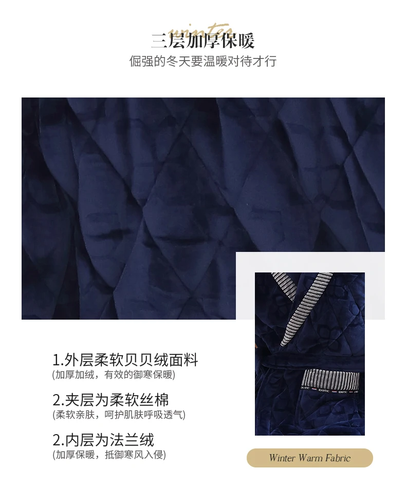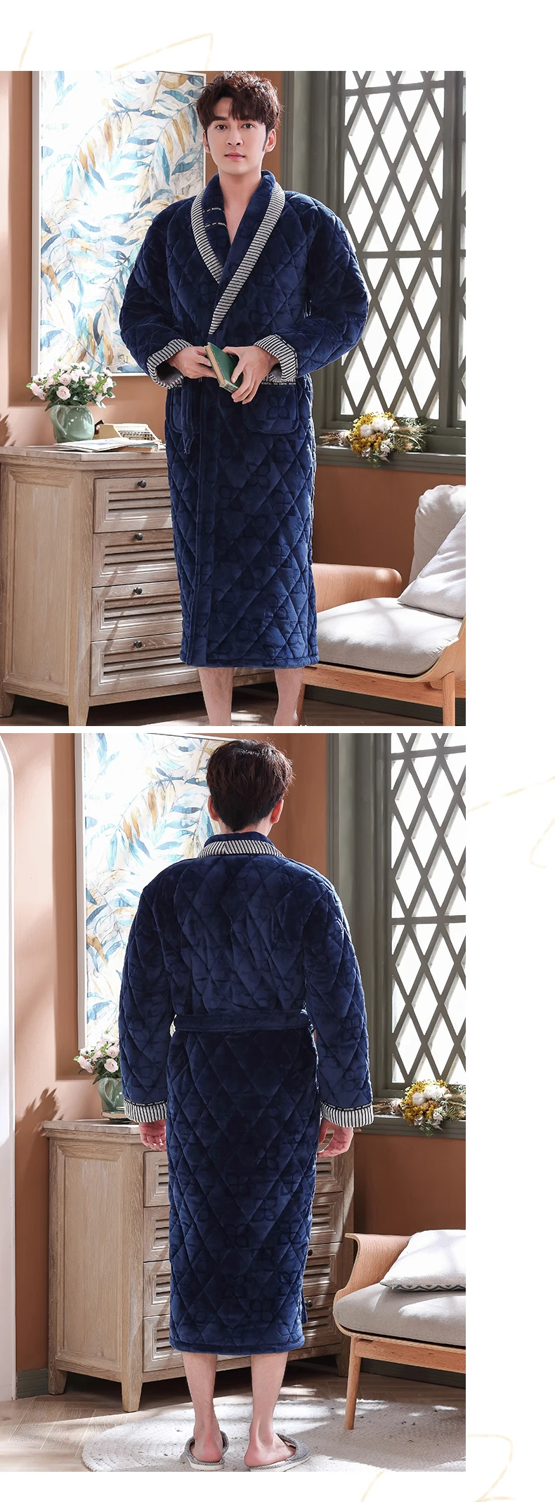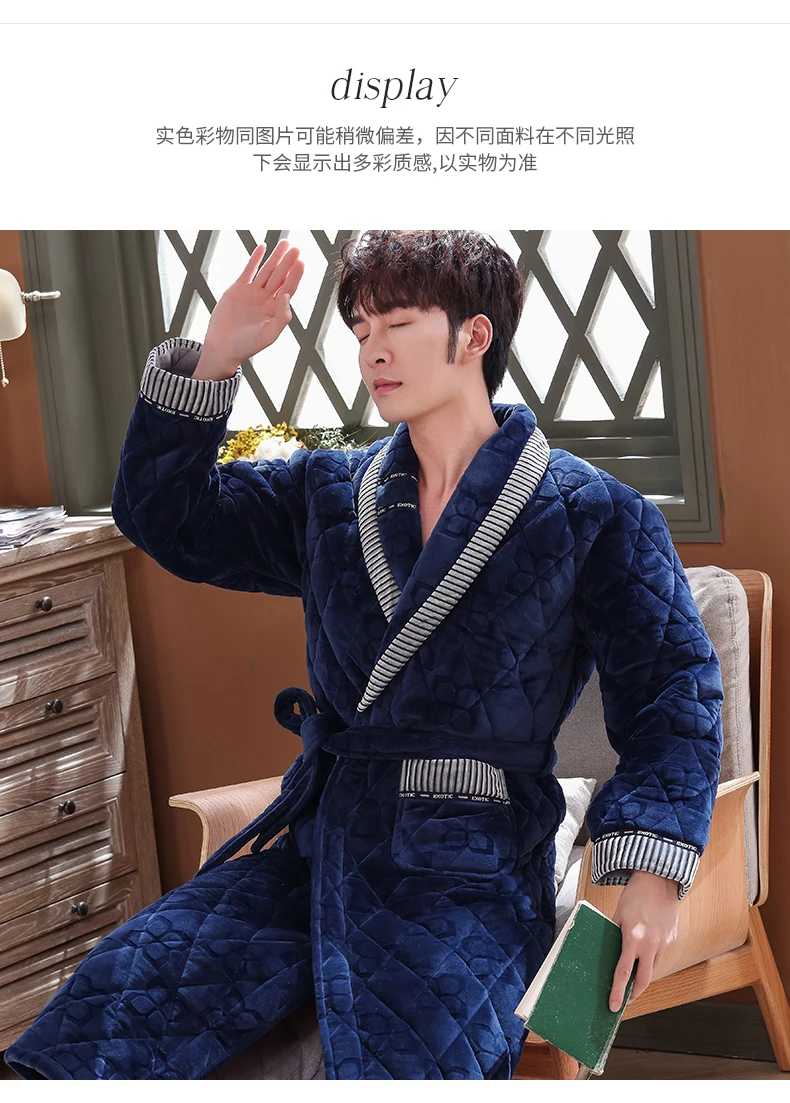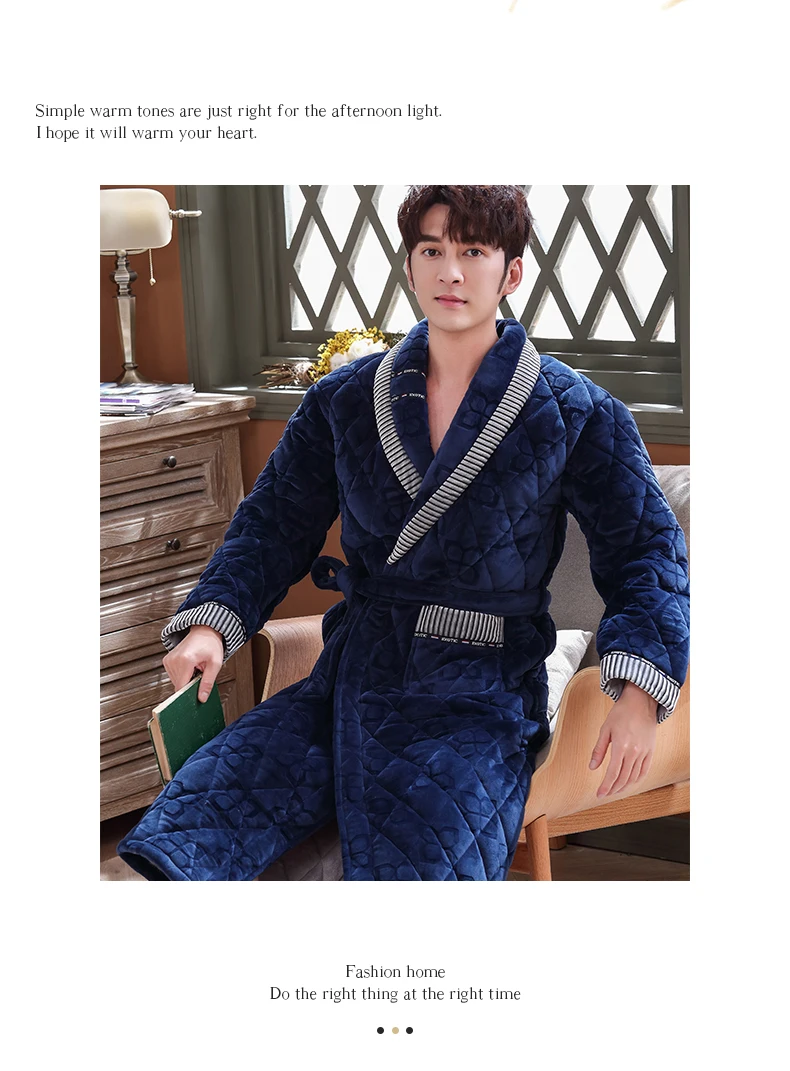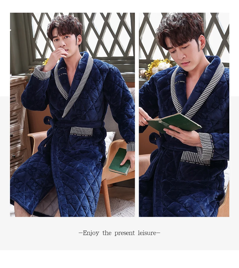 Men Casual Stripe Splicing Kimono Bathrobe Autumn Winter Flannel Quilted Long Robe Thick Warm Sleepwear Big Yards 3XL Nightgown