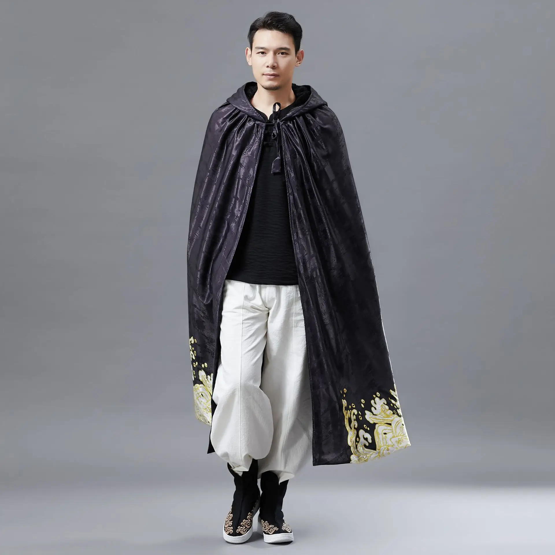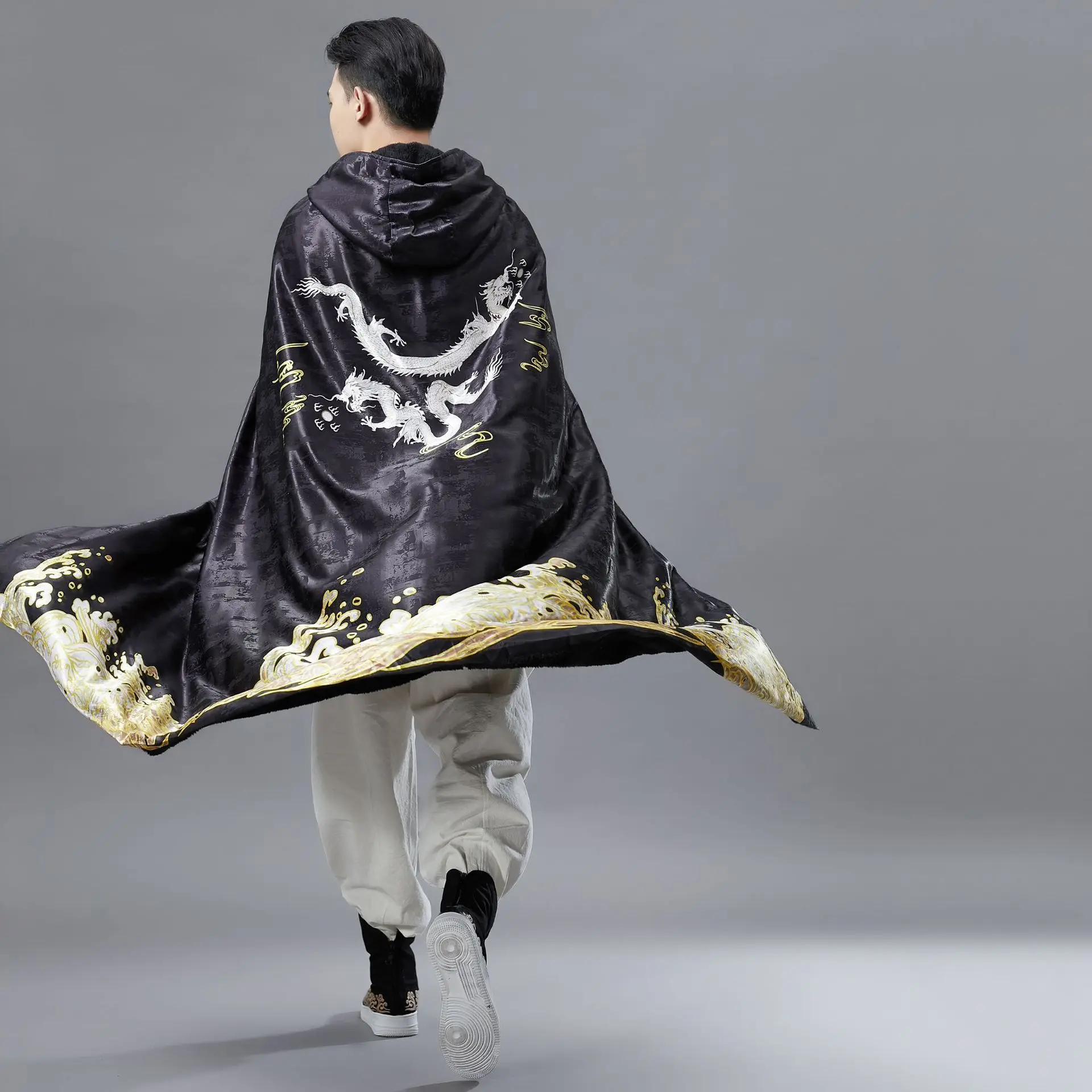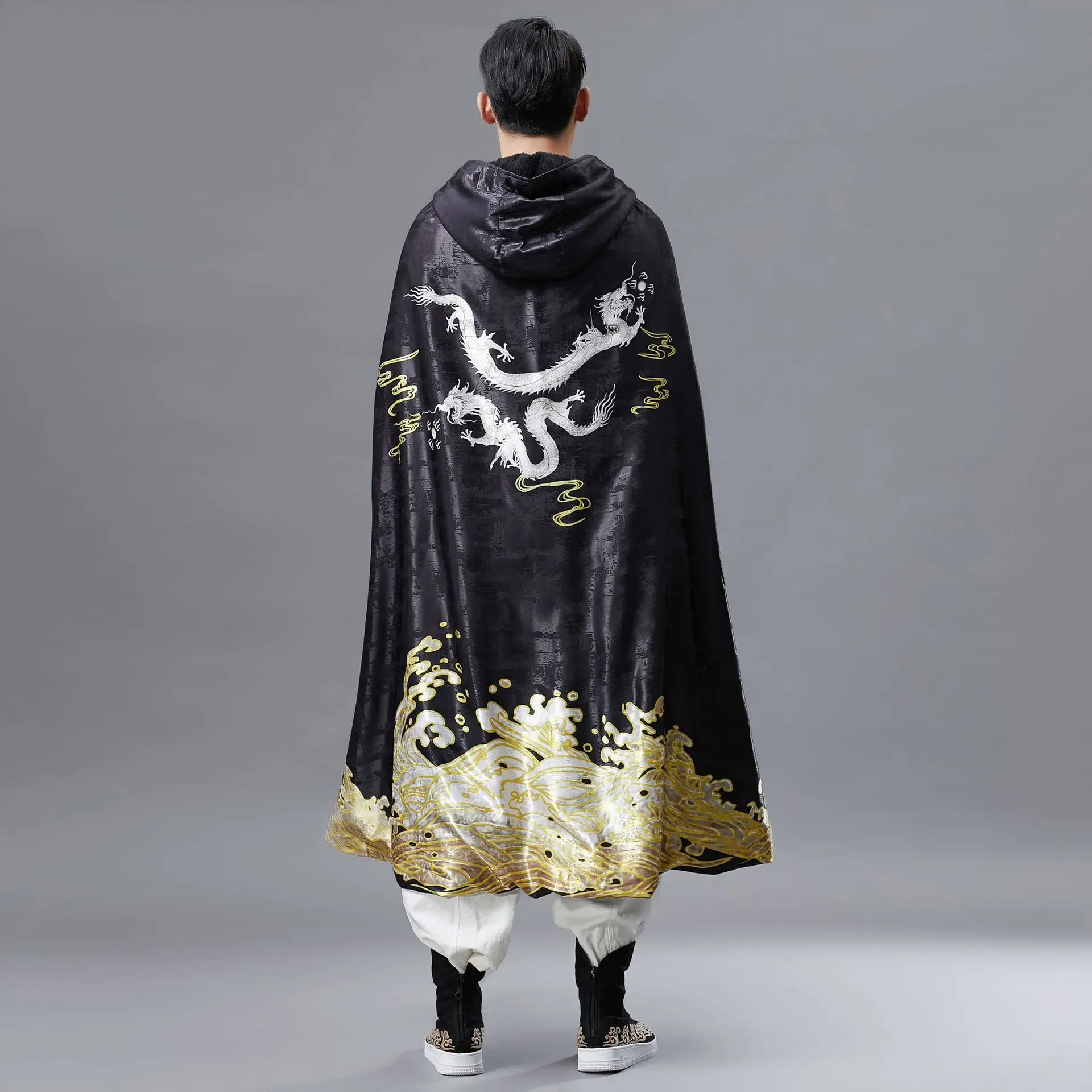 Men Hooded Cloak Vintage Golden Dragon Print Overcoat Mens Long Coat Spring Winter Fashion Men’s Windbreaker Capes Raincoat