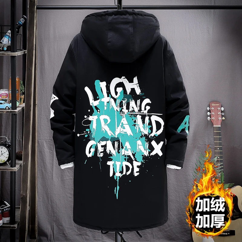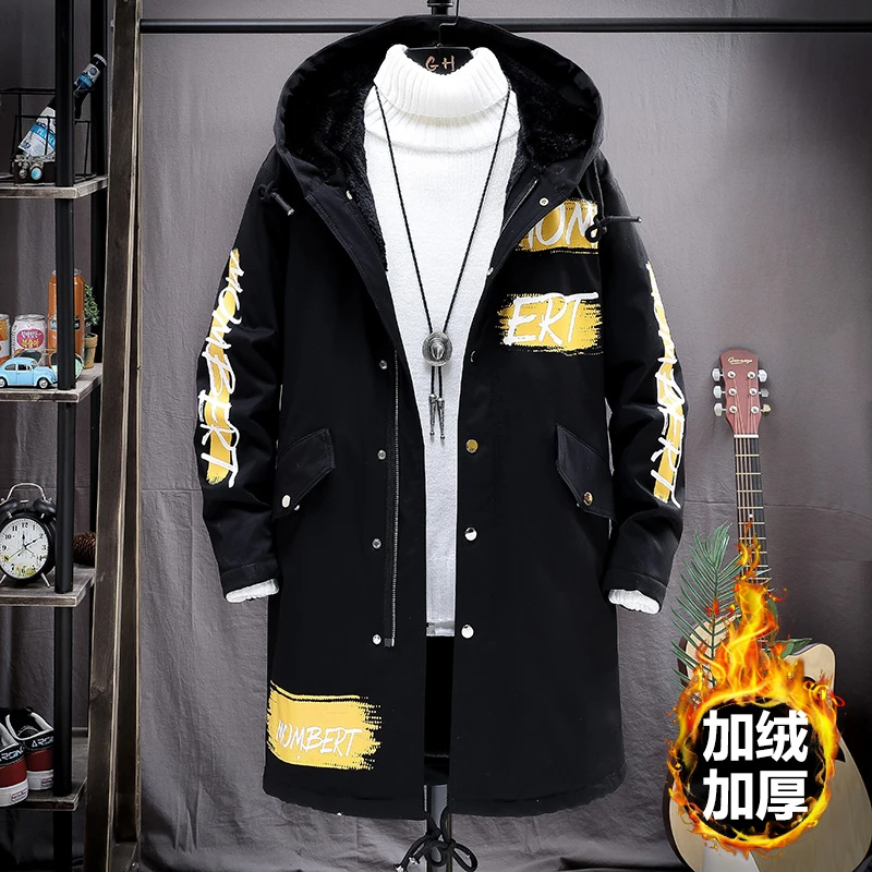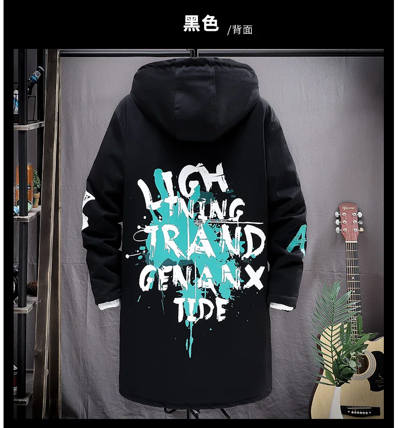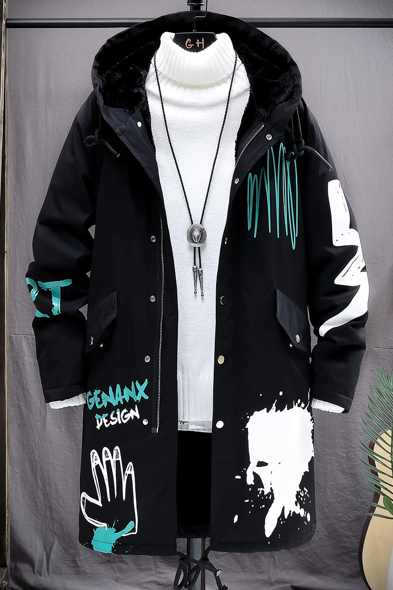Men Loose Windbreaker Thickened With Velvet Hooded Jacket Trend Printed Overcoat Casual Long Trench Coat Male Men’s Clothing
