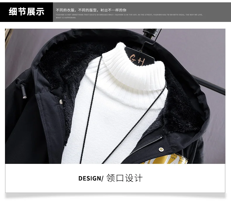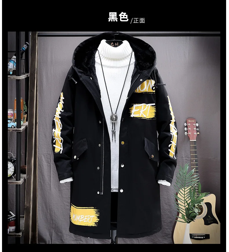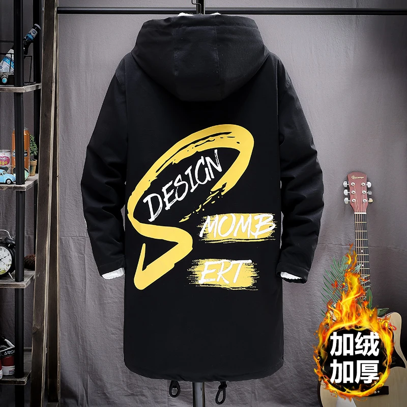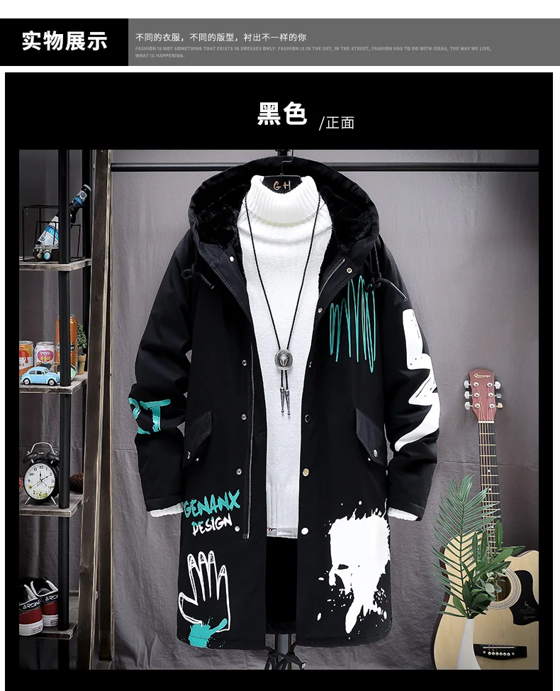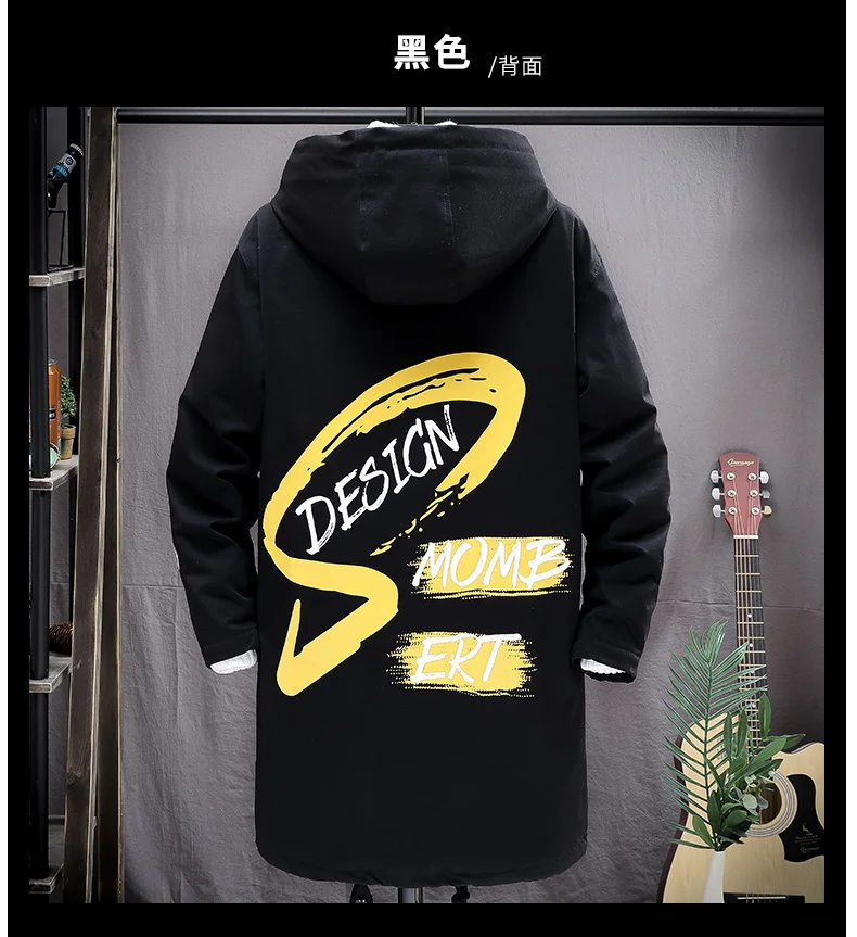 Men Loose Windbreaker Thickened With Velvet Hooded Jacket Trend Printed Overcoat Casual Long Trench Coat Male Men’s Clothing