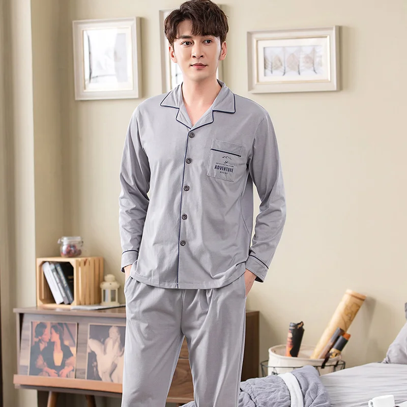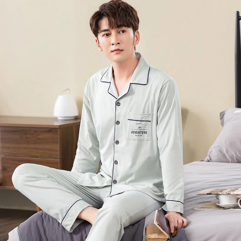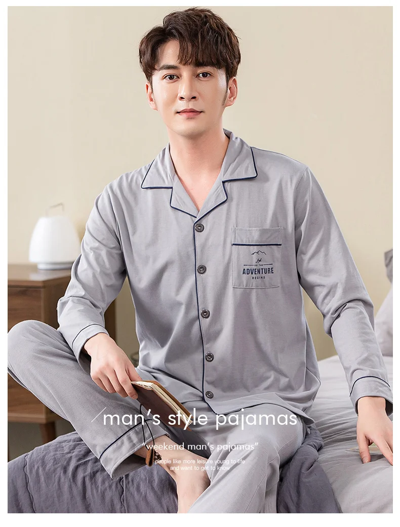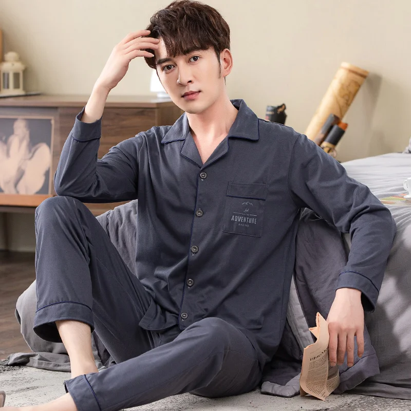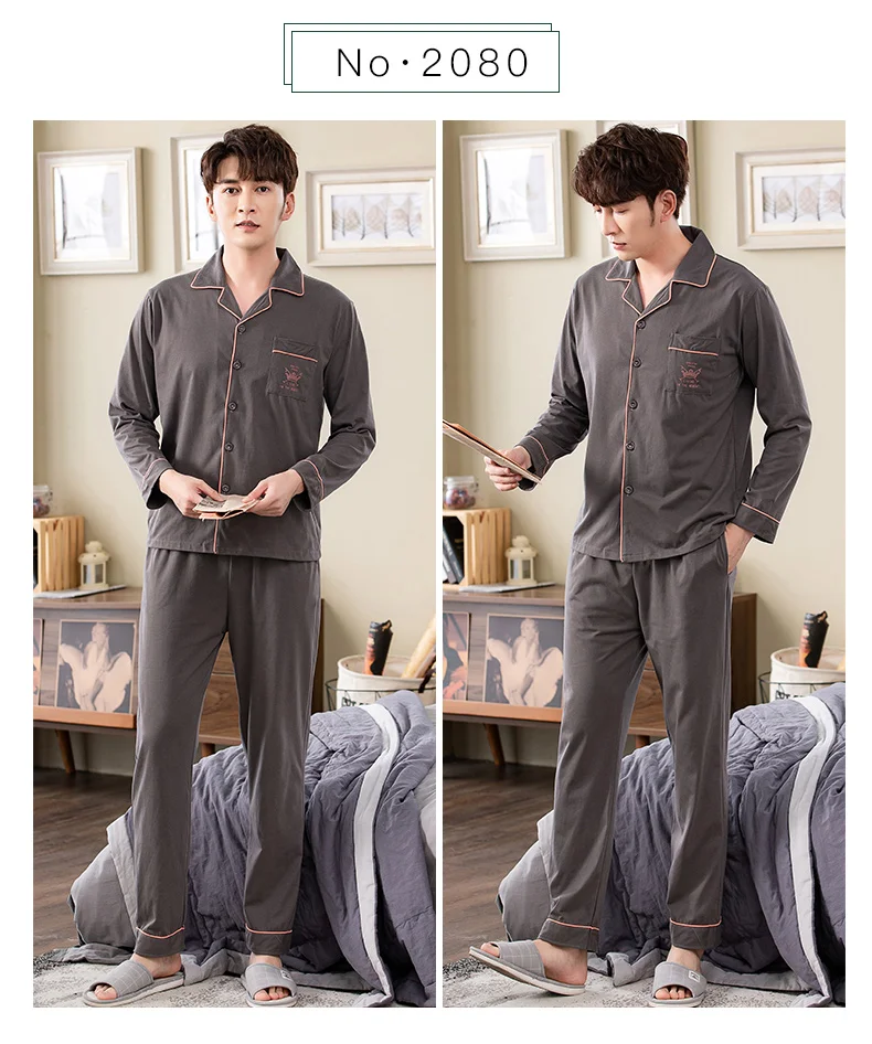 Men Pajama Set Full Cotton Autumn Long Sleeve Solid Color Men Pyjama Suit Spring Nightwear Collar Pijama Male Sleepwear XXXXL