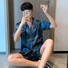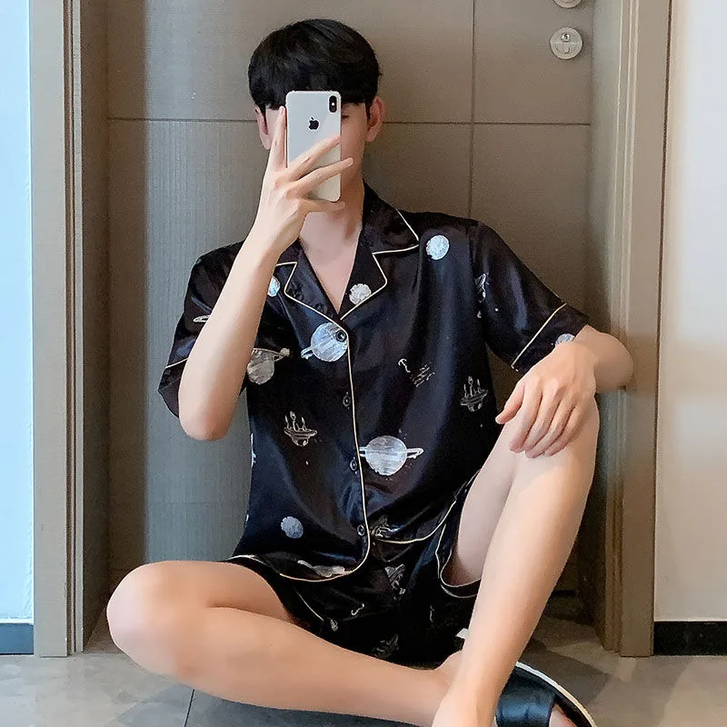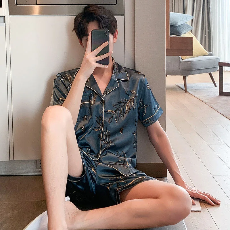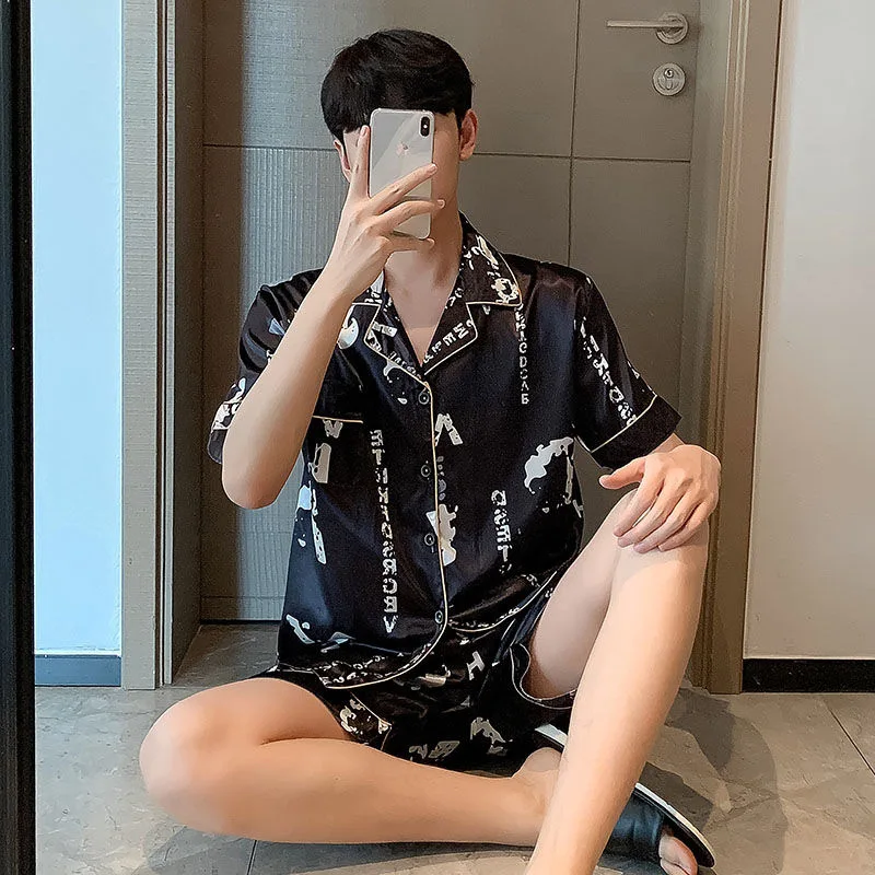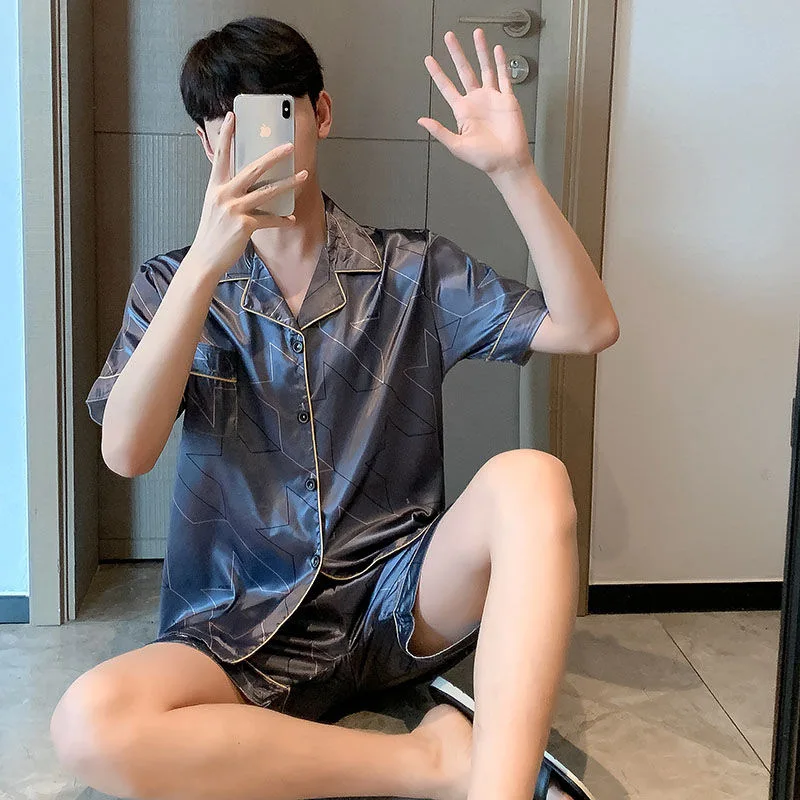 Men Pajama Sets 2023 Summer Sleepwear Ice Silk Satin Short Sleeve Pyjamas Suit Loose Loungewear Male Casual Homewear L-5XL