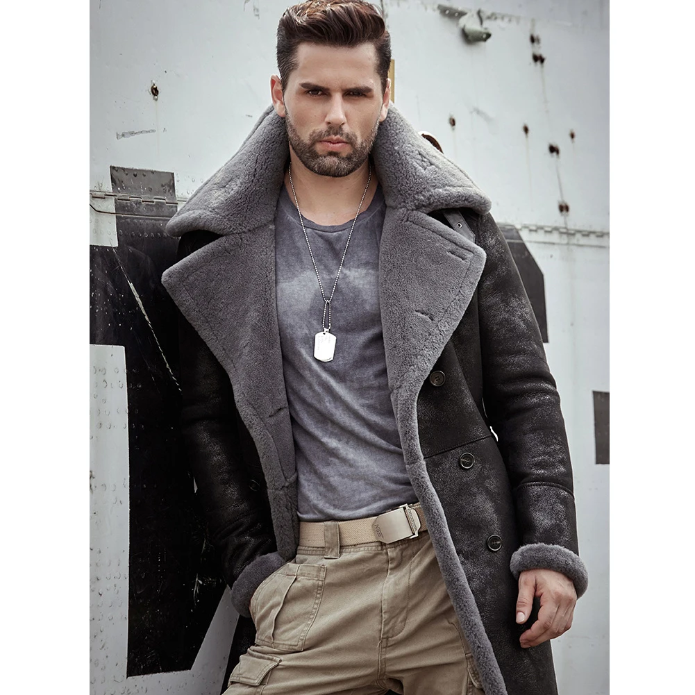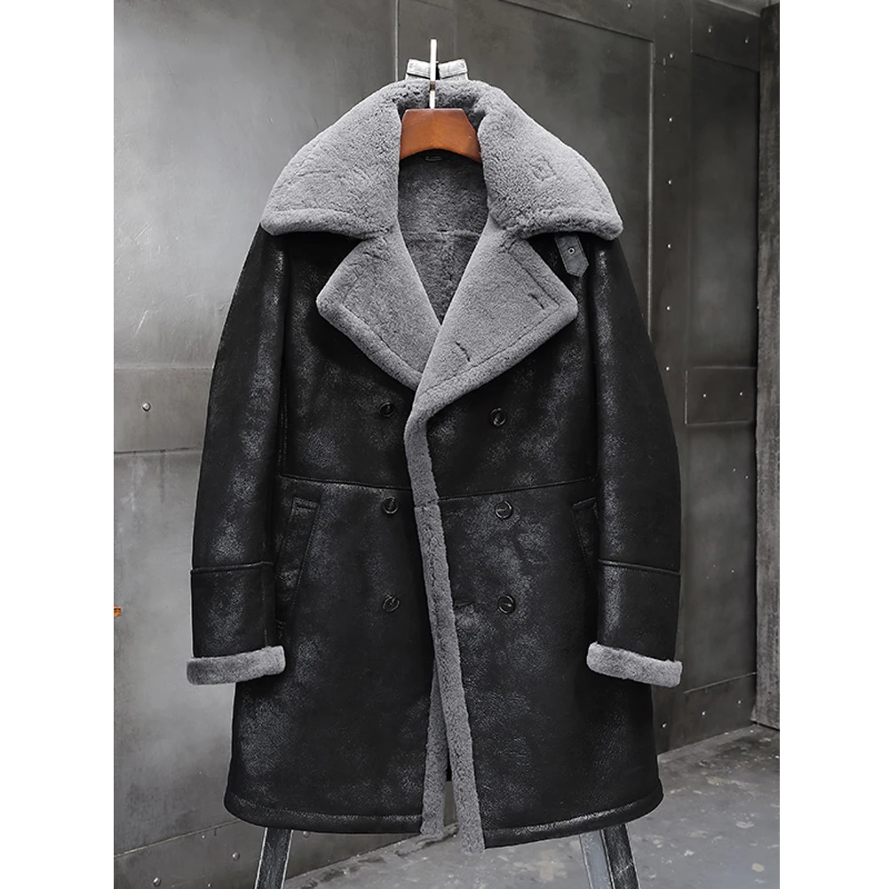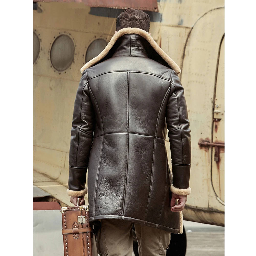 Mens Black Shearling Jacket B3 Flight Jacket Sheepskin Aviator Long Mens Winter Coats Fur Bomber Leather Jacket Trench Coat