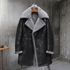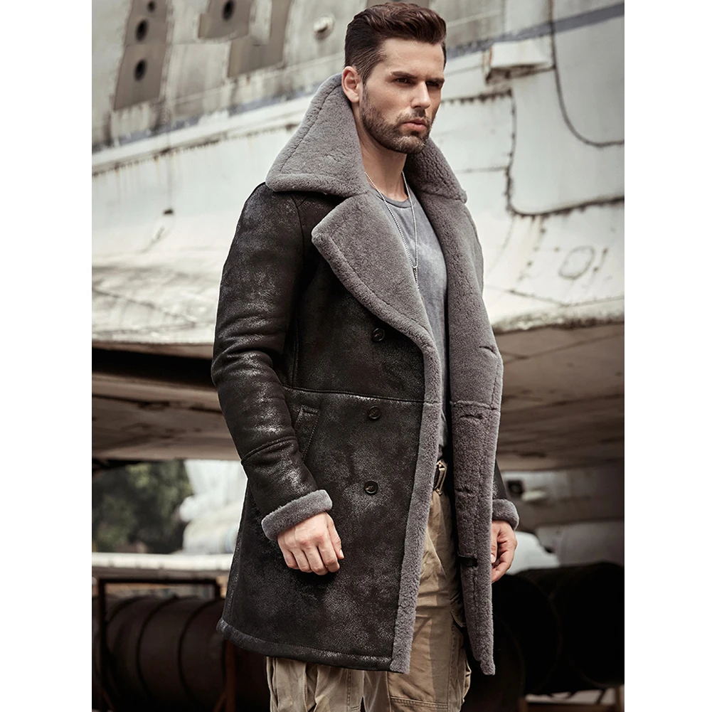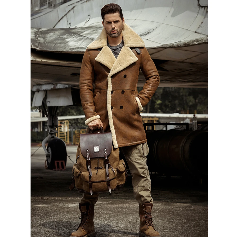 Mens Brown Shearling Coat B3 Flight Jacket Sheepskin Aviator Long Winter Fur Overcoat Bomber Leather Parkas