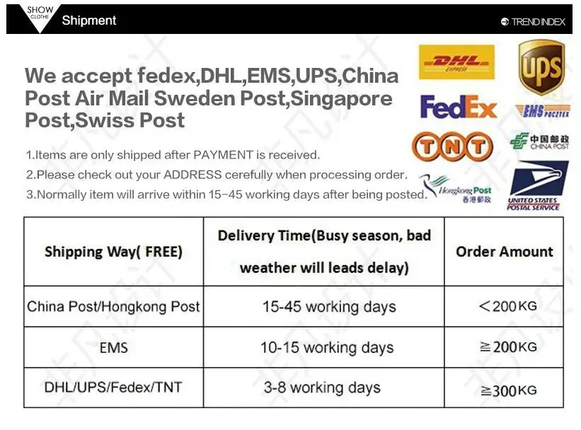 Packages from our warehouse in China will be shipped by ePacket or EMS depending on the weight and size of the product. Packages shipped from our US warehouse are shipped through USPS.