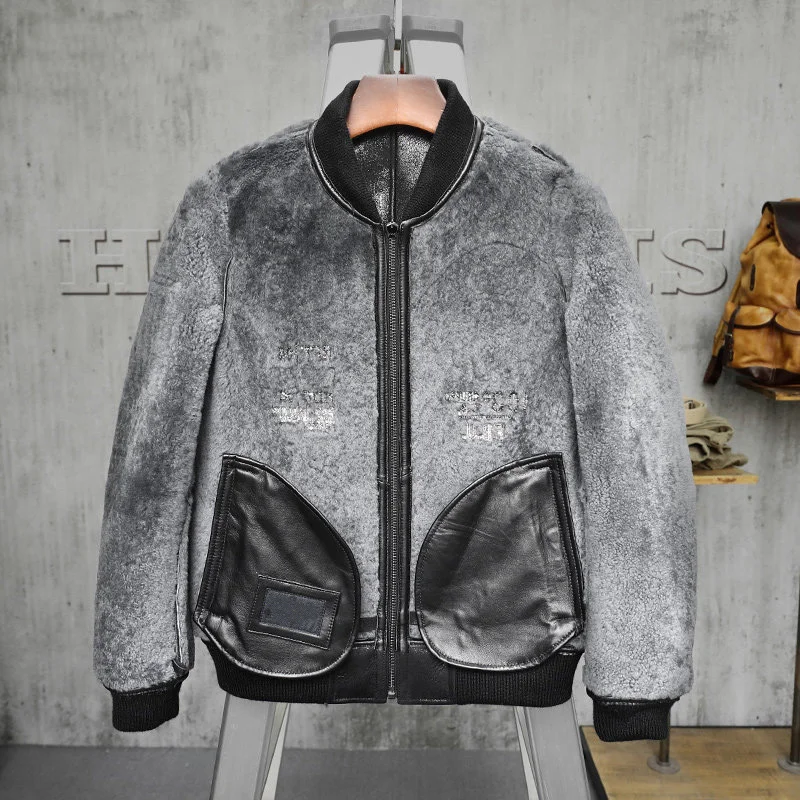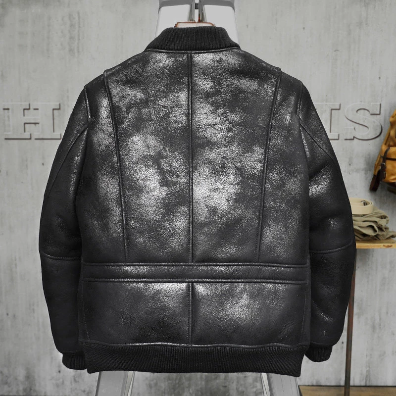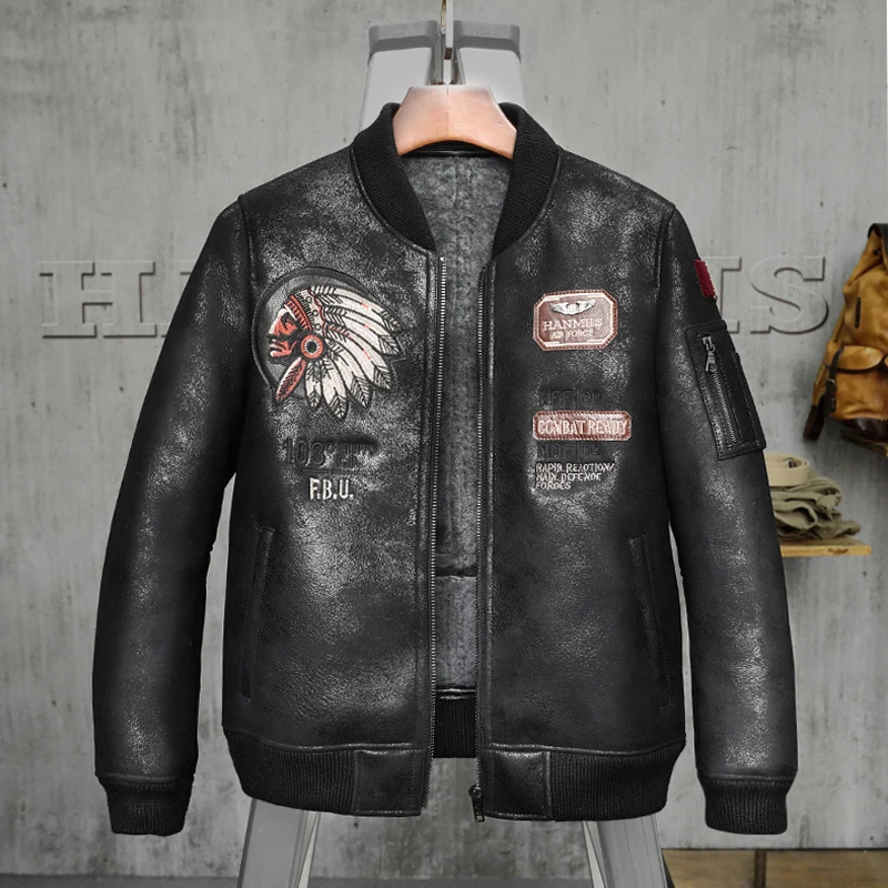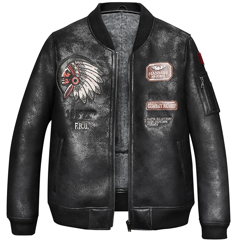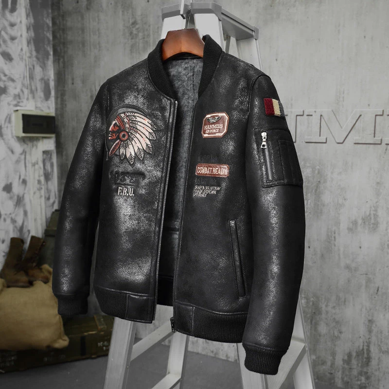Mens Fur Coat B3 Sheepskin Outwear Baseball collar Mens Shearling Coat Indian Totem Men Aviator Jacket Pilot Jacket
