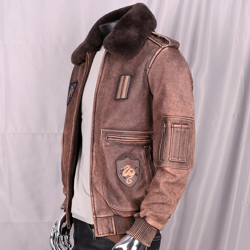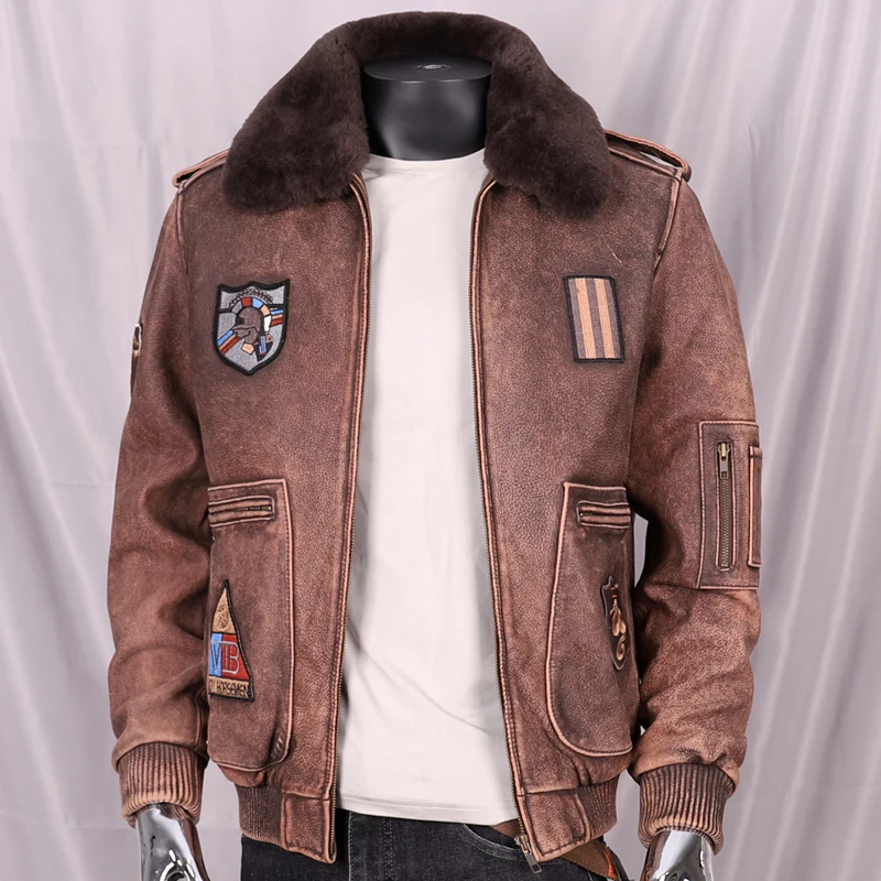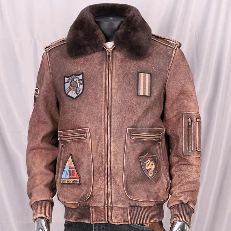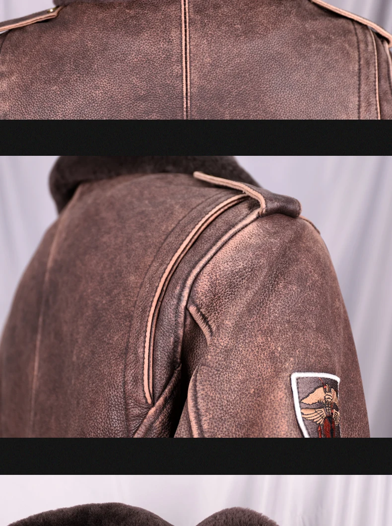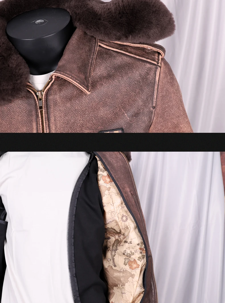 Men’s Genuine Leather Coat High Top 100% Leather Layer Washed And Worn Multi Standard Flight Suit Fur Collar Winter Jacket