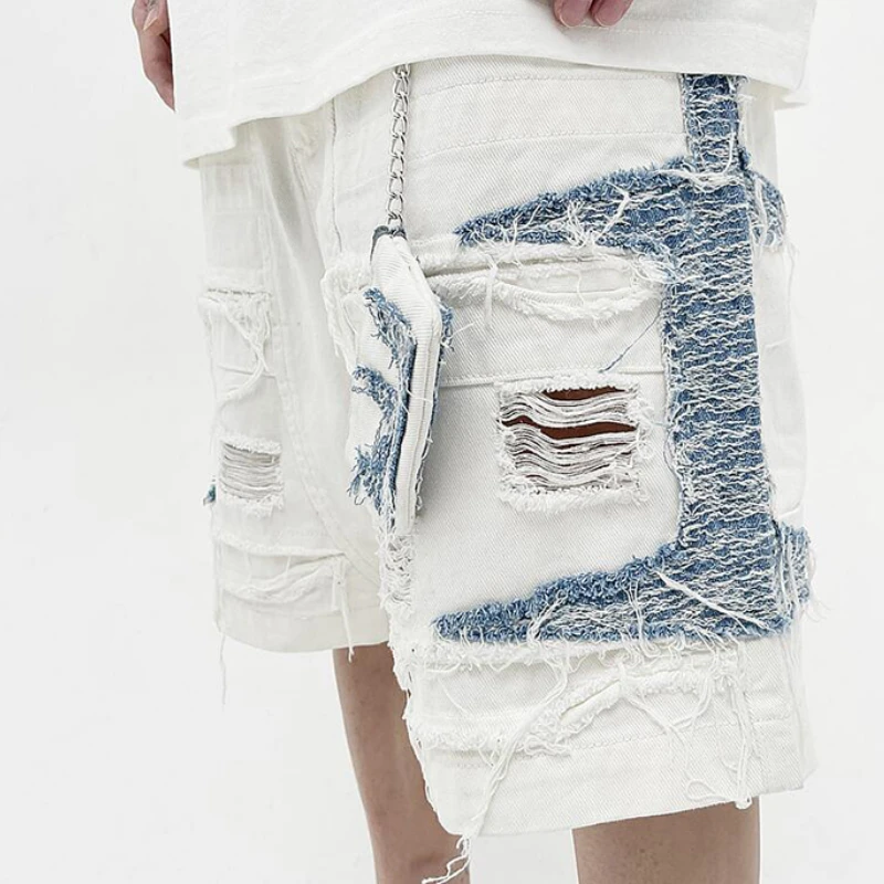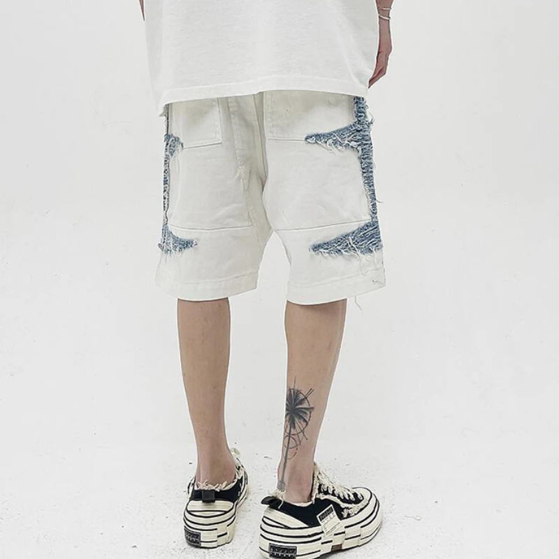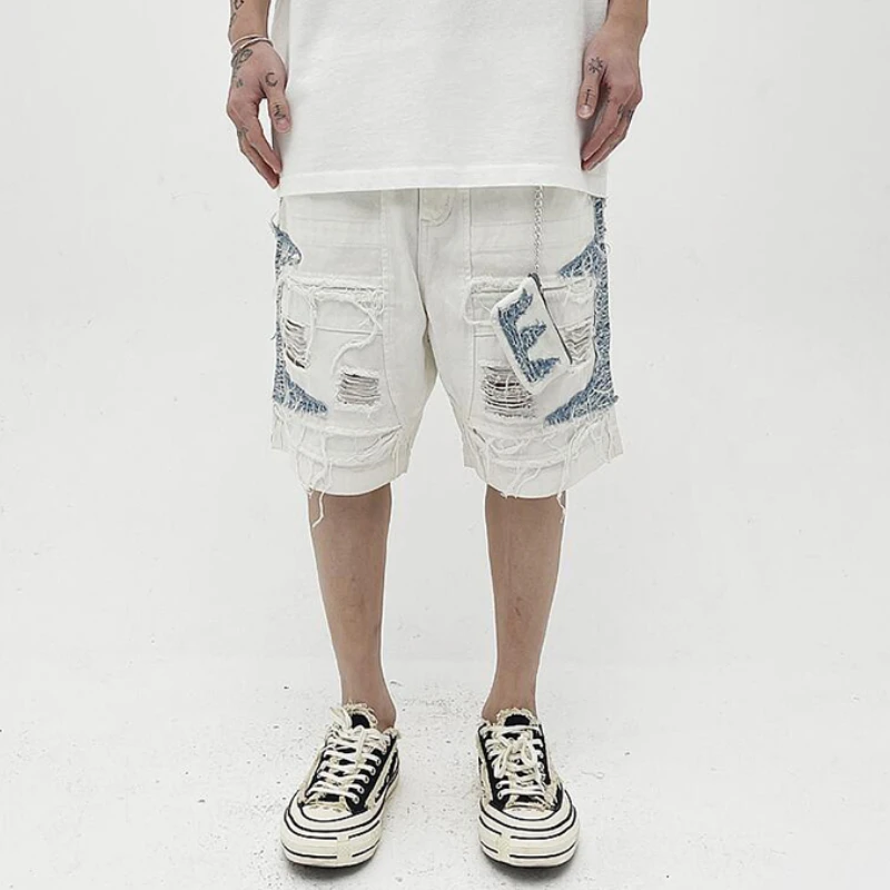 Mens High Street Denim Jean Shorts Casual Loose Destroyed Ripped Holes Loose Shorts Patchwork Hip Hop Streetwear Short Joggers