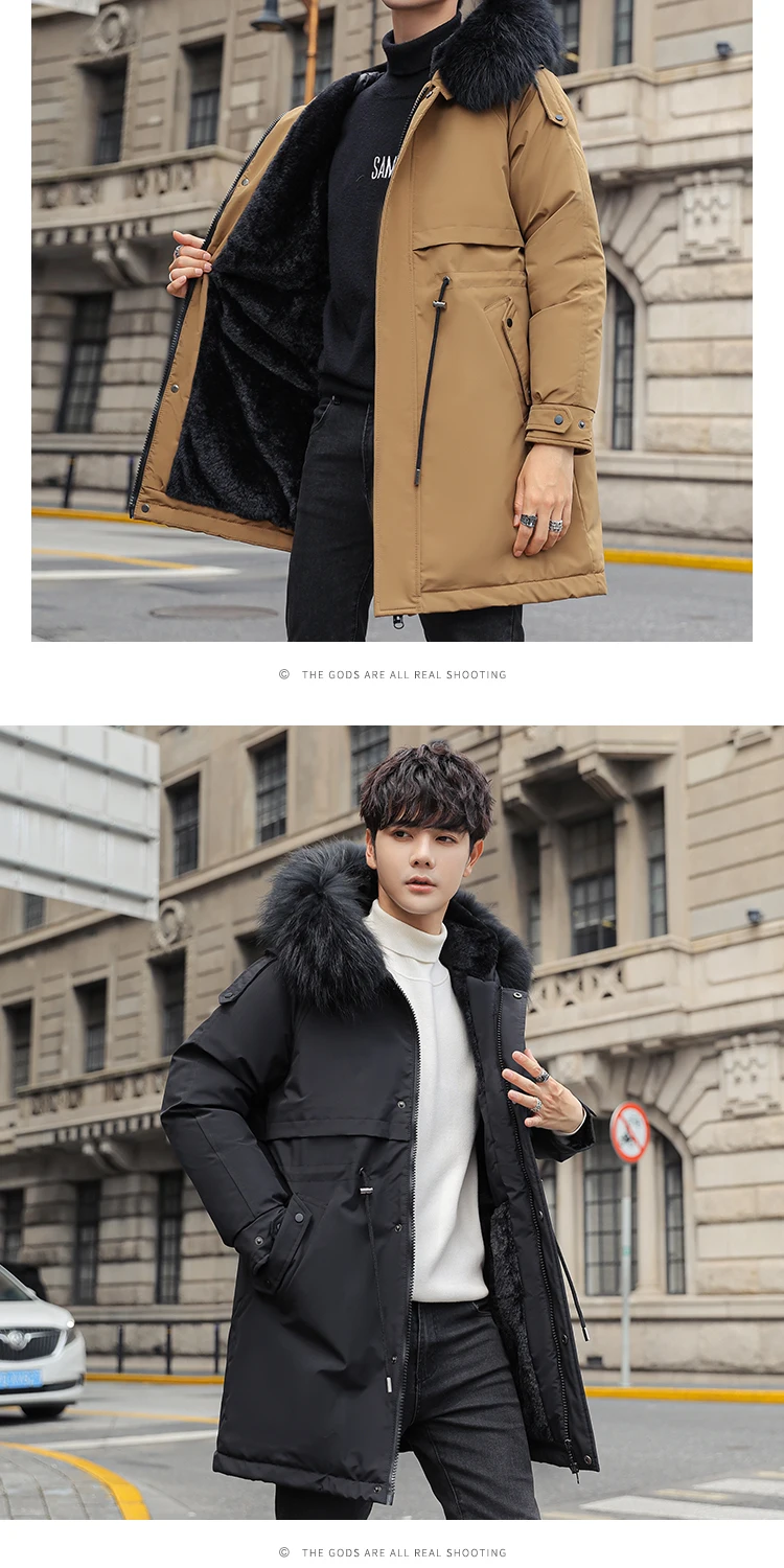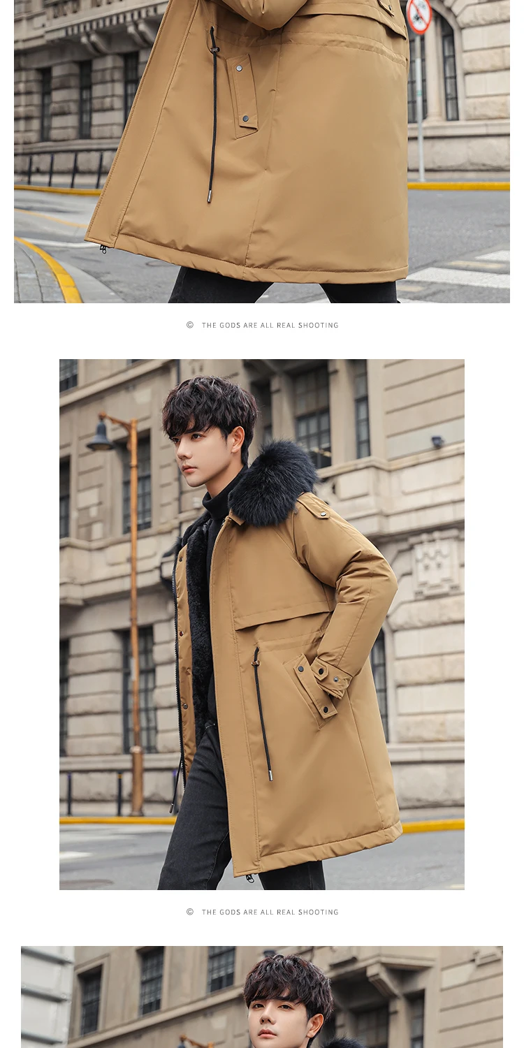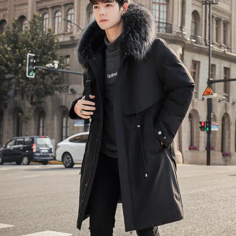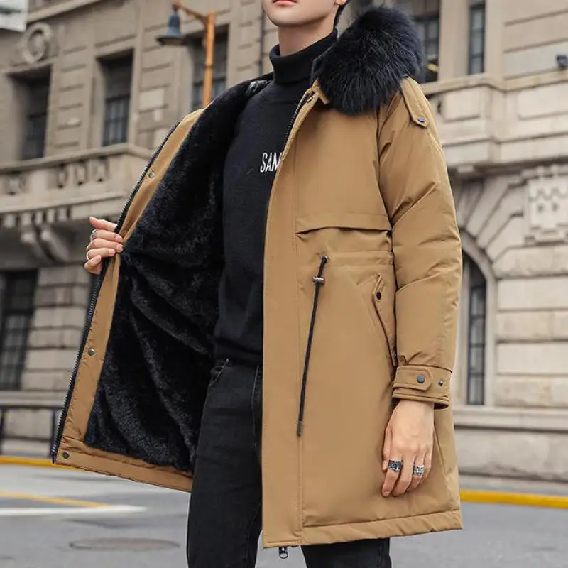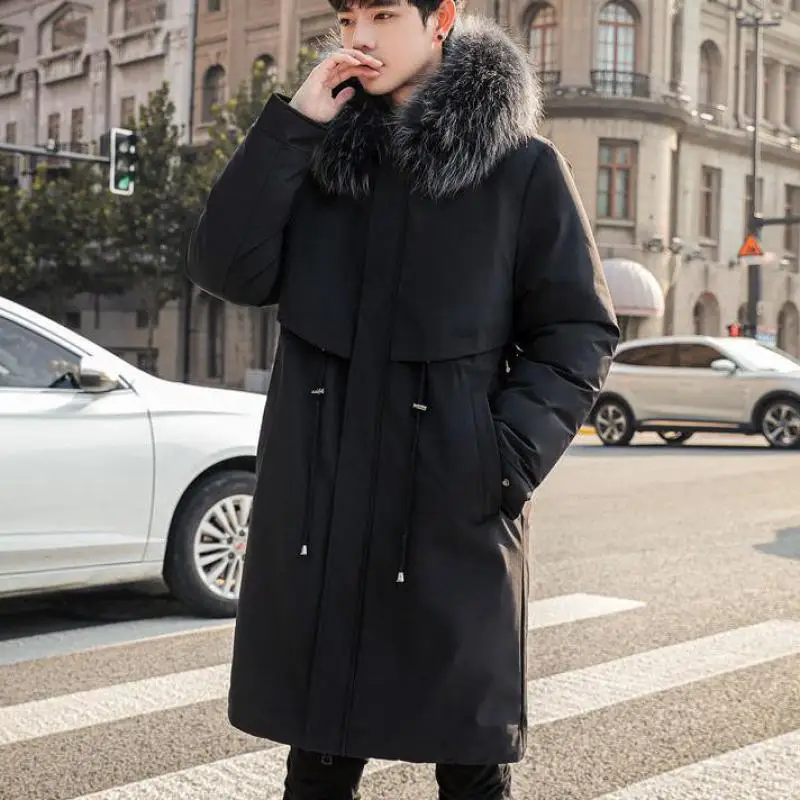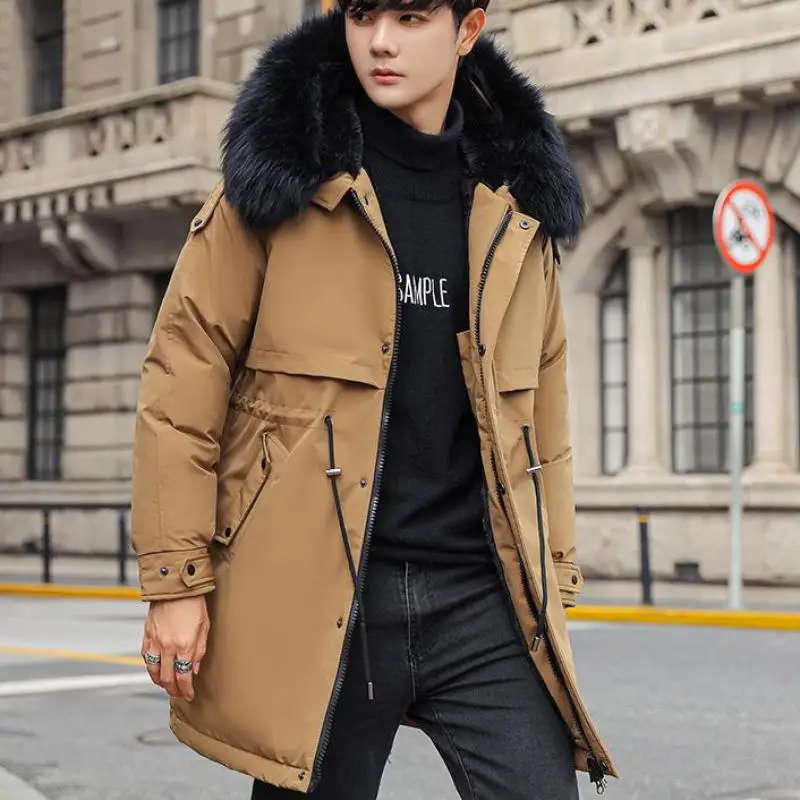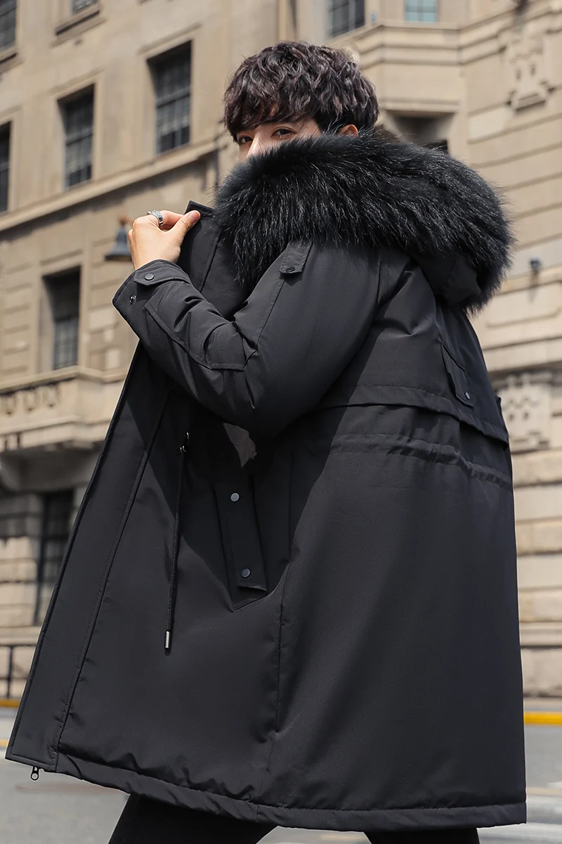Mens Large Hooded Jackets Big Fur Collar Loose Khaki Parkas Jackets Tunic Winter Long Padded Coats Black Overcoat Trench Coats