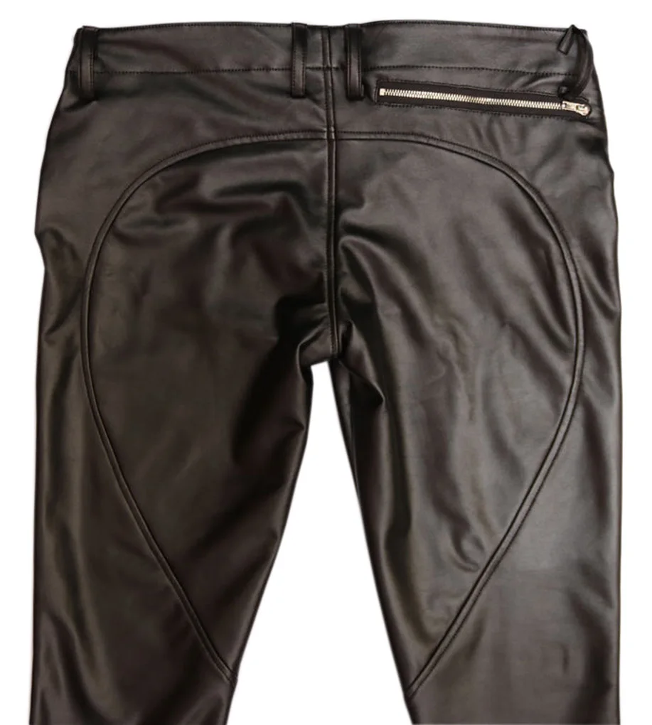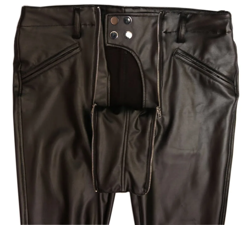 Men’s Mid Waist Fashion Cool Tight Pants Black Slim Leather Trousers Zipper Open