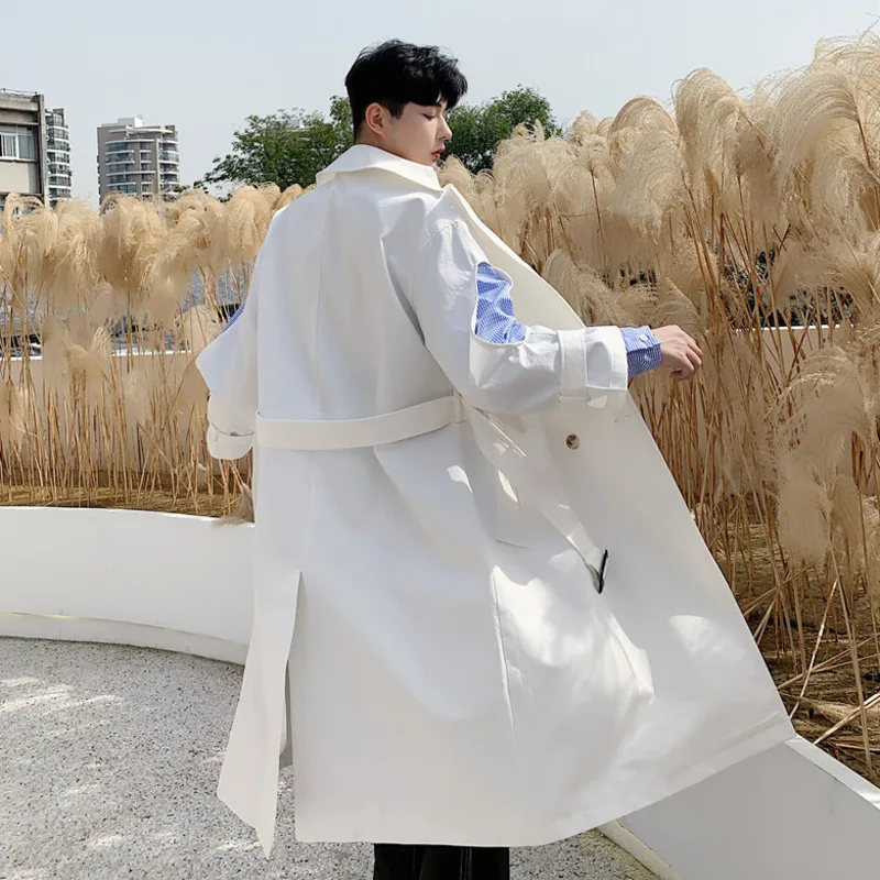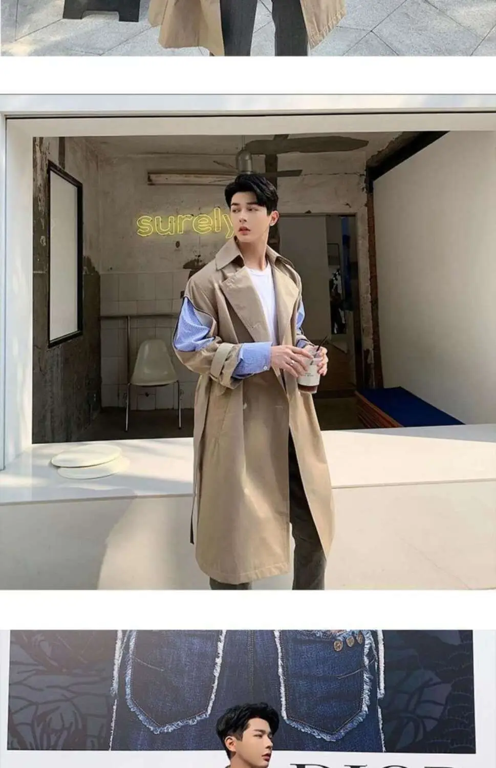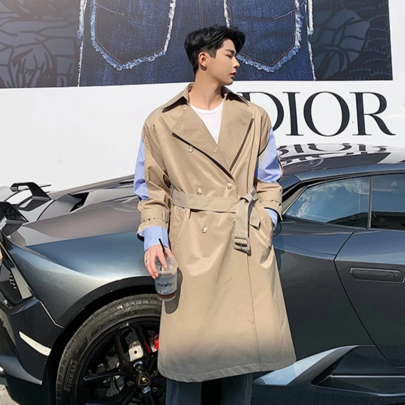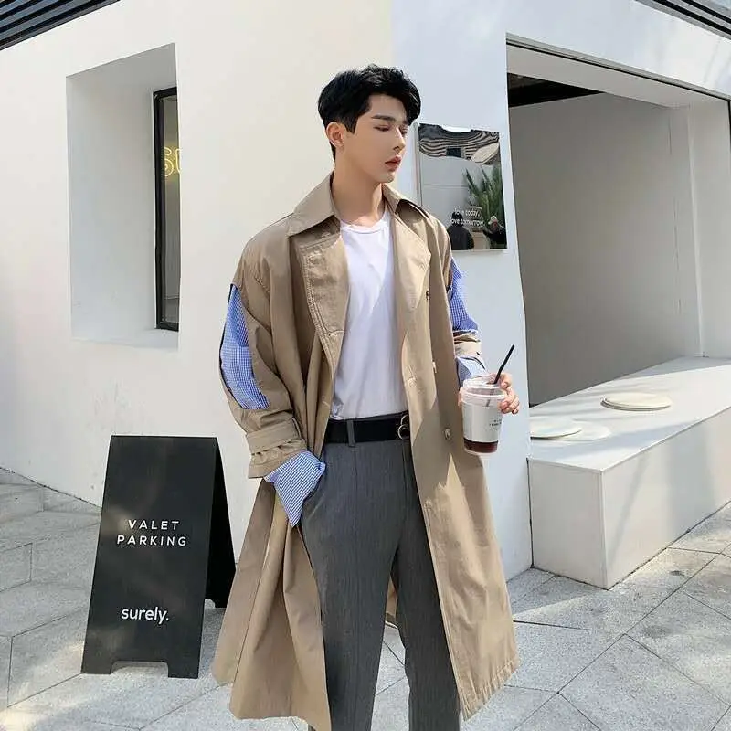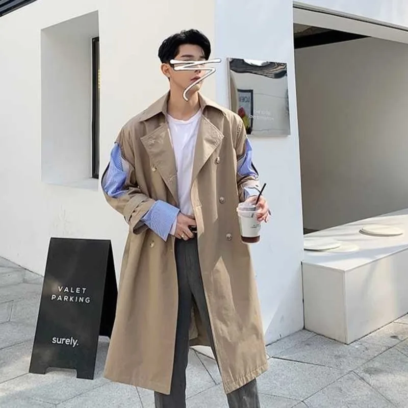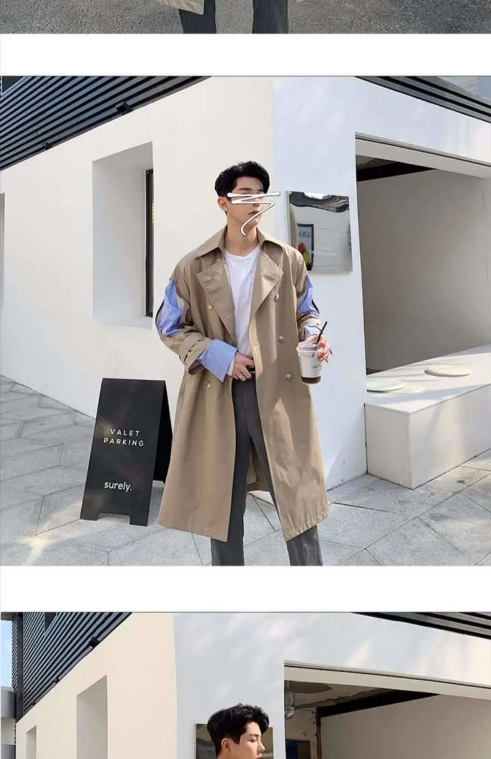 Men’s Patchwork Fake Two Pieces Trench Coat Autumn New Trendy Windbreaker For Male Vintage Fashion Korean Long Coat