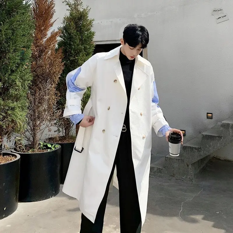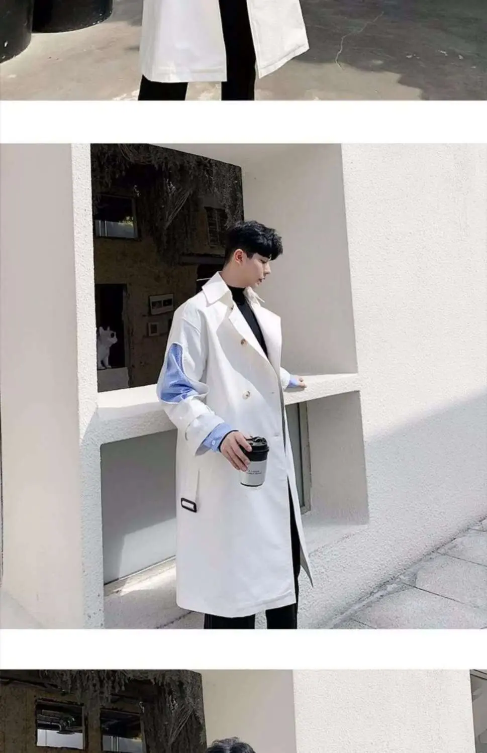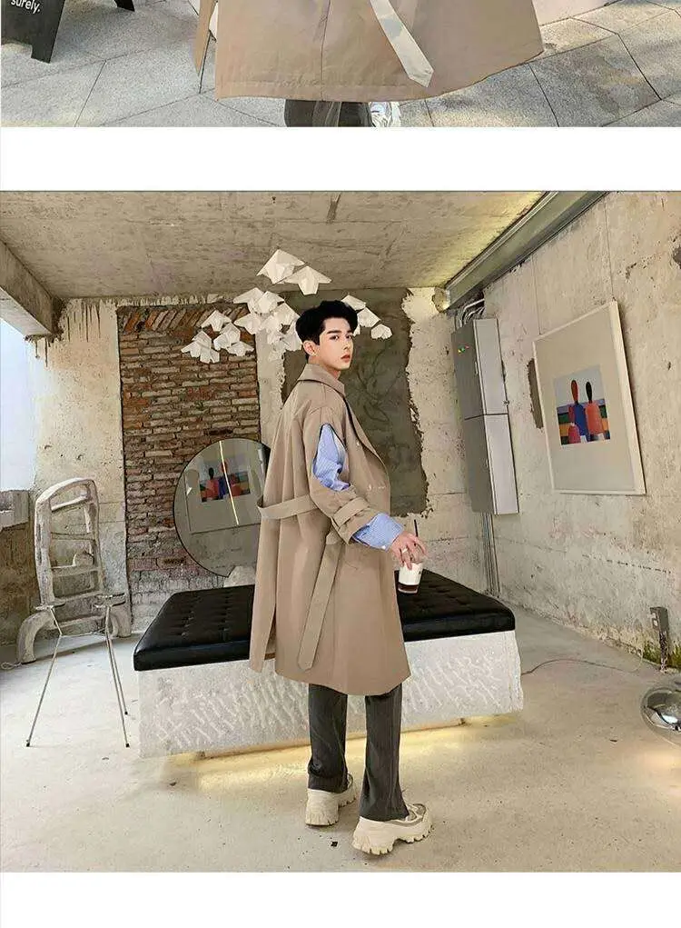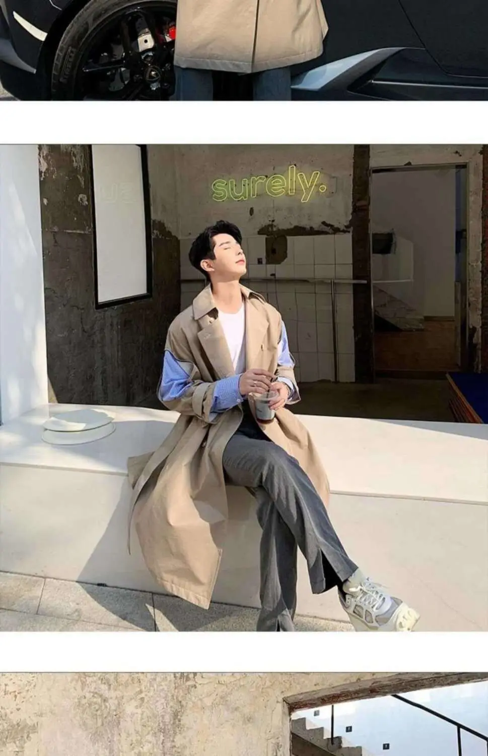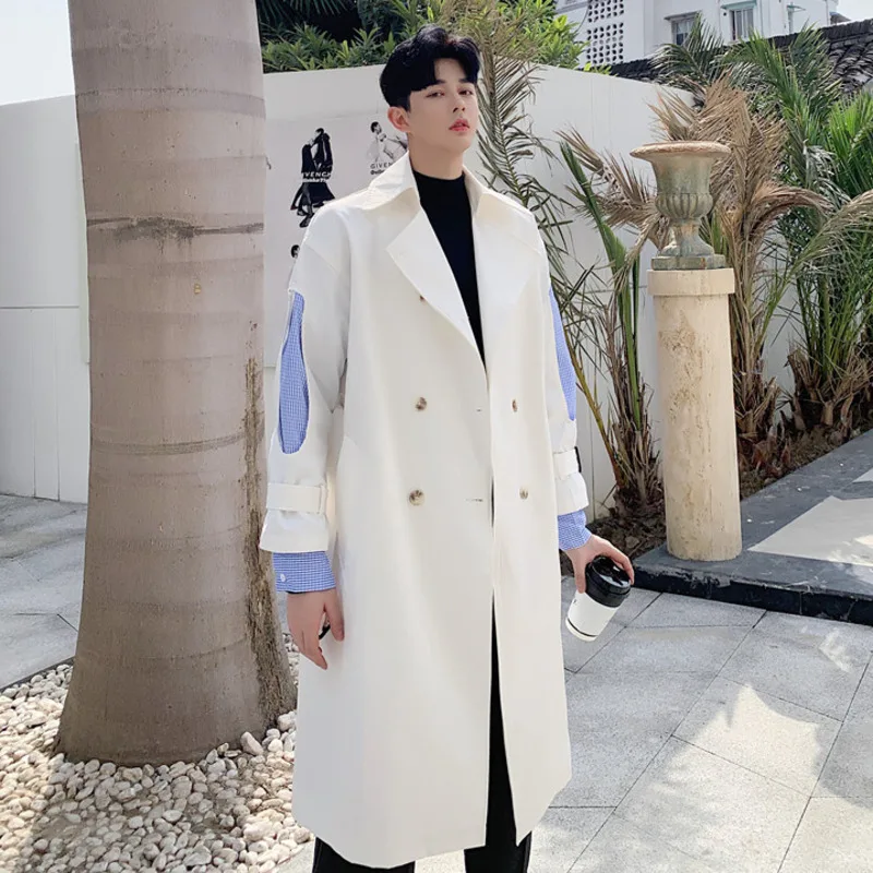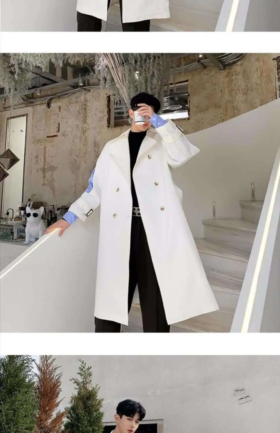 Men’s Patchwork Fake Two Pieces Trench Coat Autumn New Trendy Windbreaker For Male Vintage Fashion Korean Long Coat