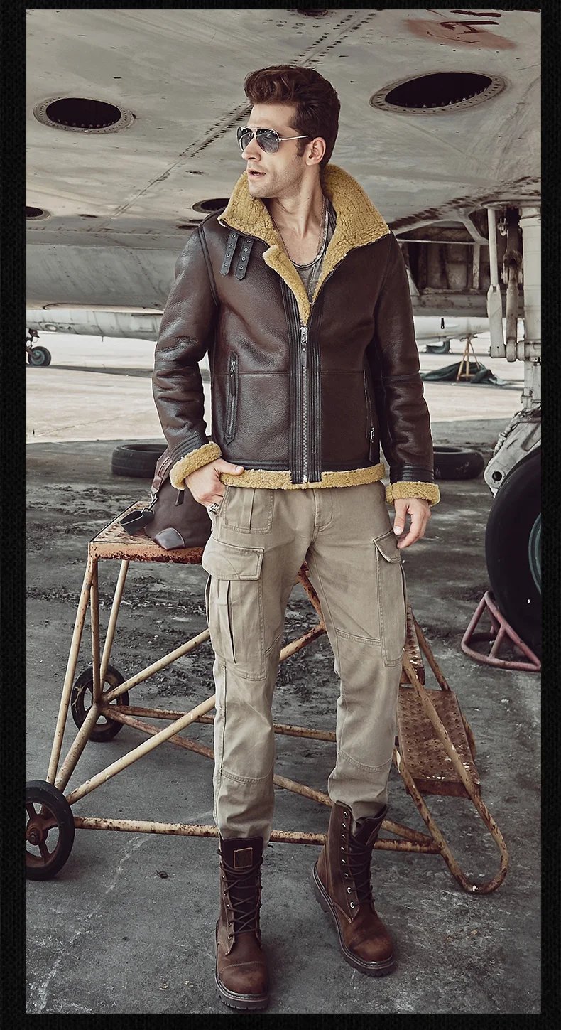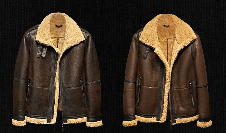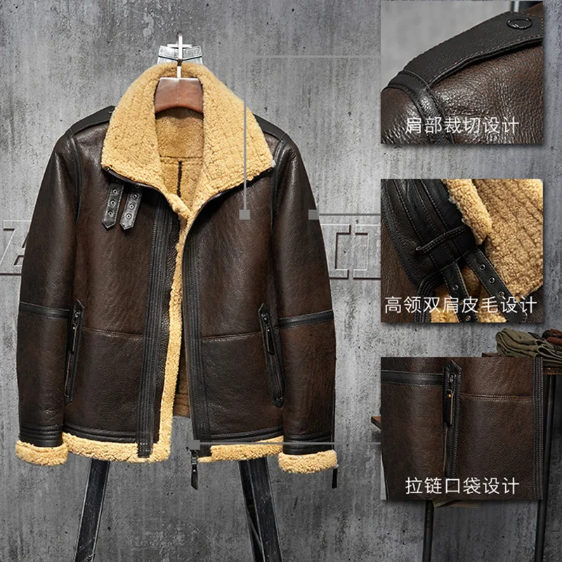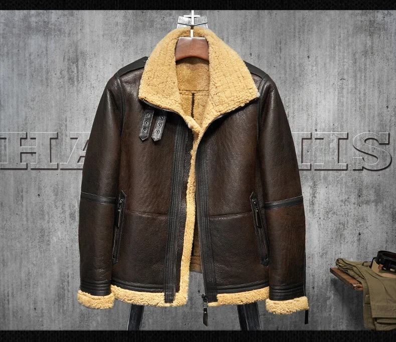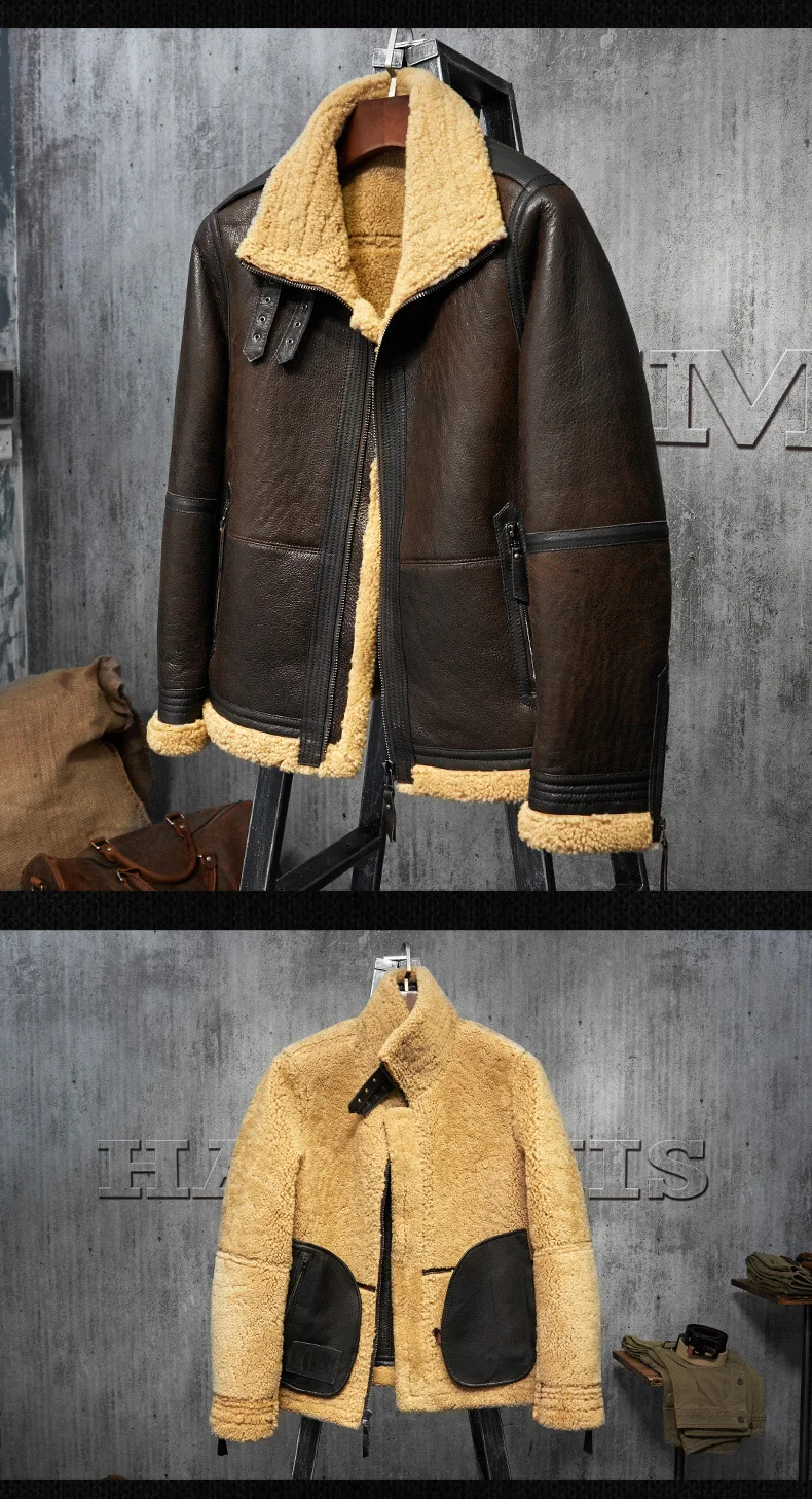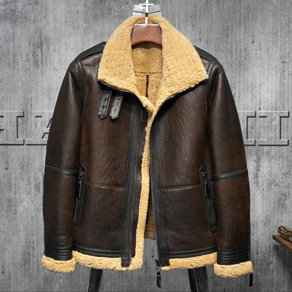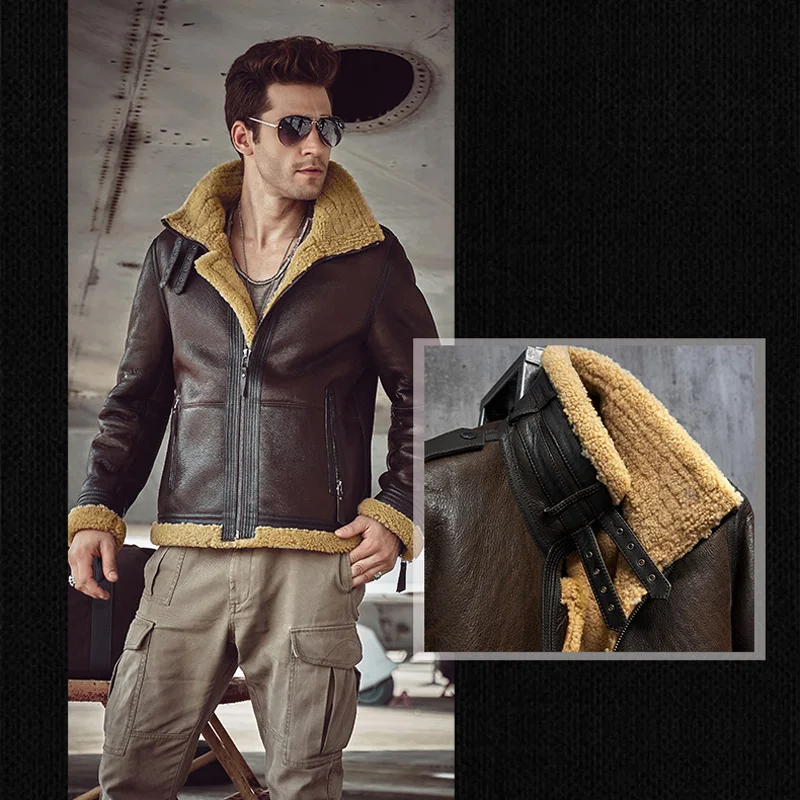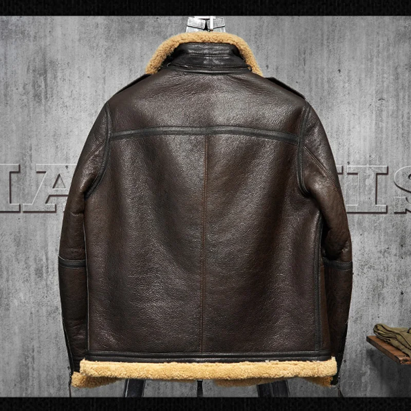 Men’s Shearling Jacket B3 Flight Jacket Short Fur Leather Jacket Imported Wool From Australia Mans Sheepskin Aviator Fur Coat