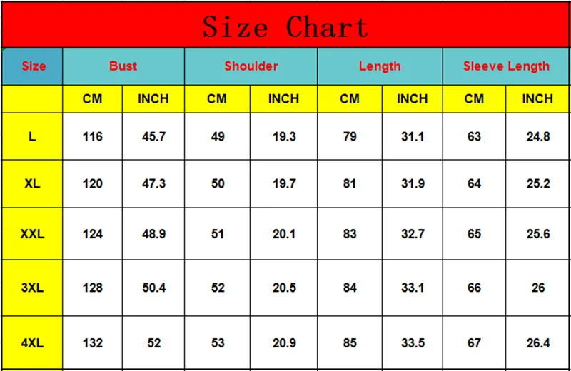 (There are 1-3cm margin of error, If you are not sure the size, Please send the information of your Height, Weight and Chest to me, I will help you choose the correct size. )