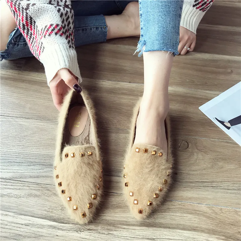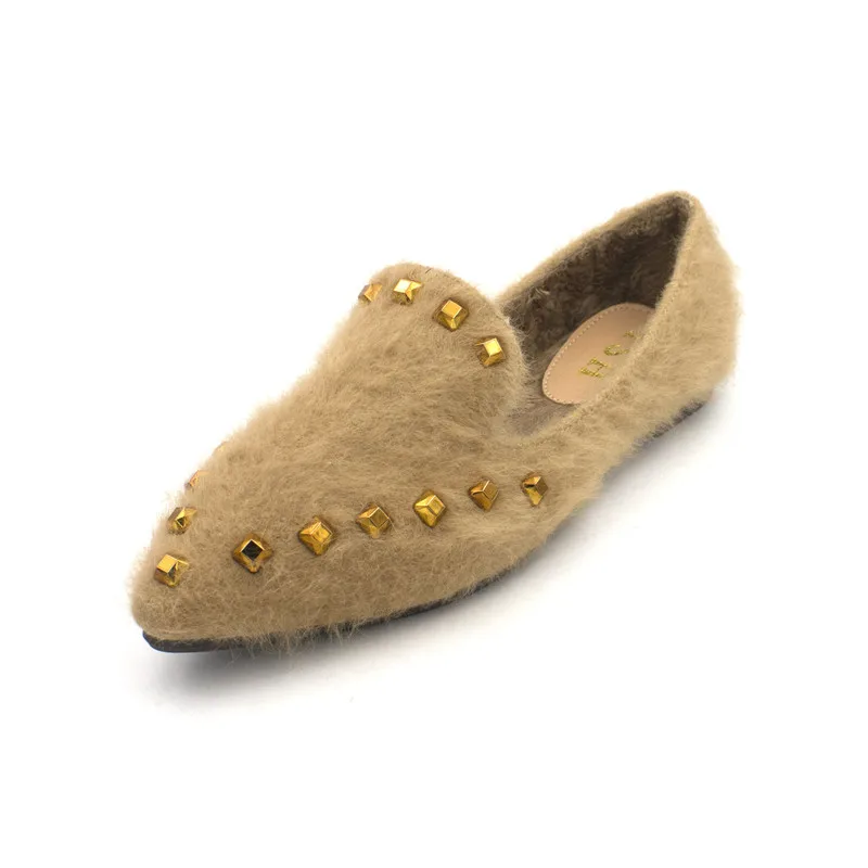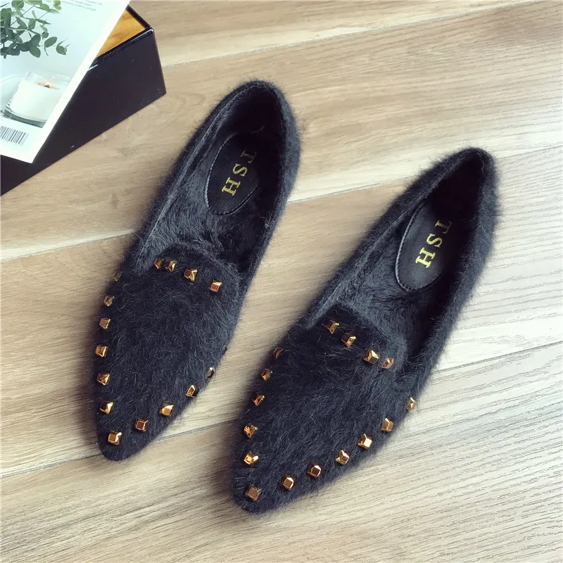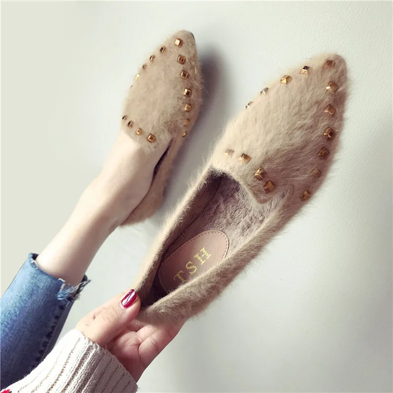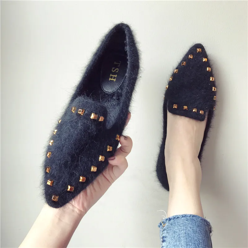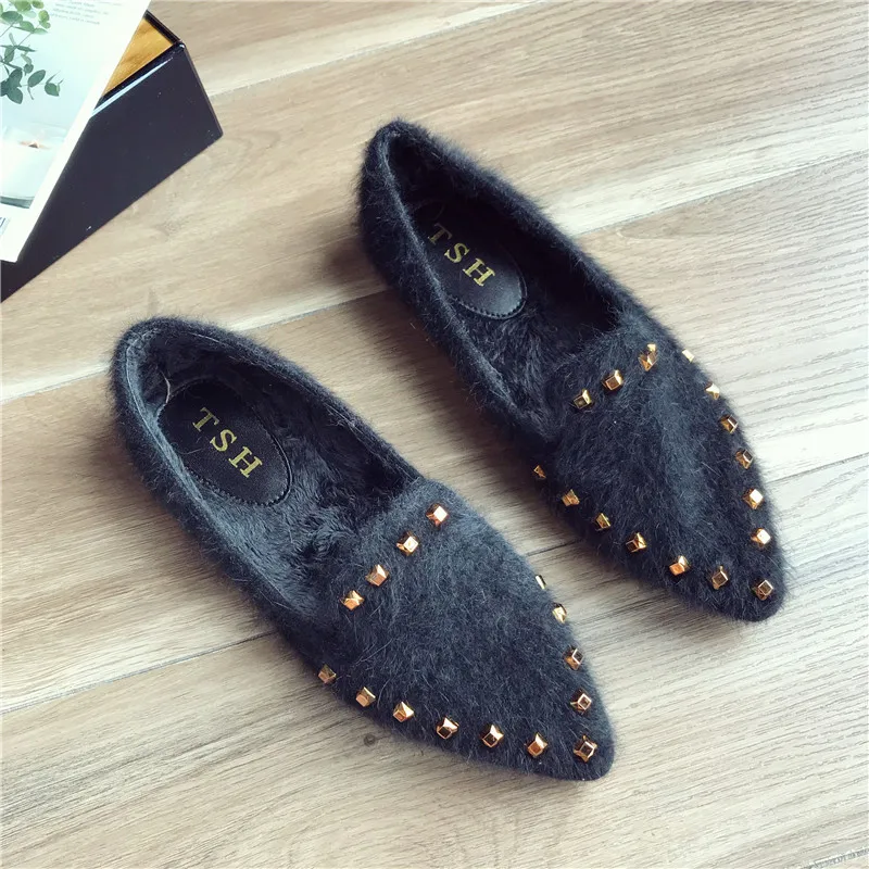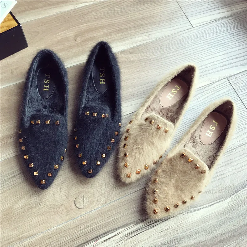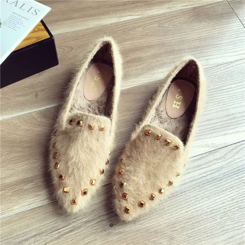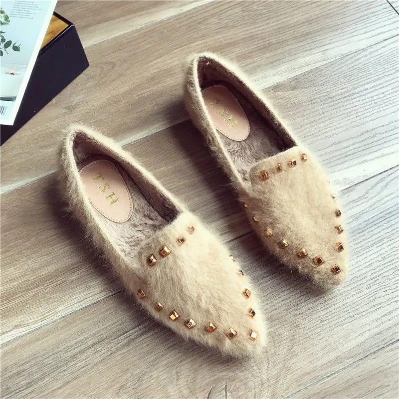 Metal Rivets ladies pointy toe shoes winter warm fur loafers apricot/black plush soft sole flats cozy slip on pregnant moccasins