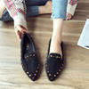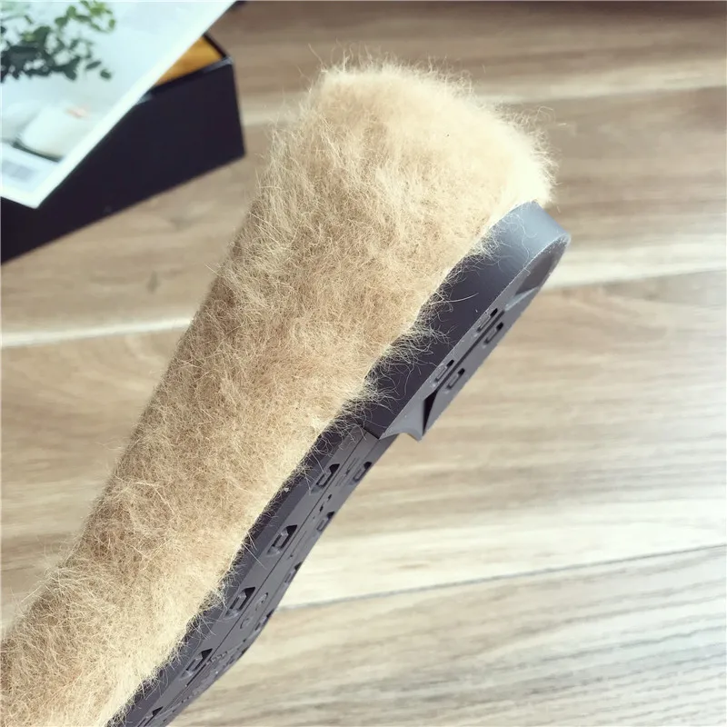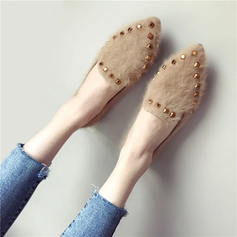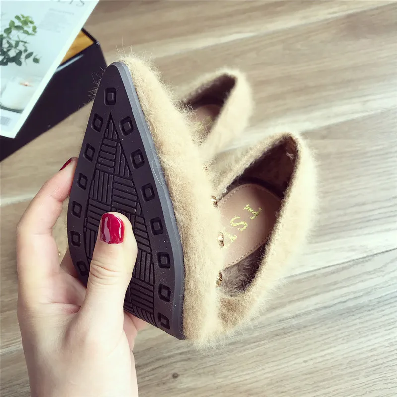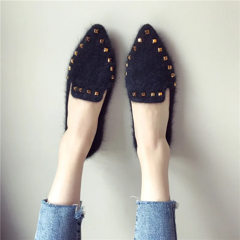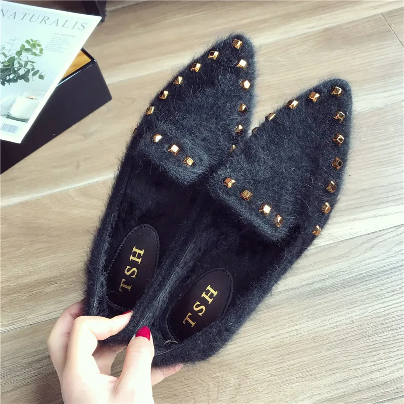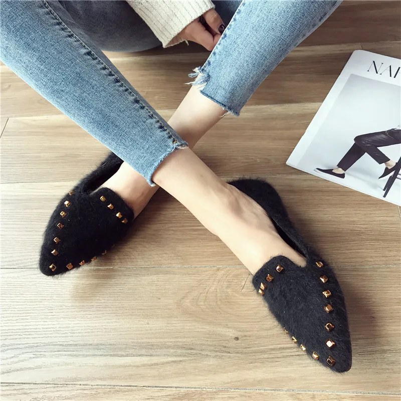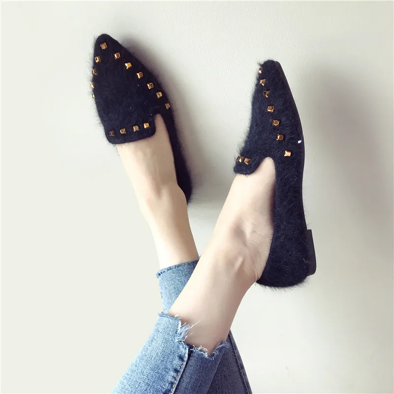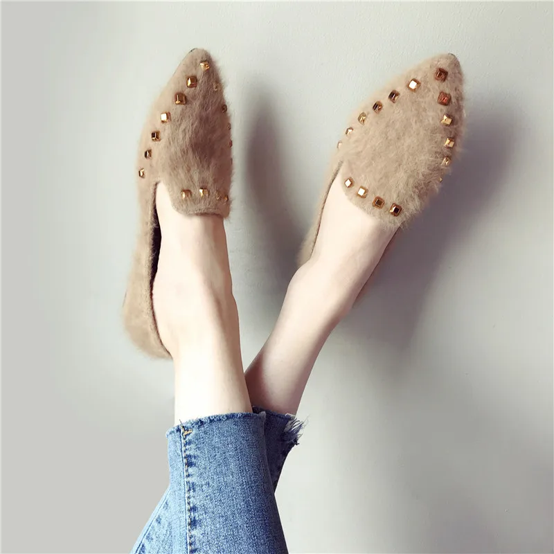 Metal Rivets ladies pointy toe shoes winter warm fur loafers apricot/black plush soft sole flats cozy slip on pregnant moccasins