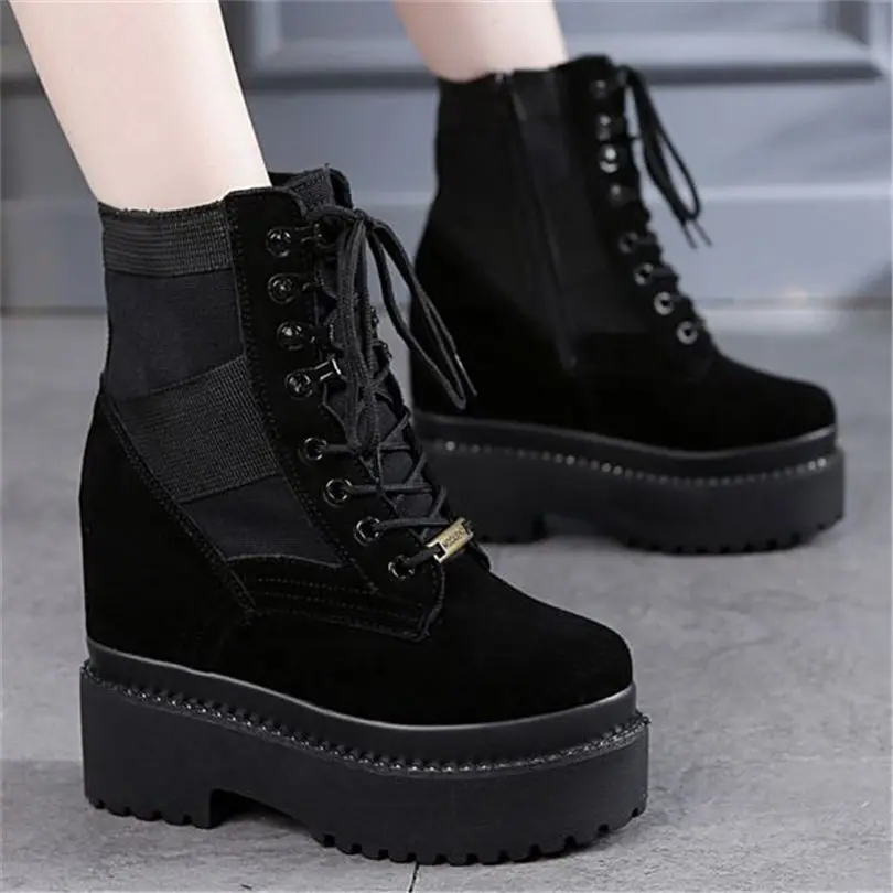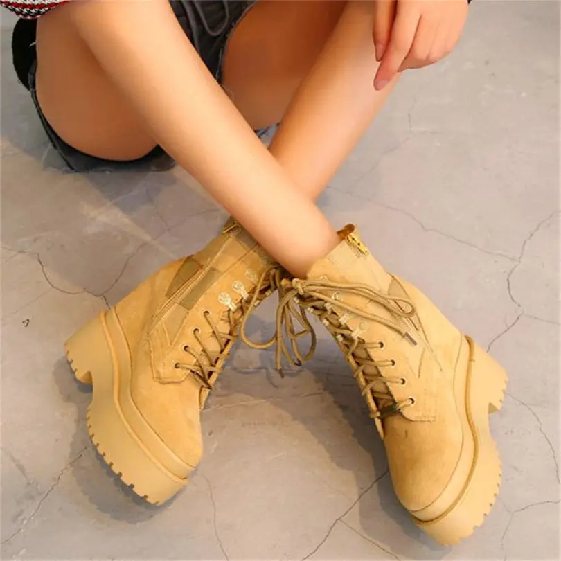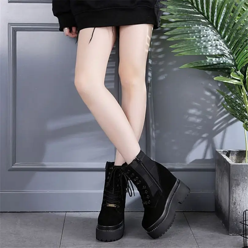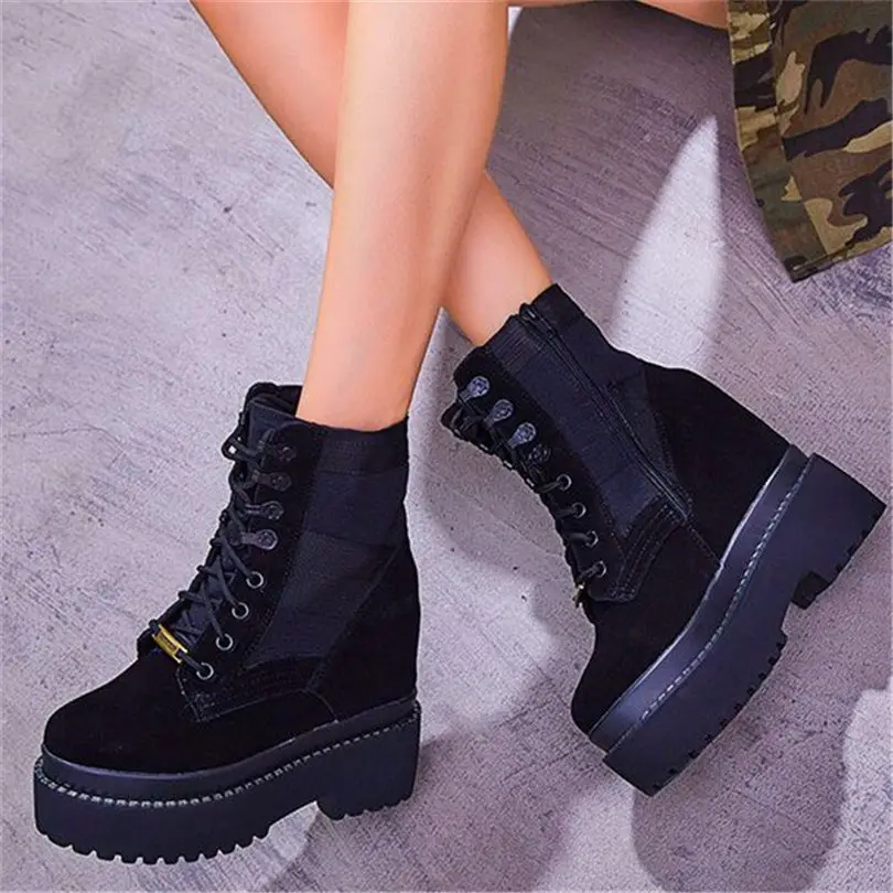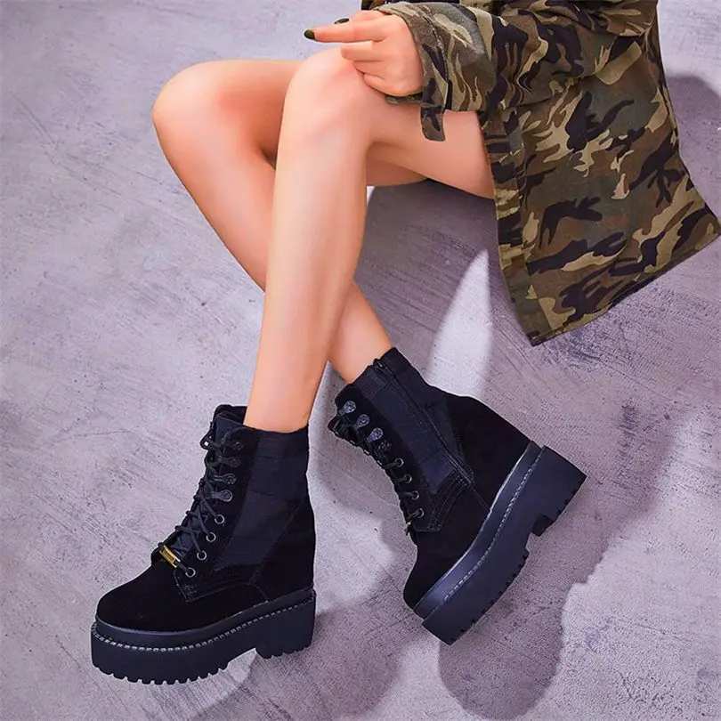 Military Women Suede Leather Ankle Boots Platform Wedge High Heel Buckle Lace Up Combat Oxfords Creepers Punk Goth Casual Party