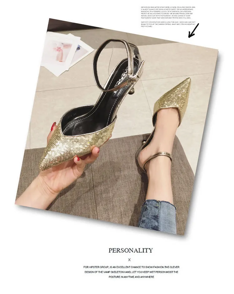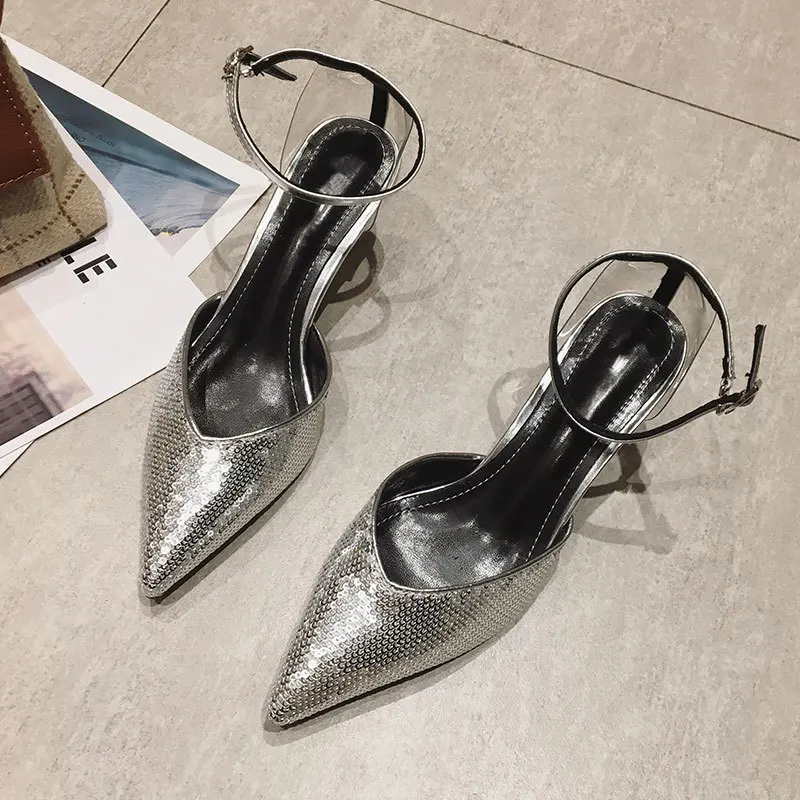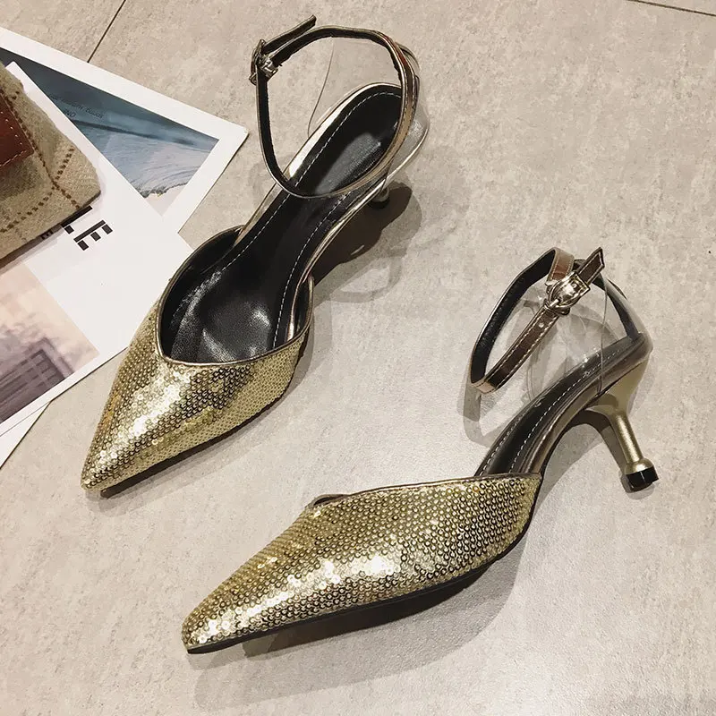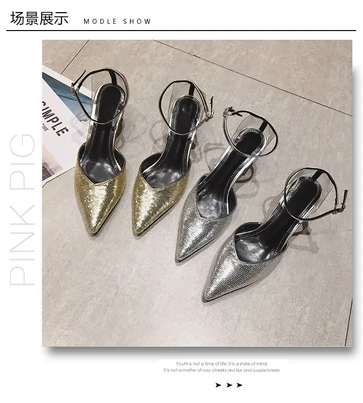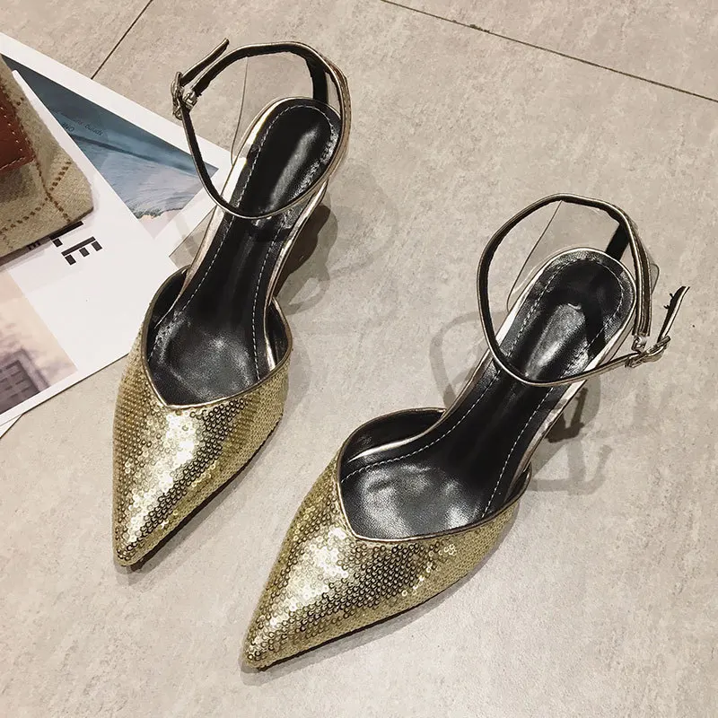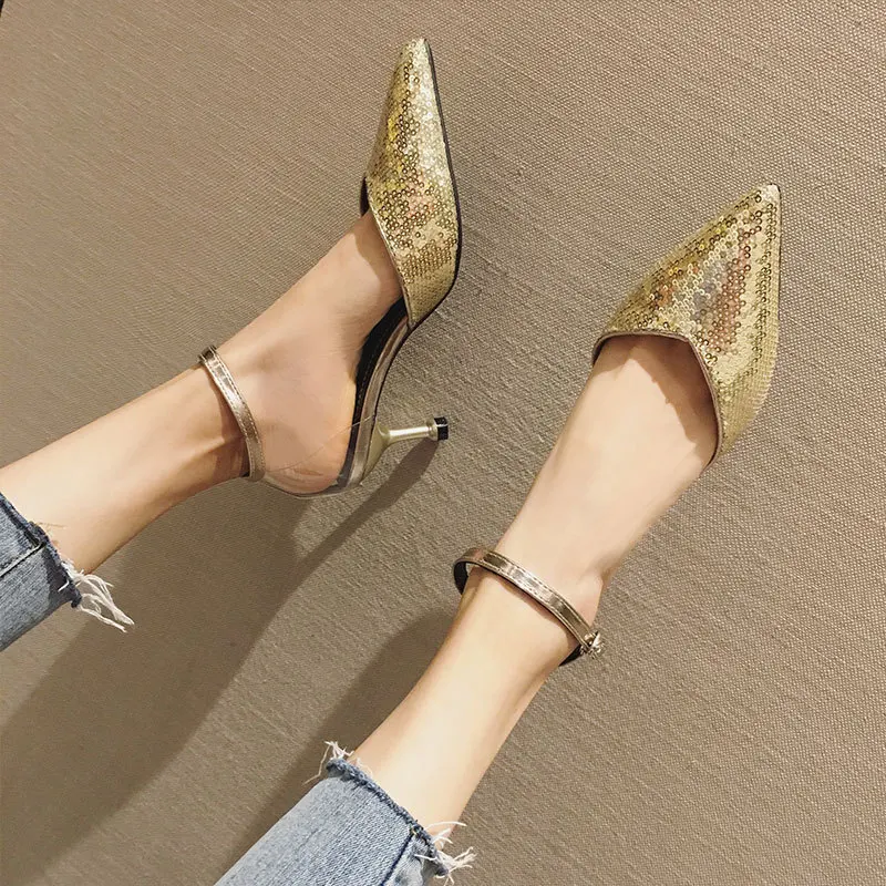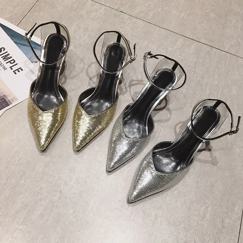 mules gold/silver glitter high heels sandals women transparent cover heel sandalias ladies bling party shoes cutout sandalen