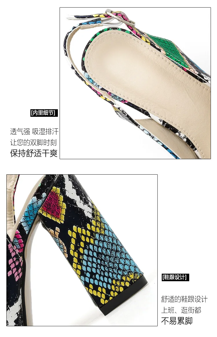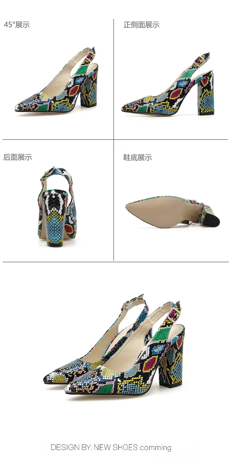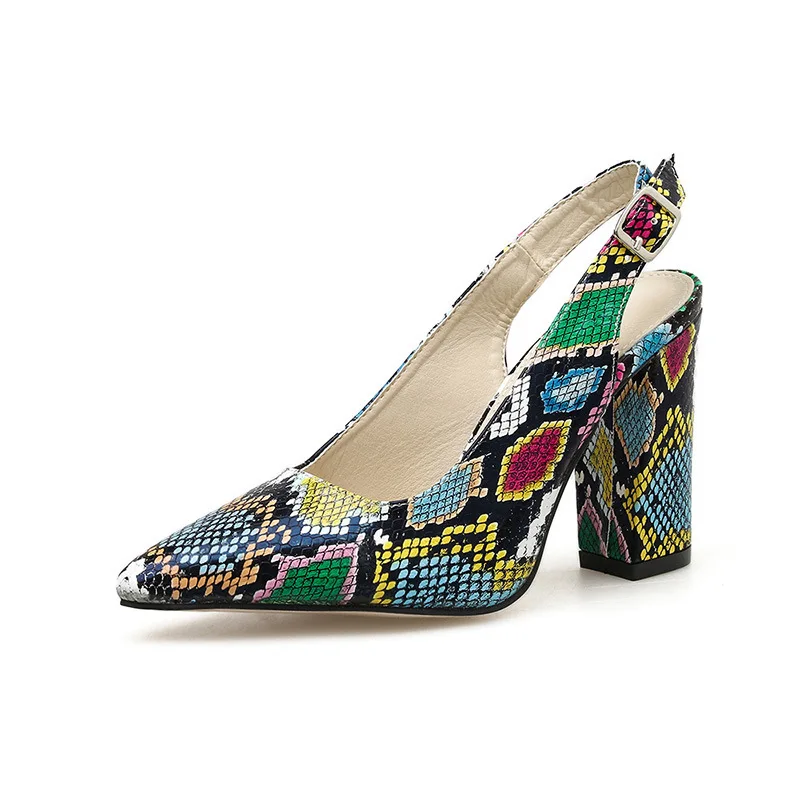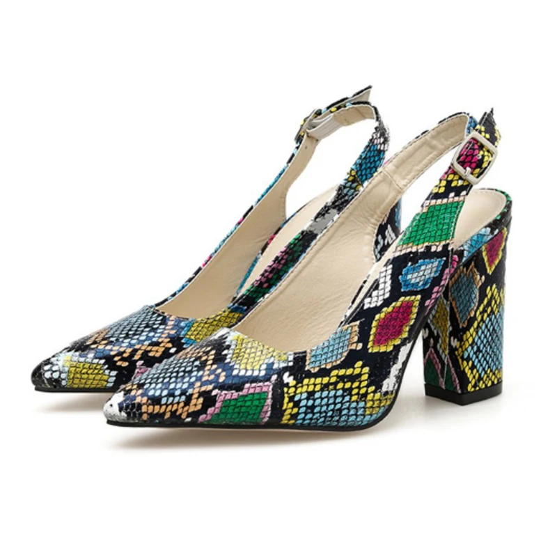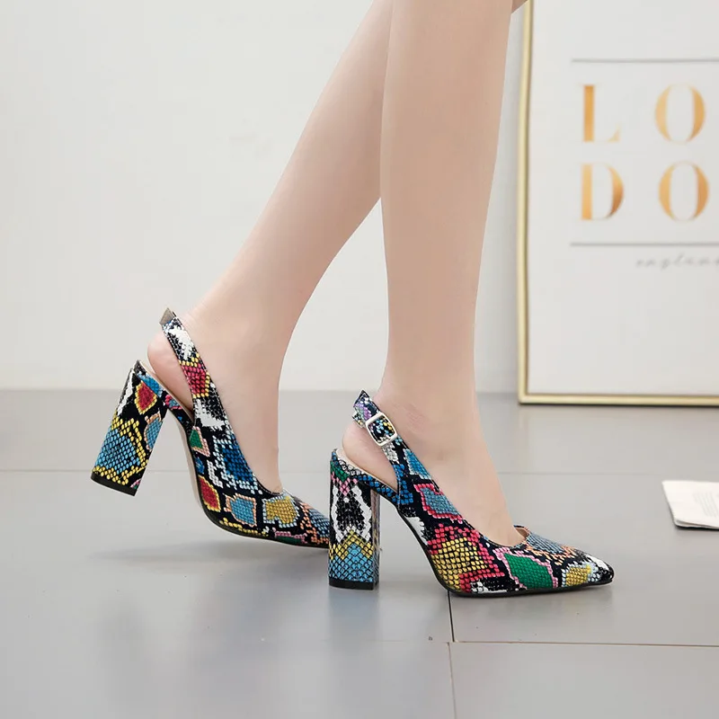 Multicolor Snake pattern pumps woman sandals belt buckle serpentine talons hauts pointed toe thick high heels shoes women 2021