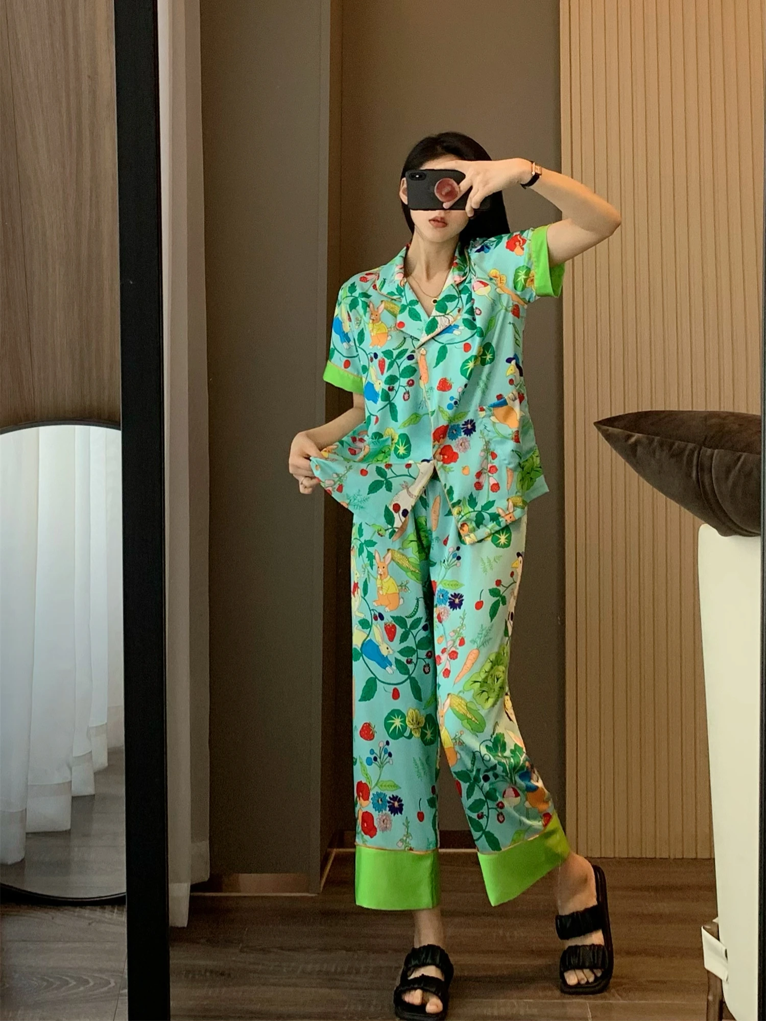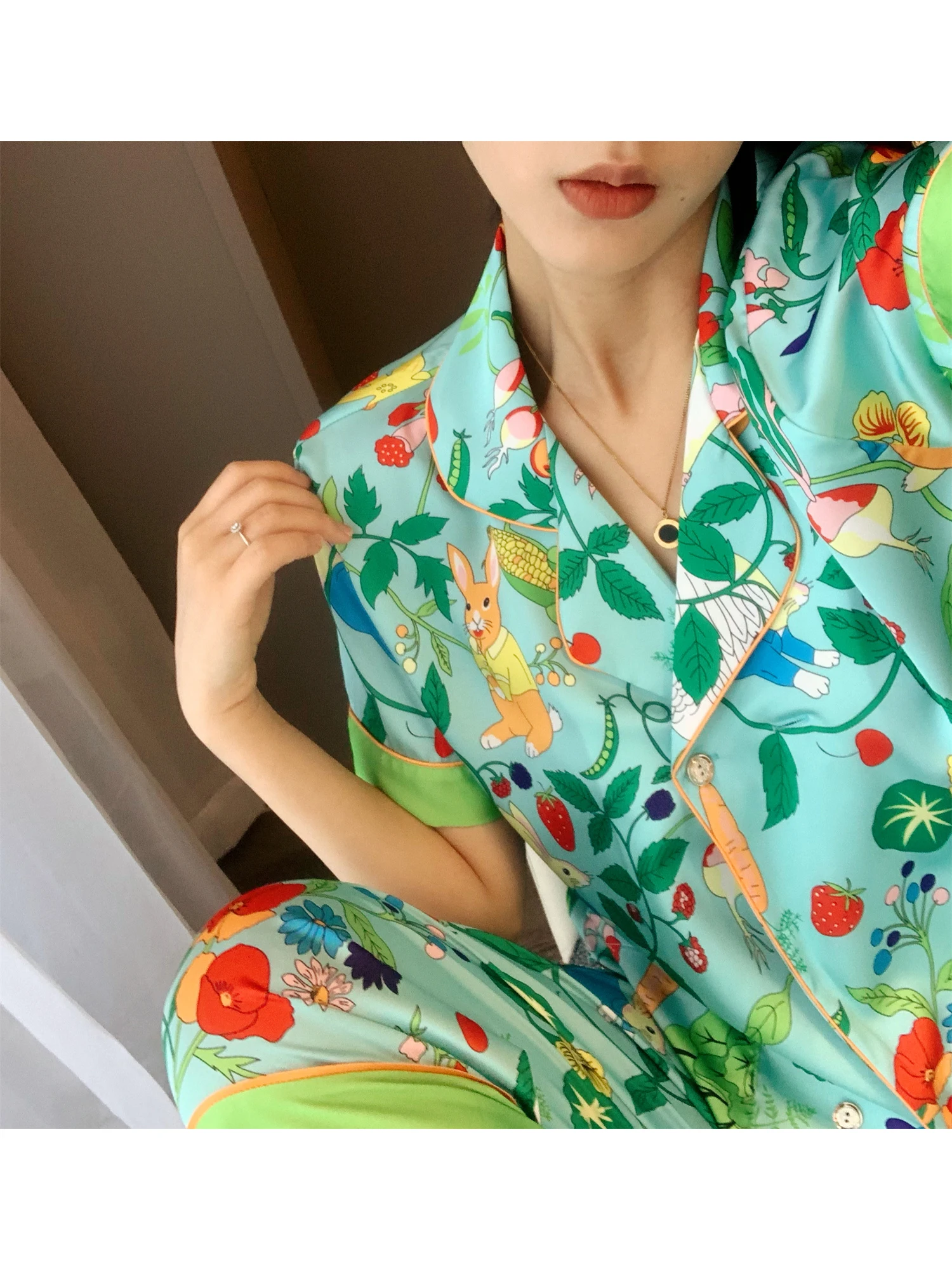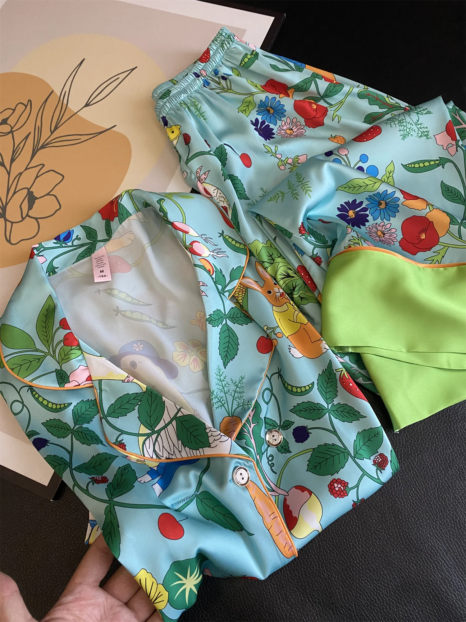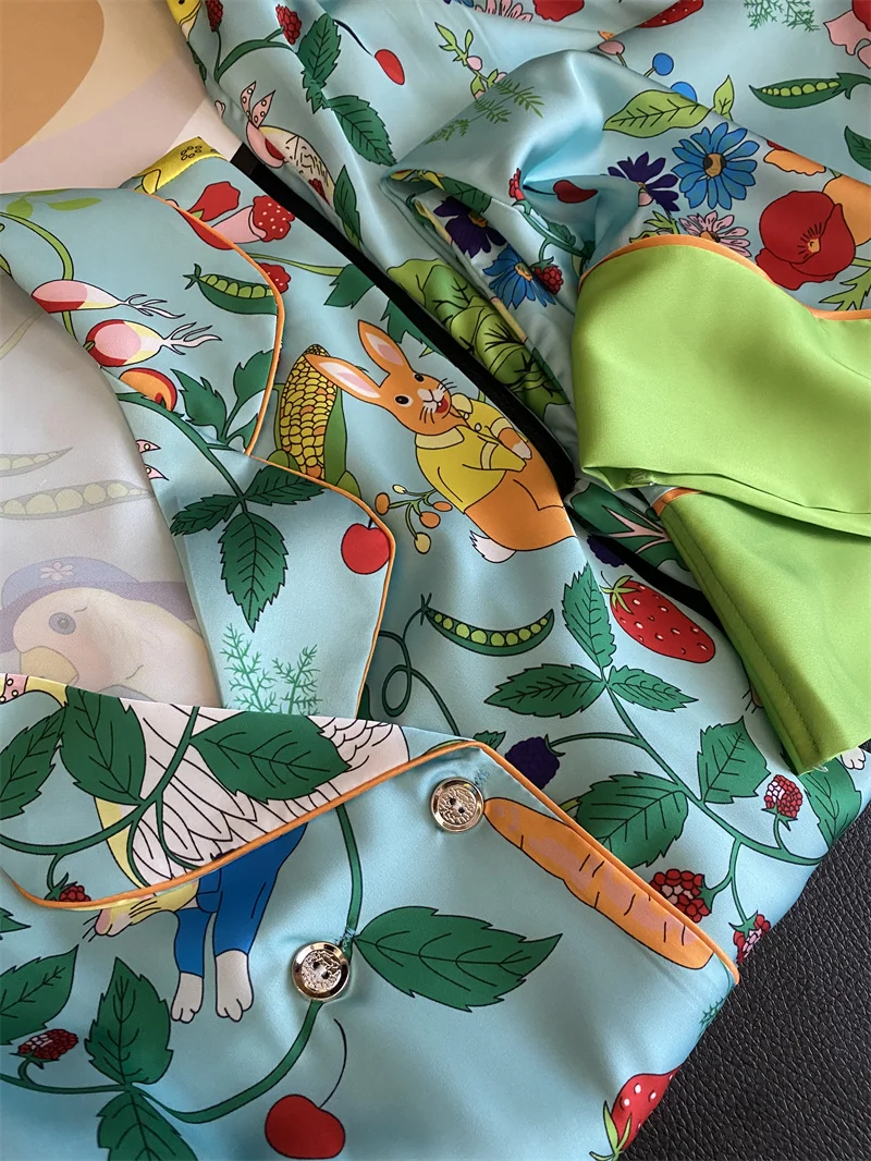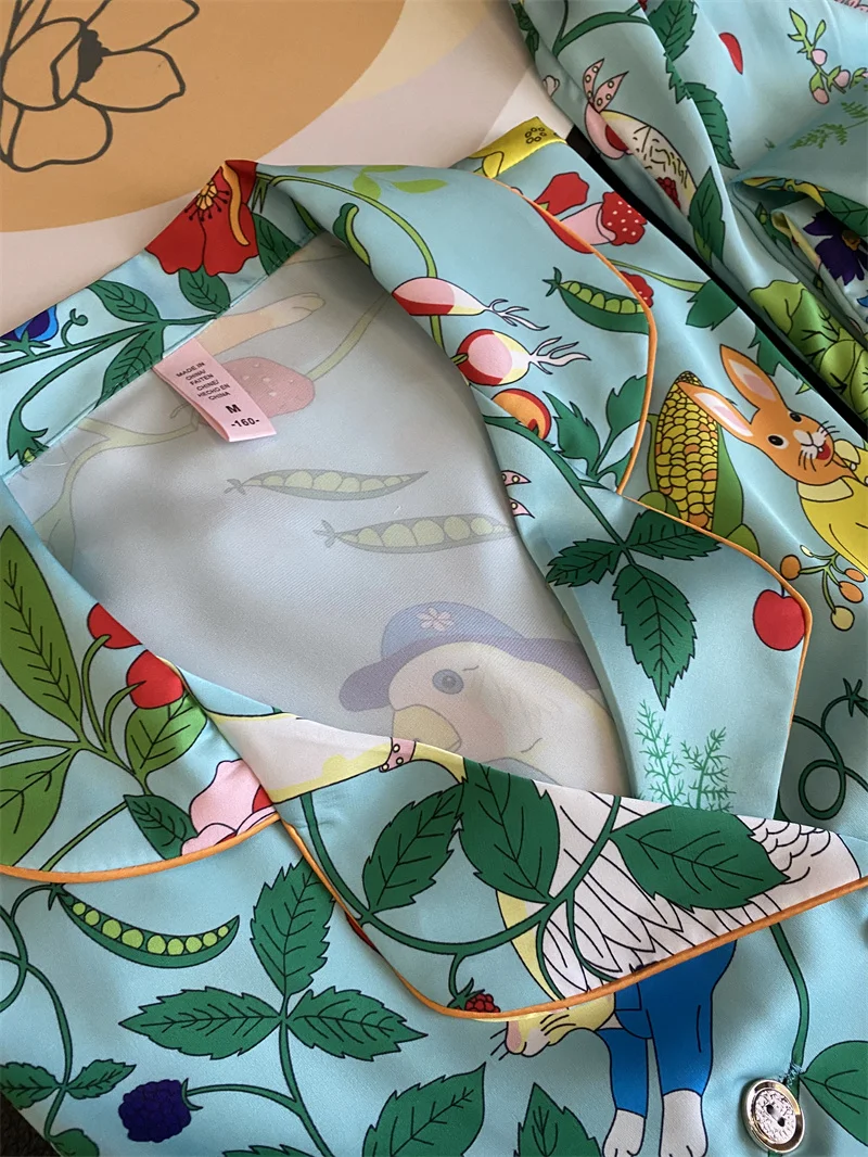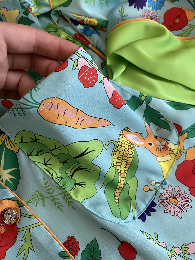 Multicolored Garden Satin Pajama Set Fancy Girls Rabbit Vege Carrot Pattern Short Sleeve Elastic Waist Wide-Leg Pants Loungewear