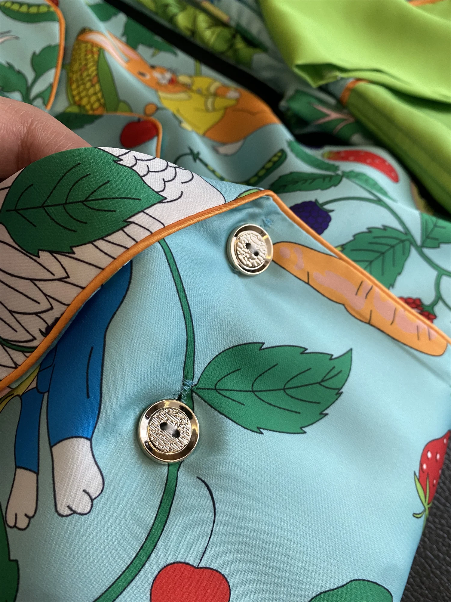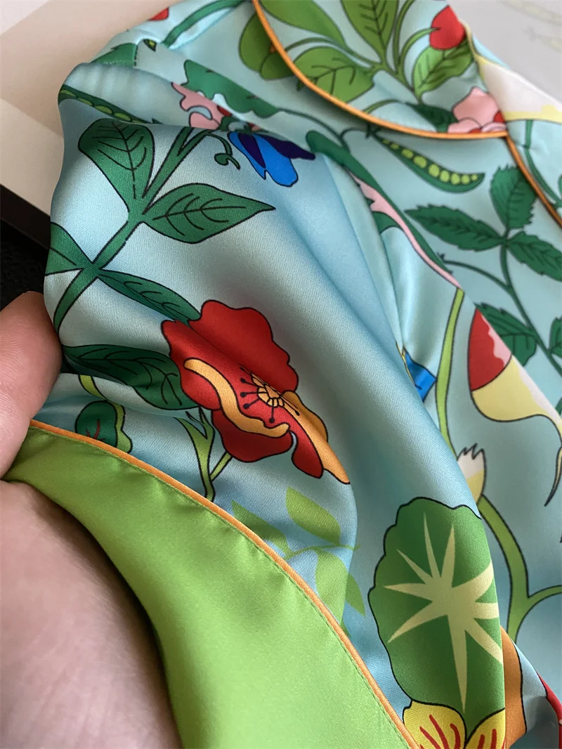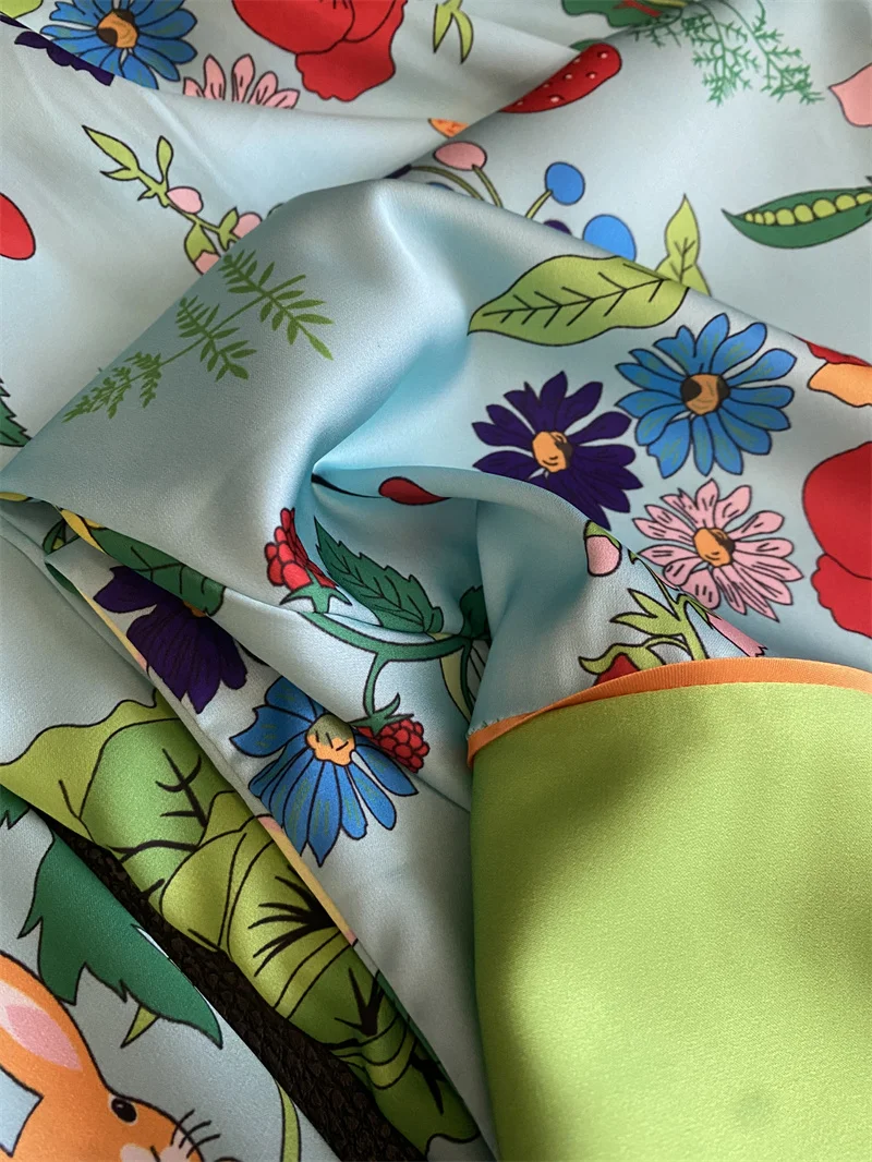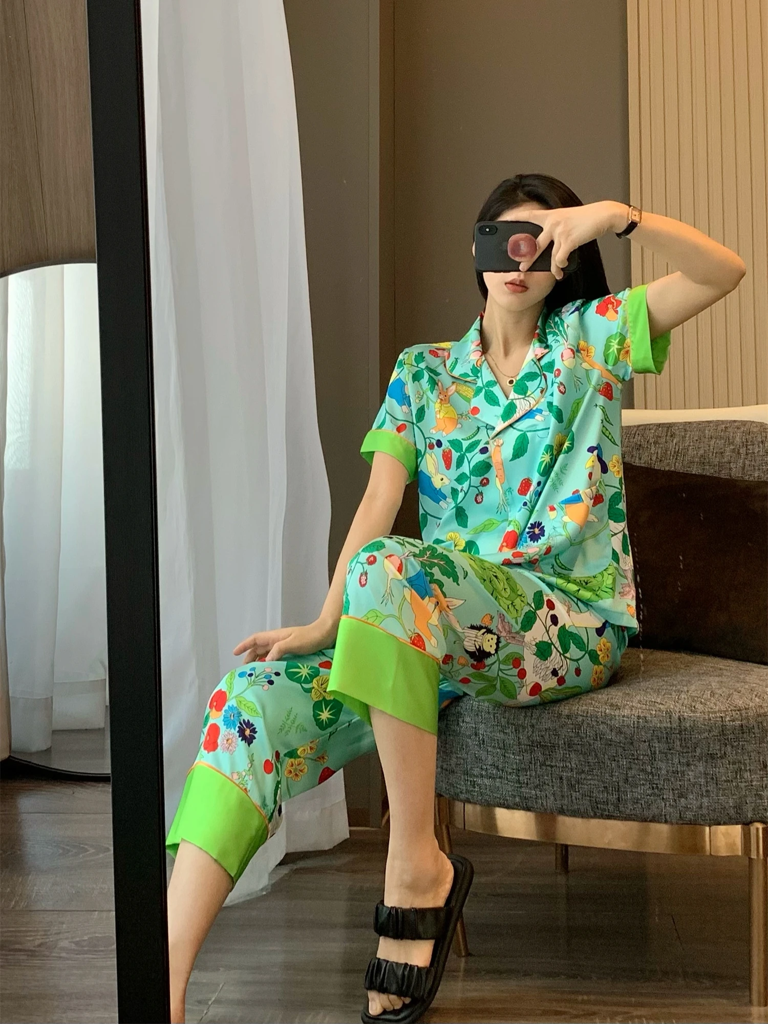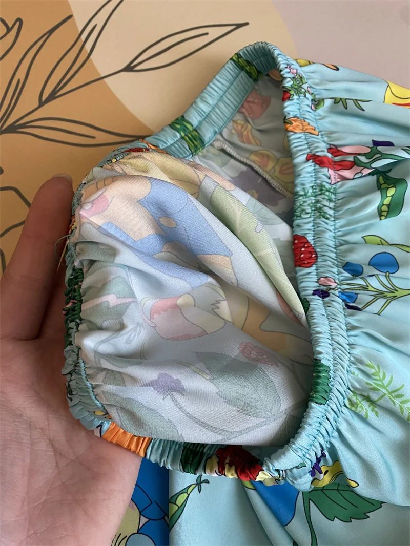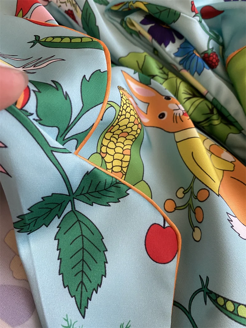 Multicolored Garden Satin Pajama Set Fancy Girls Rabbit Vege Carrot Pattern Short Sleeve Elastic Waist Wide-Leg Pants Loungewear