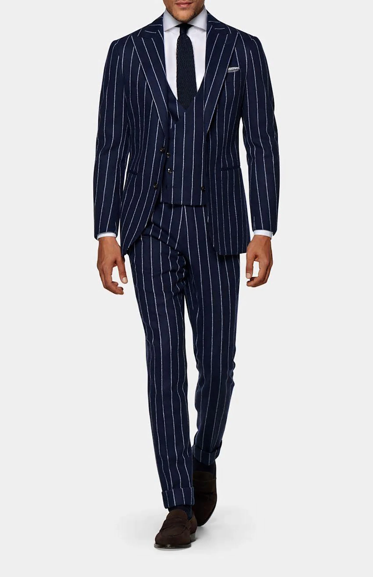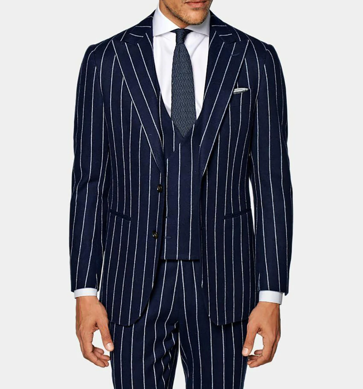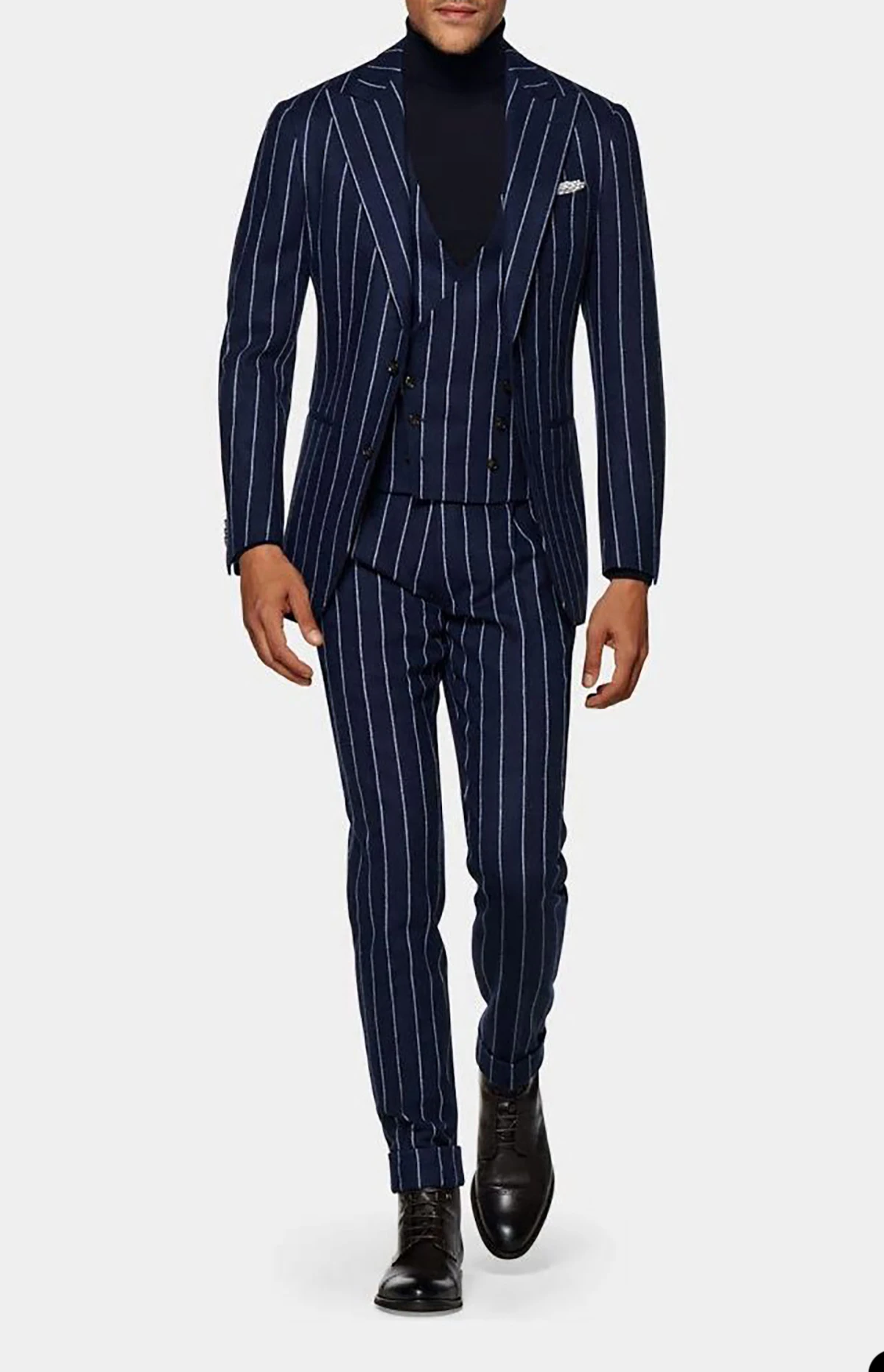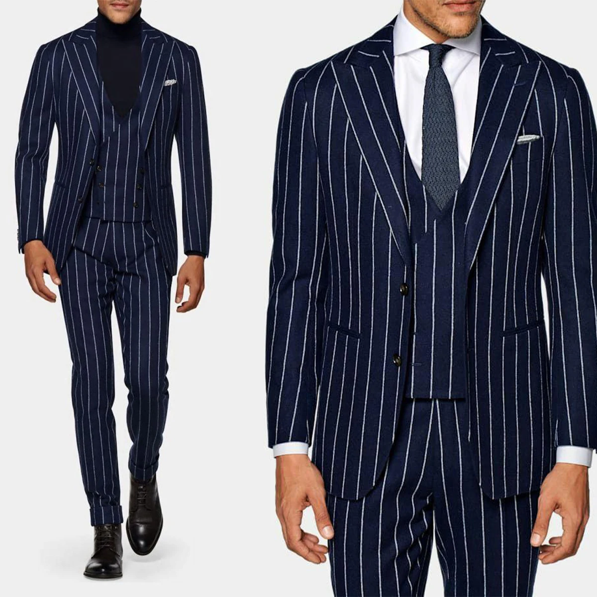 Navy Blue Men Suits 3 Pieces Blazer Vest Pants Single Breasted Business Peaked Lapel Pinstripes Wedding Groom Tailored Plus Size