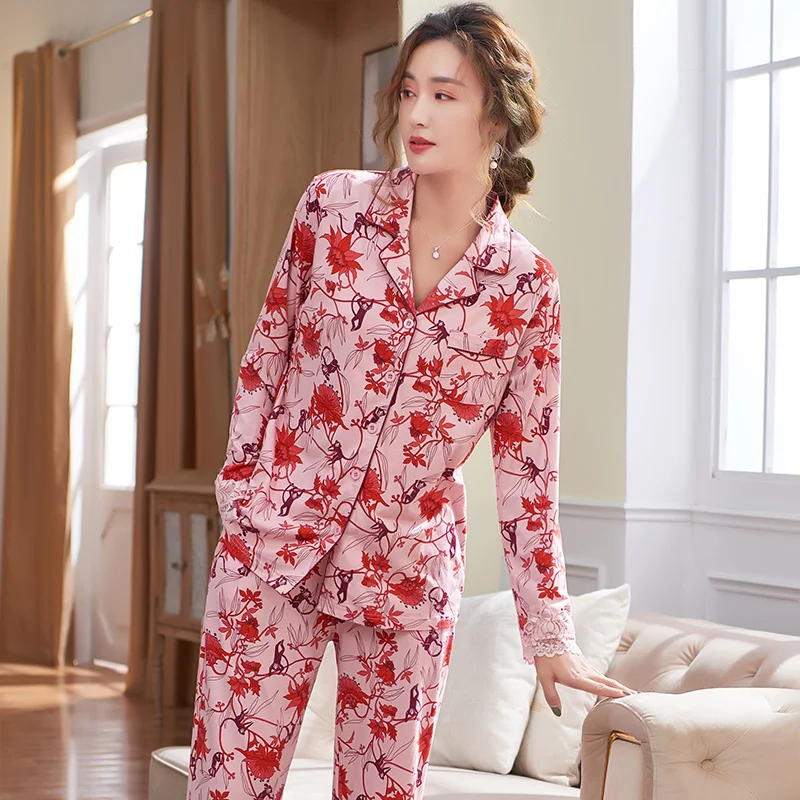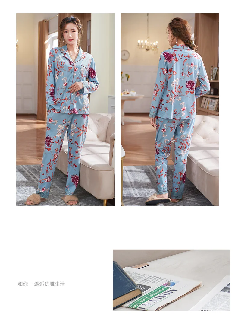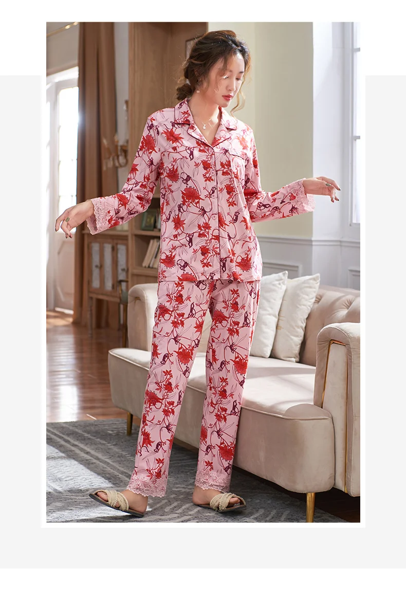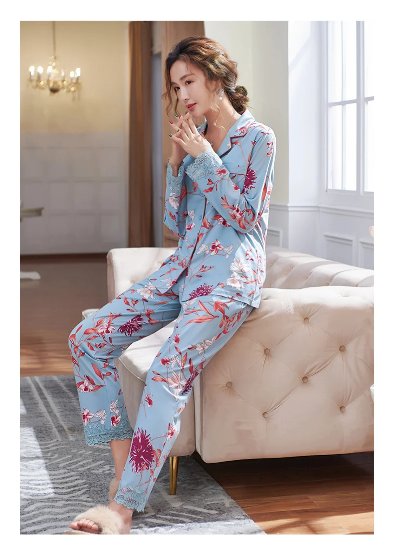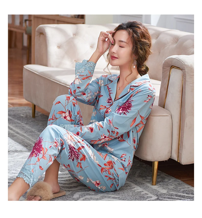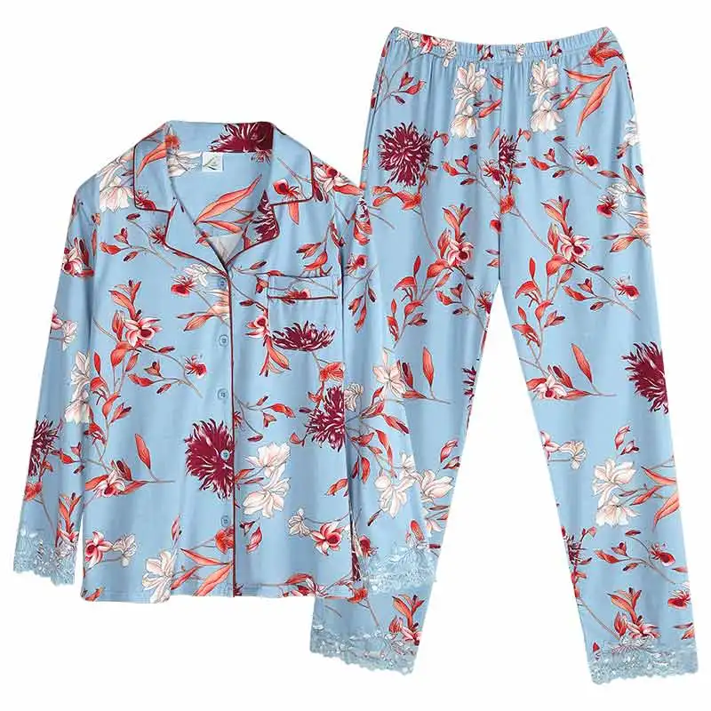 New Autumn Pyjamas Women Lace Pajama Sets Lovely Floral Print Sleepwear For Women M-XXXL Modal Cotton Pijamas Mujer