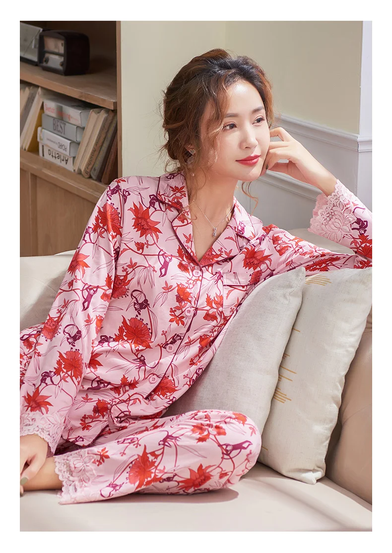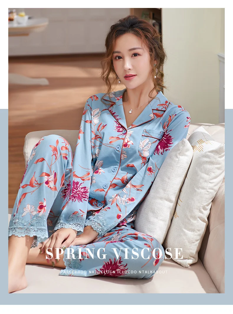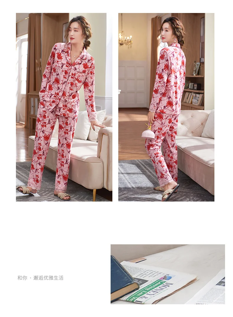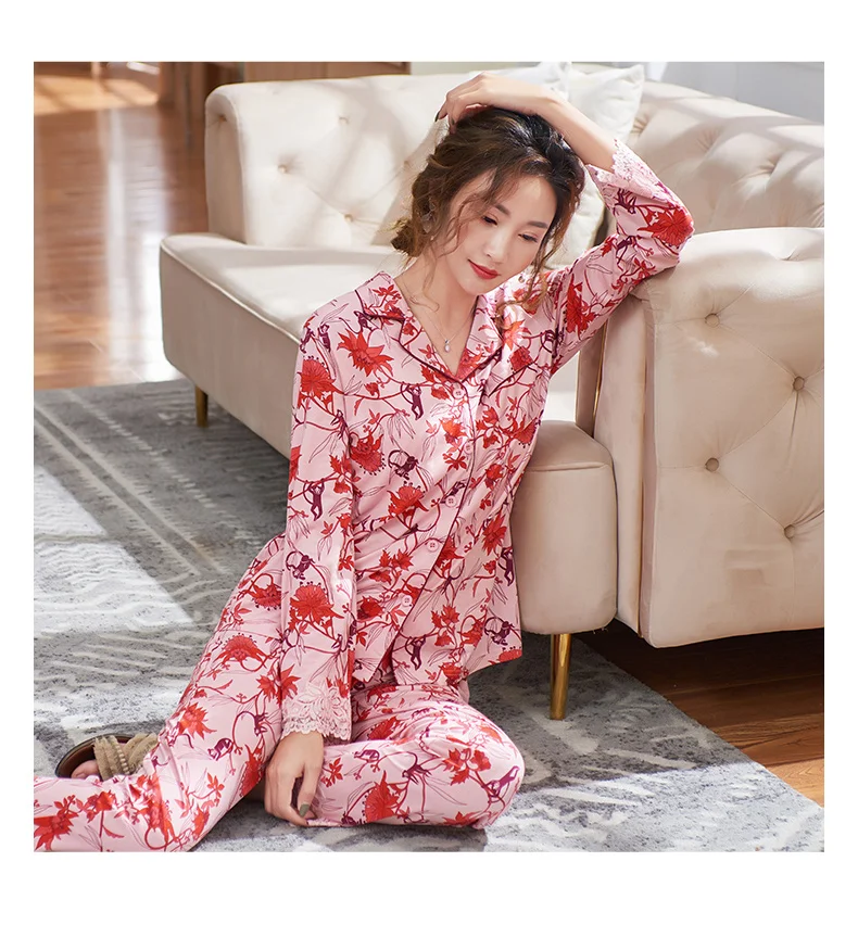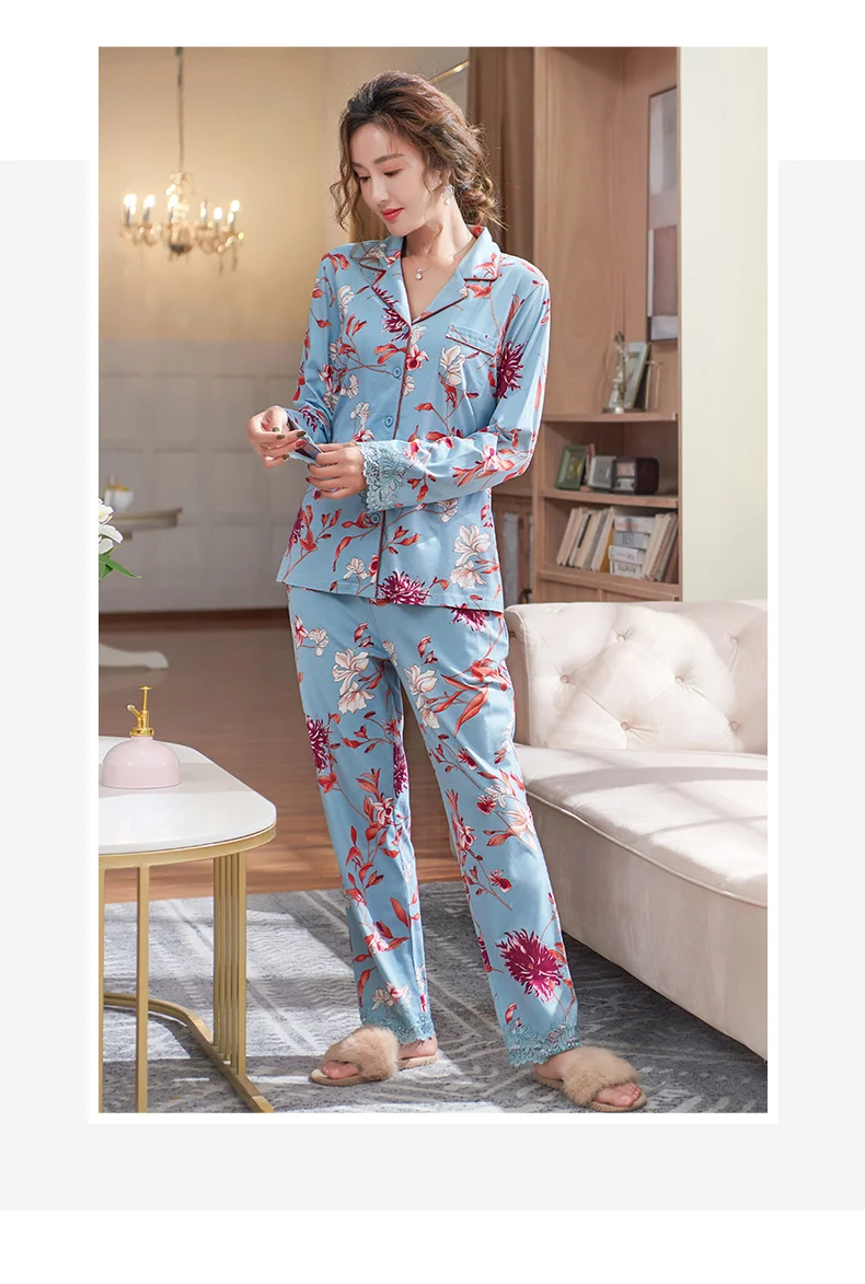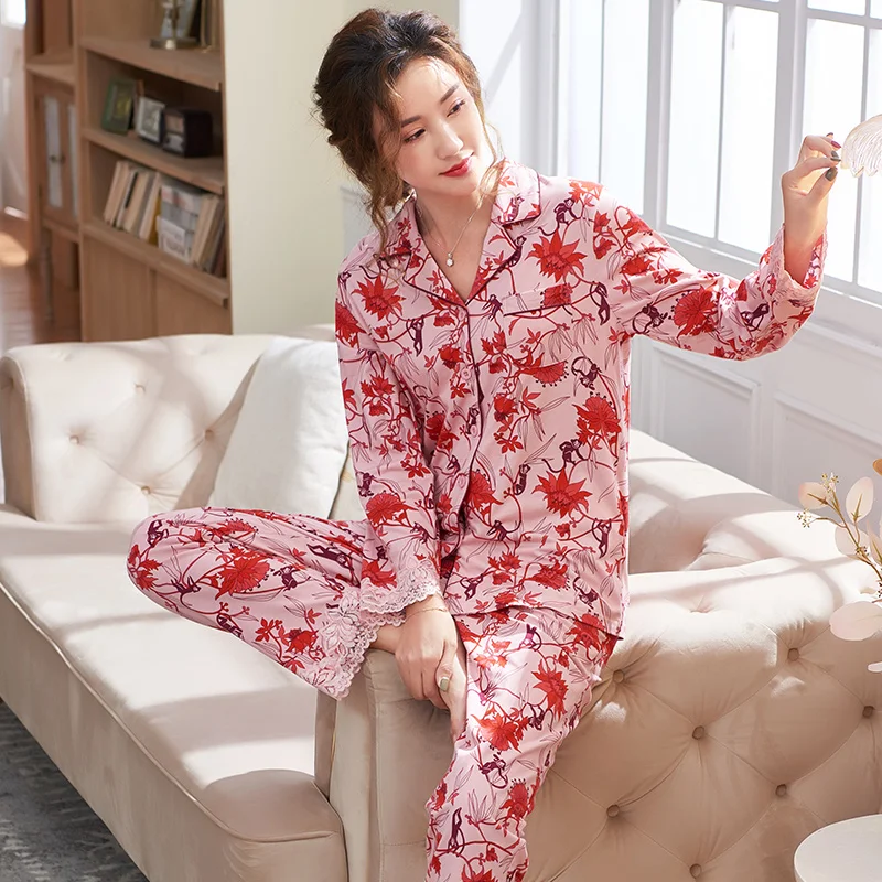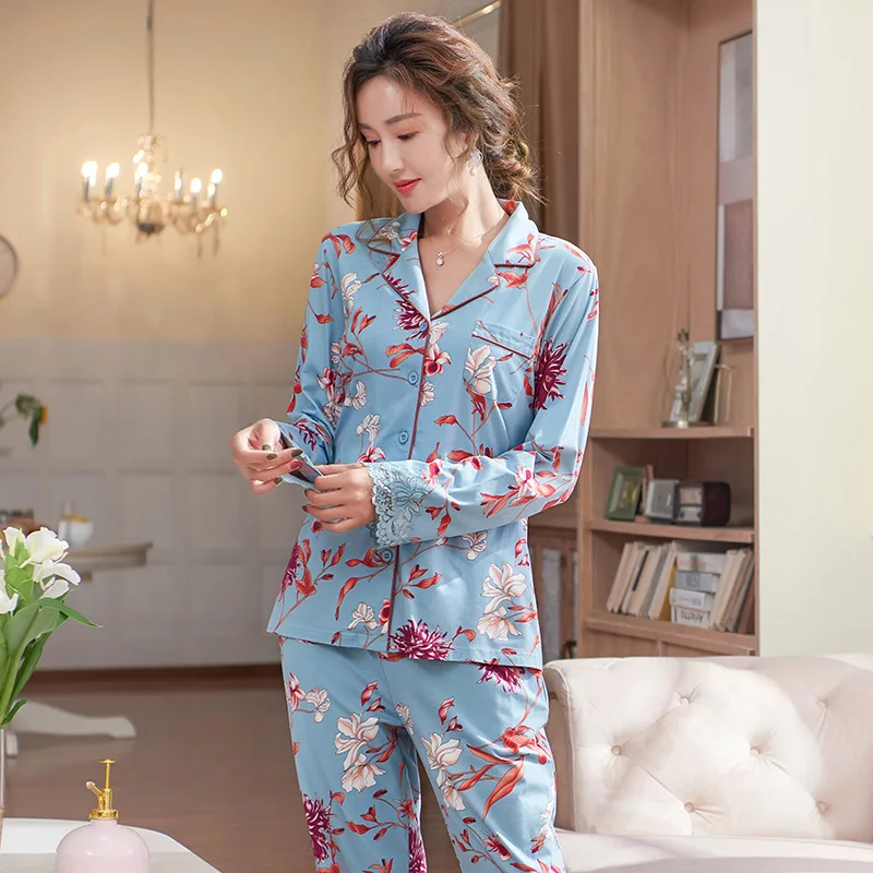 New Autumn Pyjamas Women Lace Pajama Sets Lovely Floral Print Sleepwear For Women M-XXXL Modal Cotton Pijamas Mujer