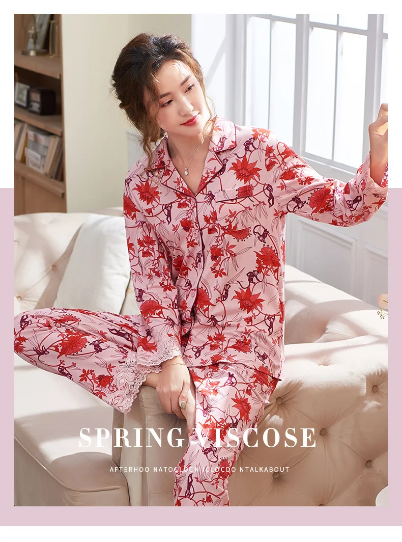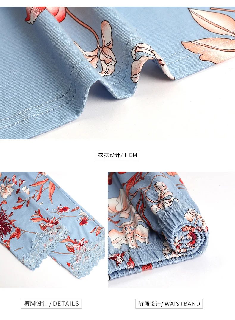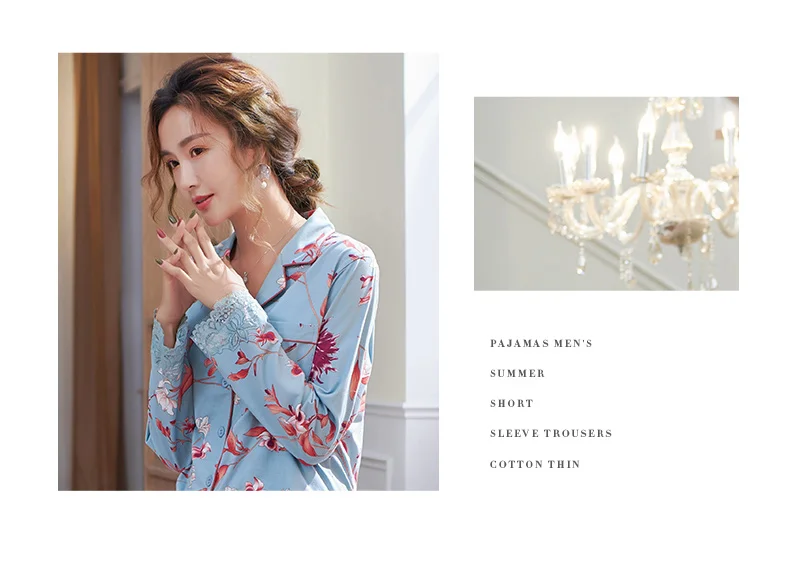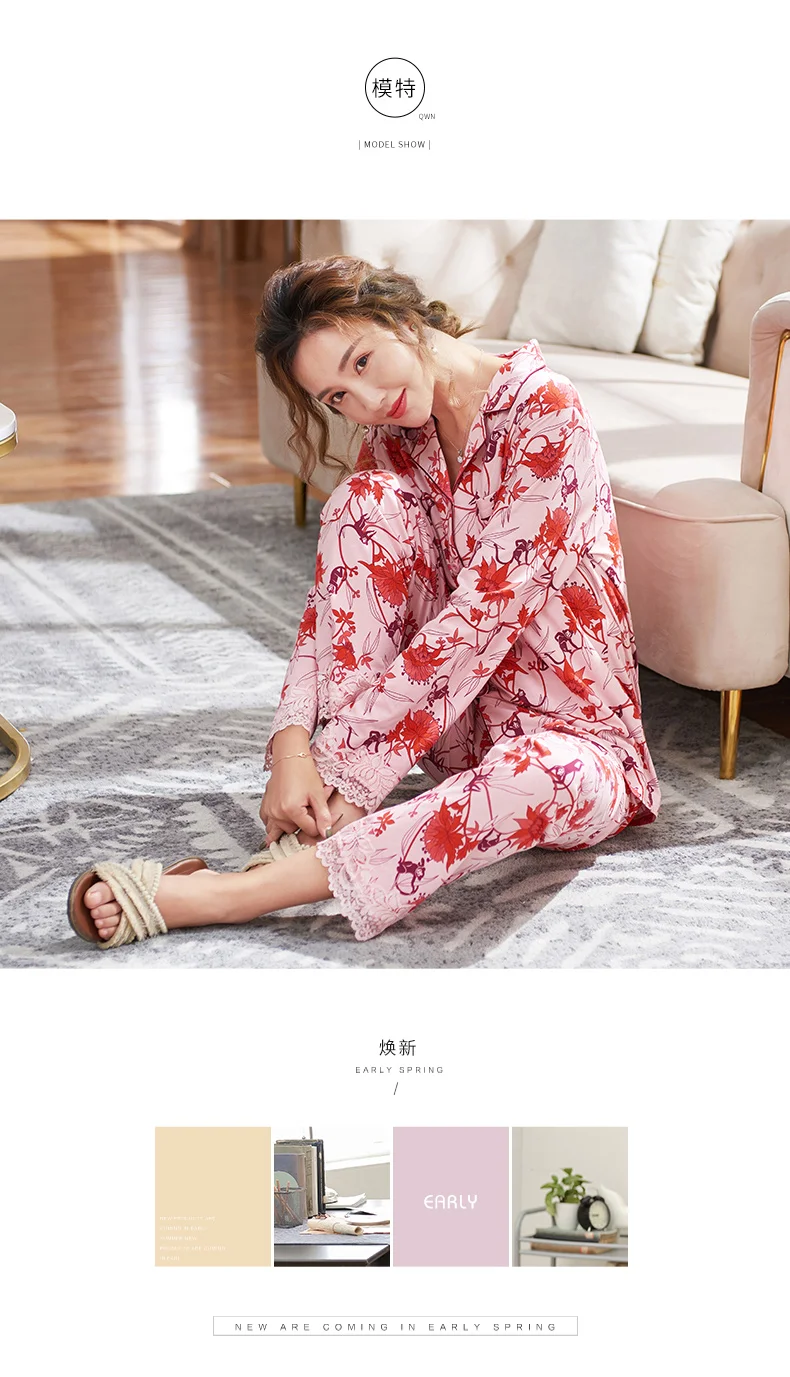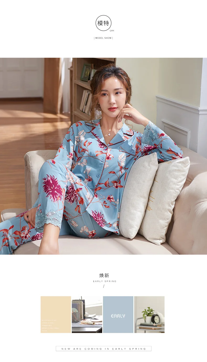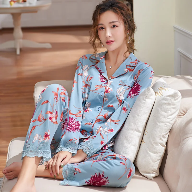 New Autumn Pyjamas Women Lace Pajama Sets Lovely Floral Print Sleepwear For Women M-XXXL Modal Cotton Pijamas Mujer