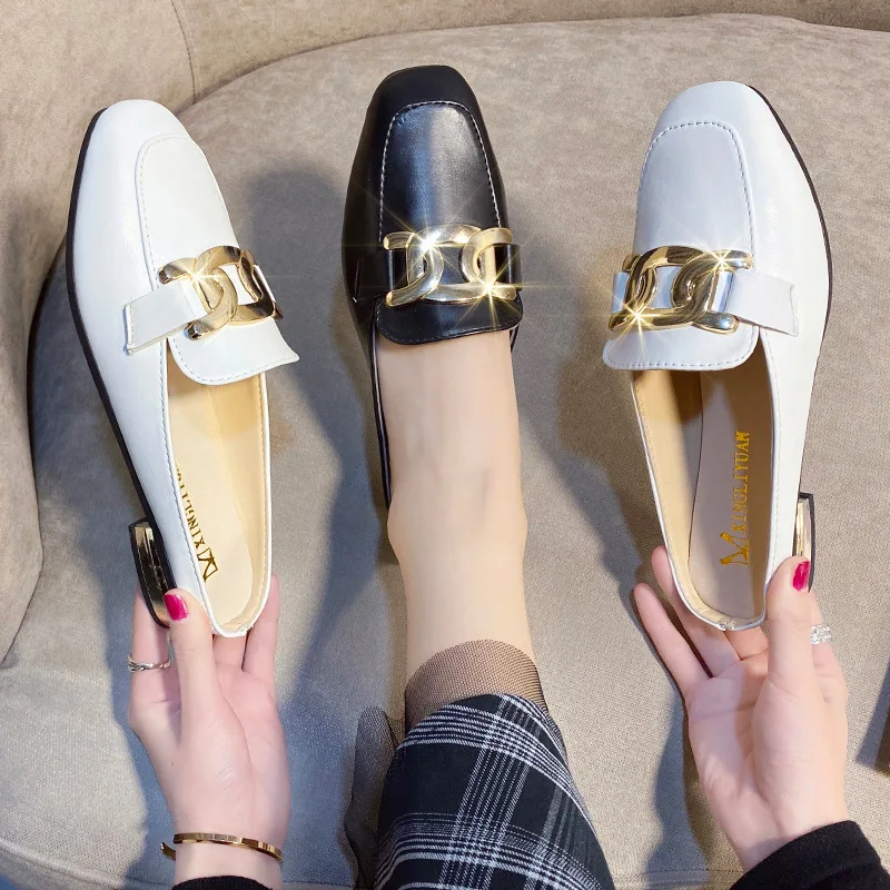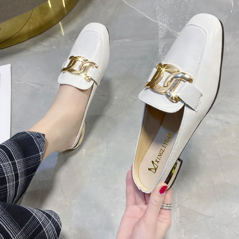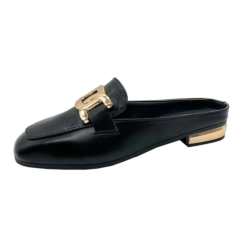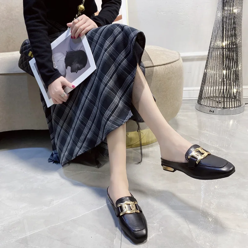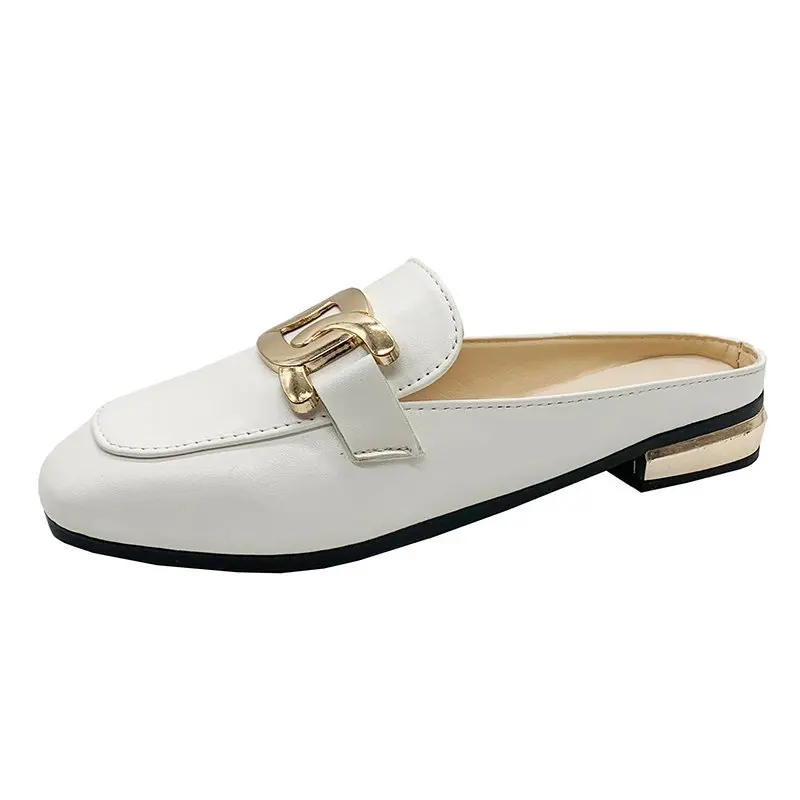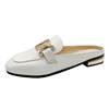 New Design Gold Chain Women Slipper Closed Toe Slip On Mules Shoes Round Toe Low Heels Casual Slides Flip Flop