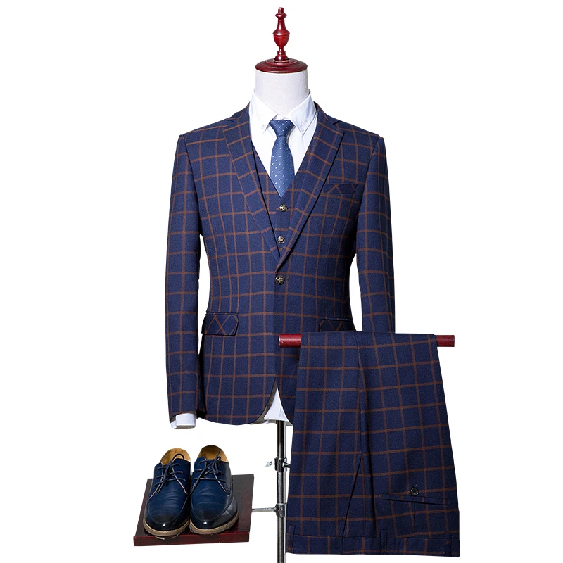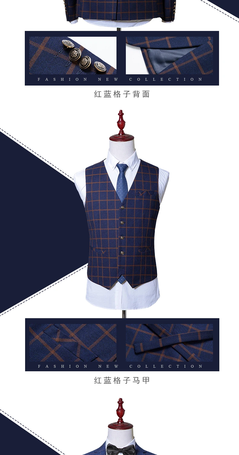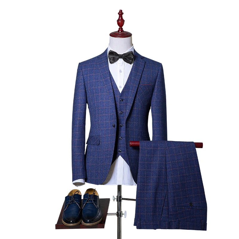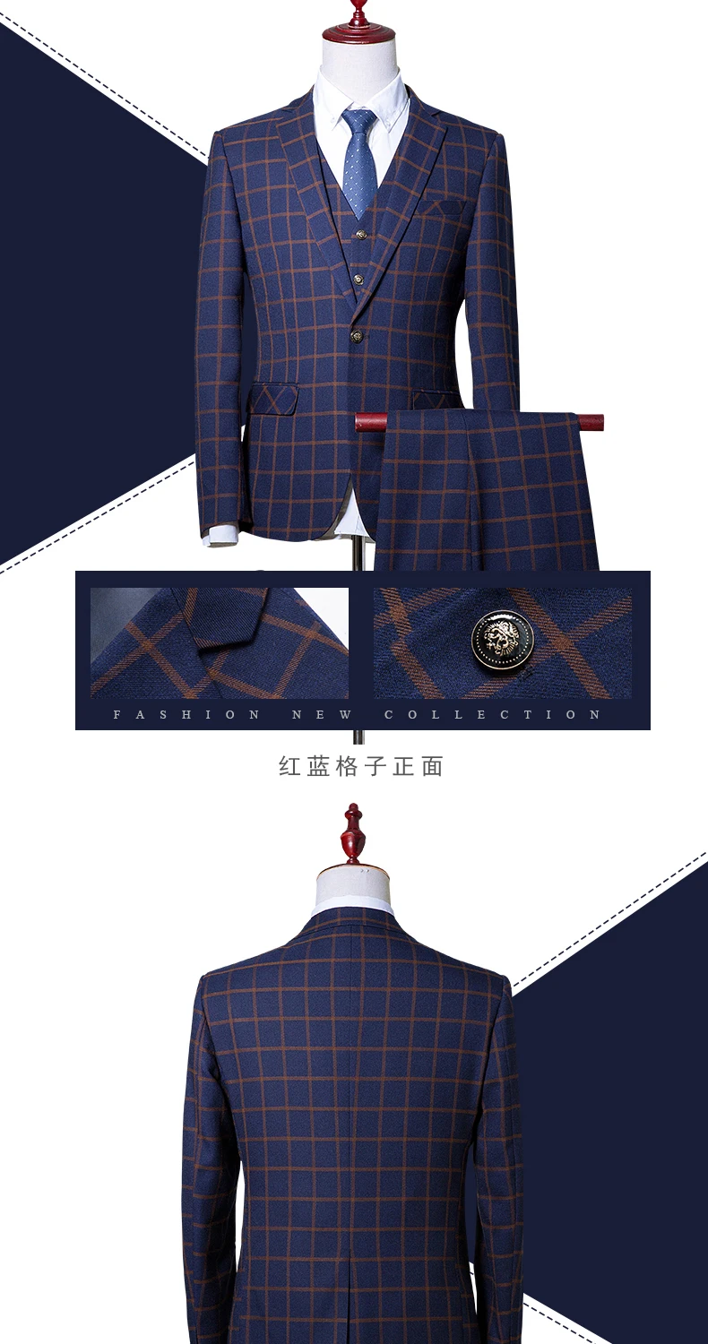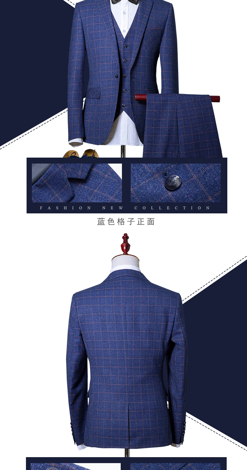new men’s Business Formal Wear three-piece suit Korean Slim Men’s plaid leisure suits wedding (jackets+vest+pants)