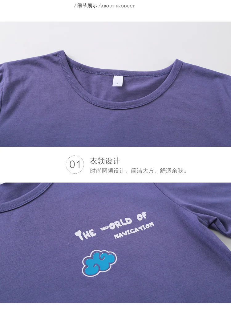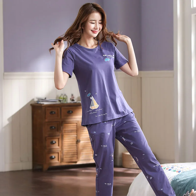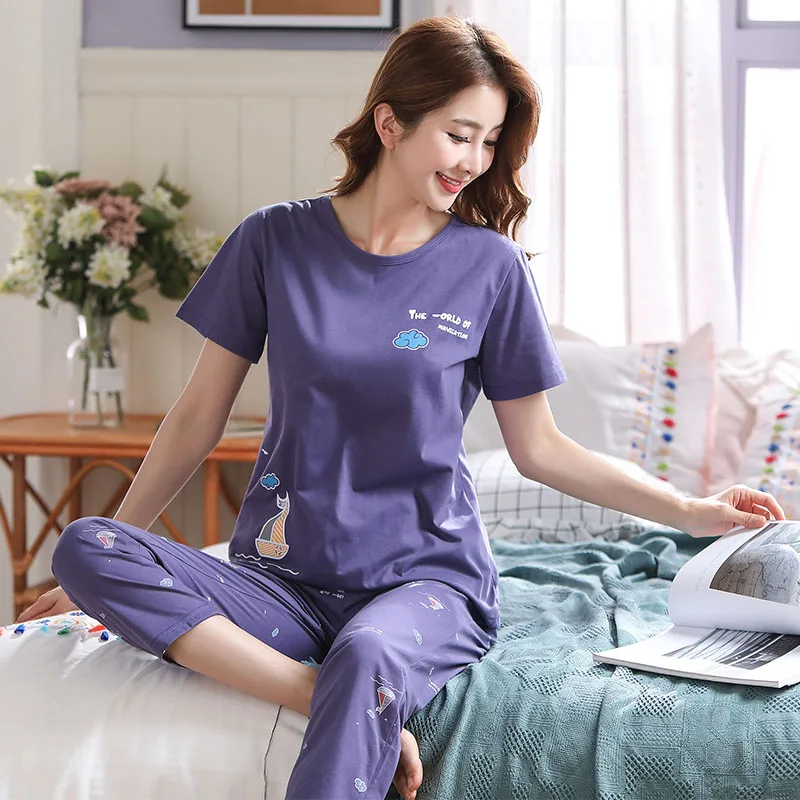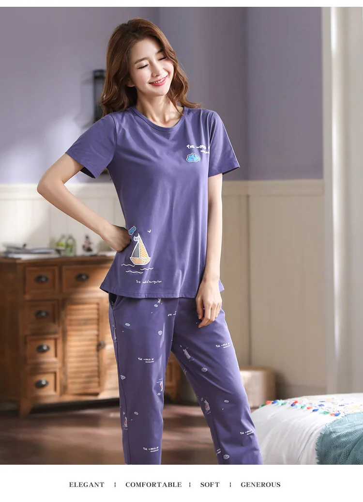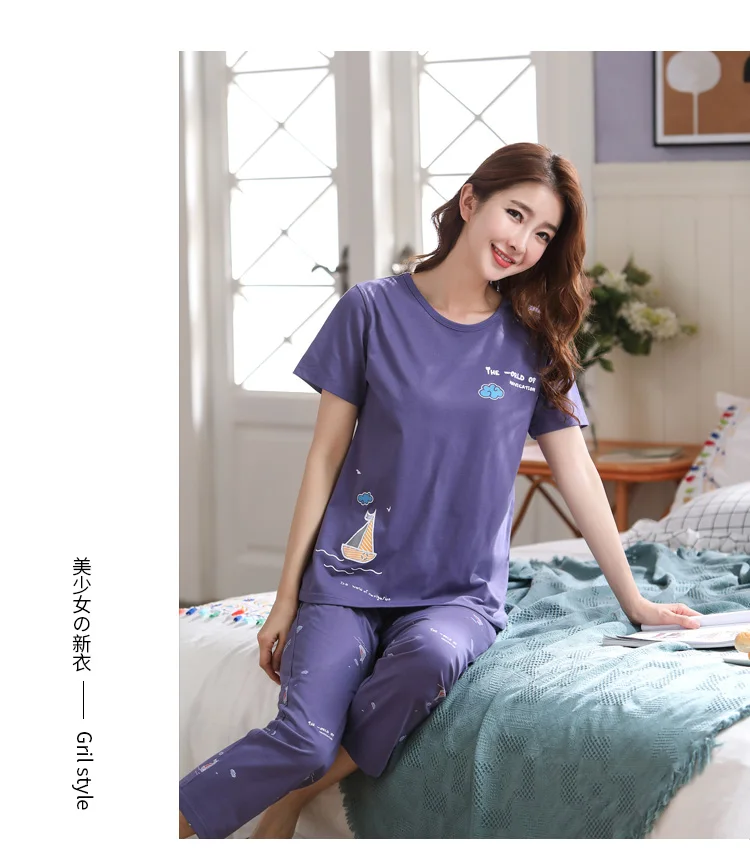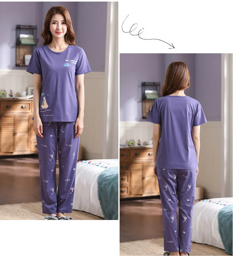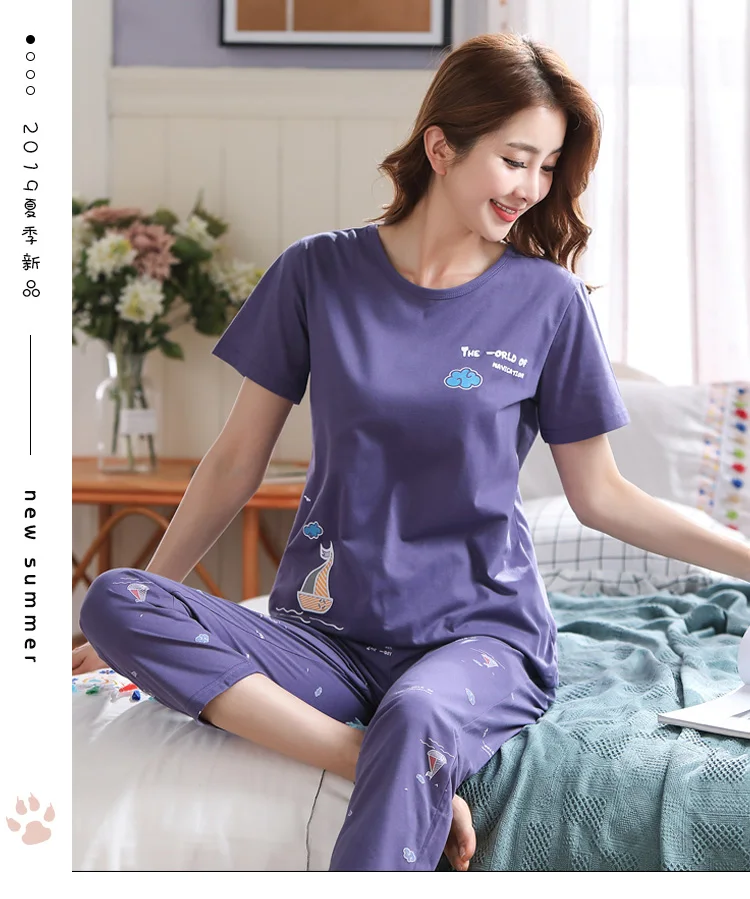 New Summer Pyjamas Women Cotton Cartoon Pajamas Set Short Tops+Long Pants Sleepwear Loose Soft M-5XL Ladies Nightwear