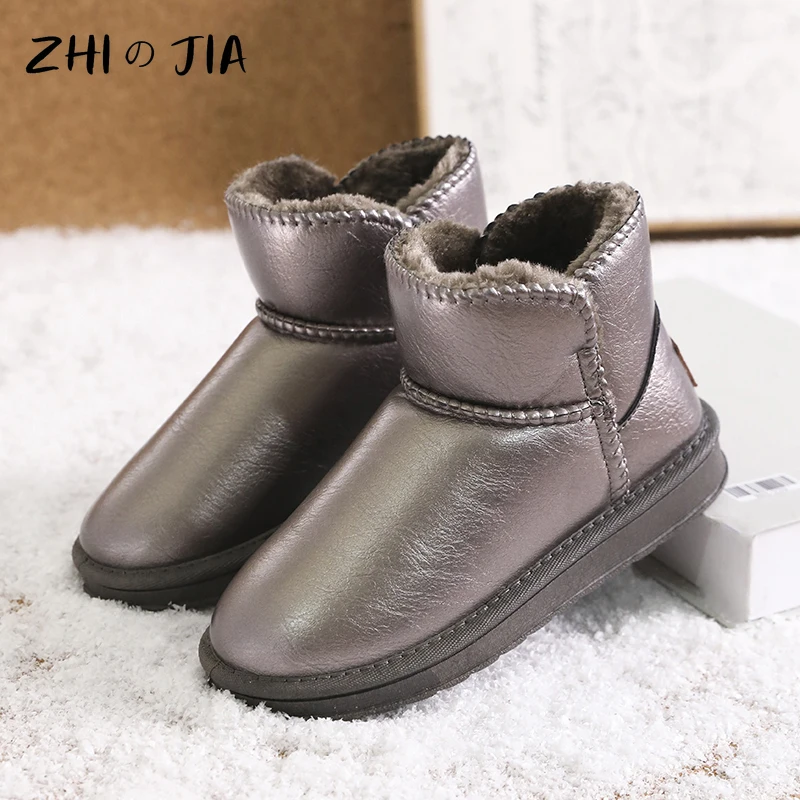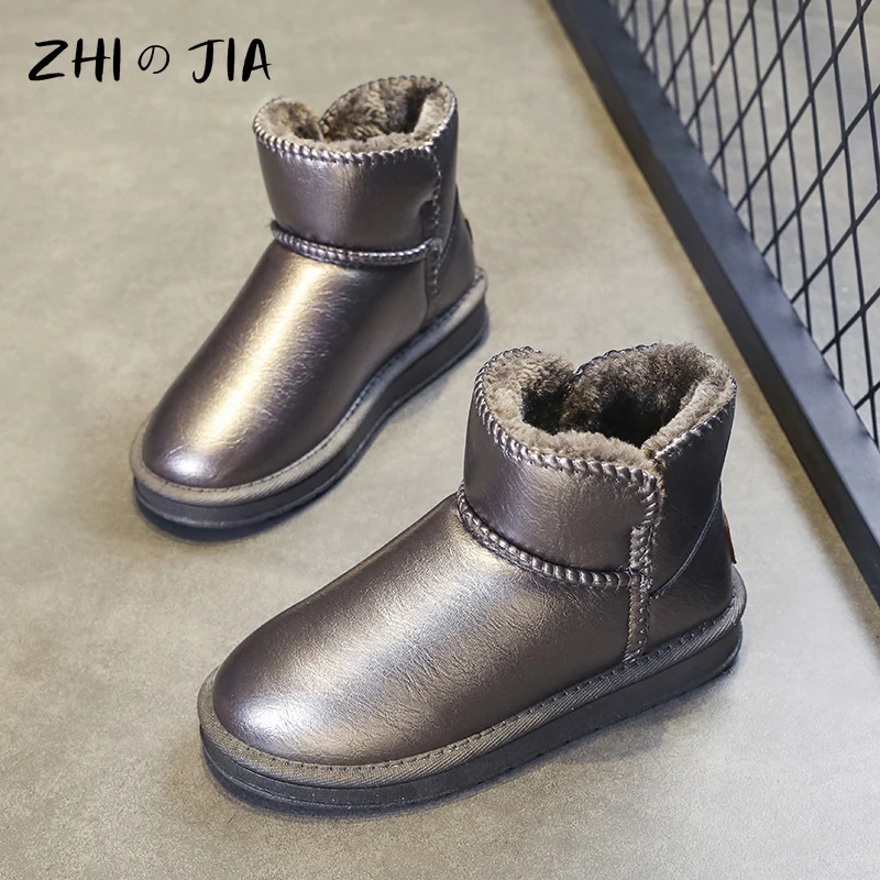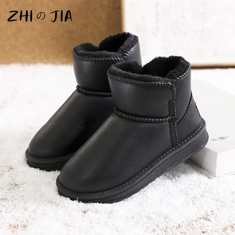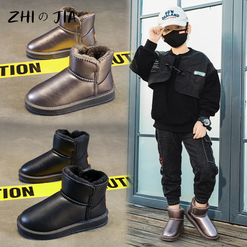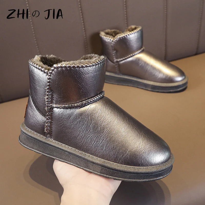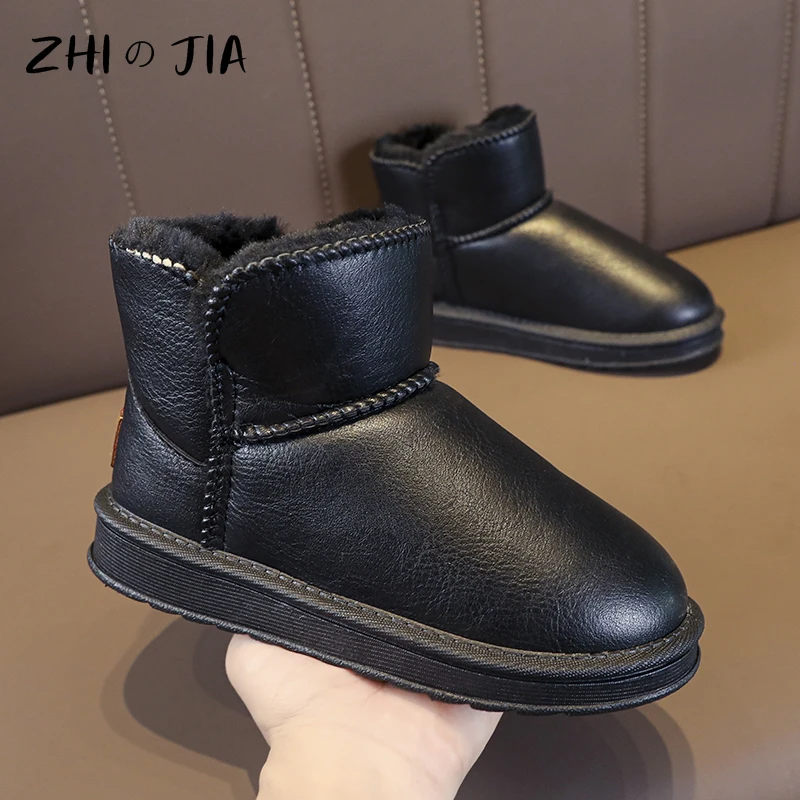 New Winter Children’s Snow Boots Boys Girls Warm Plush Ankle Boots Outdoor Walking Solid Color Soft Trendy Leather Footwear