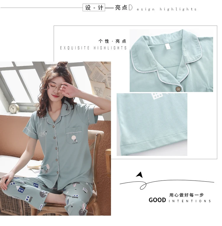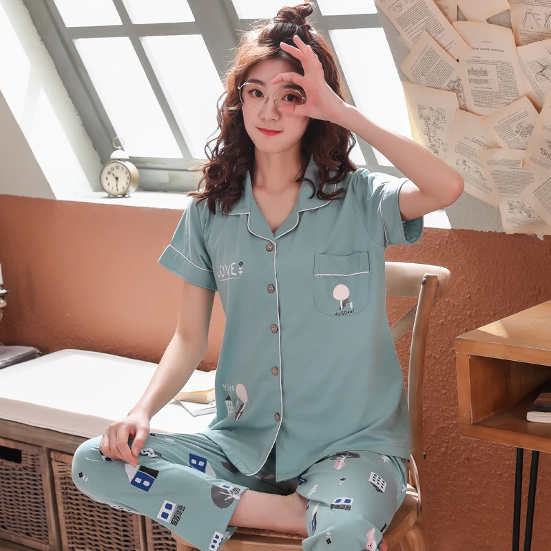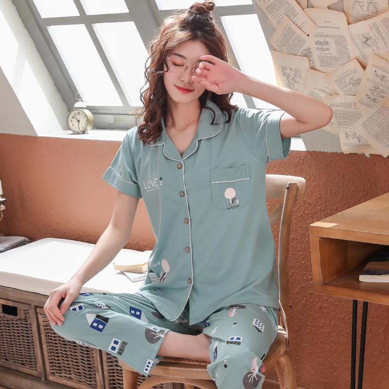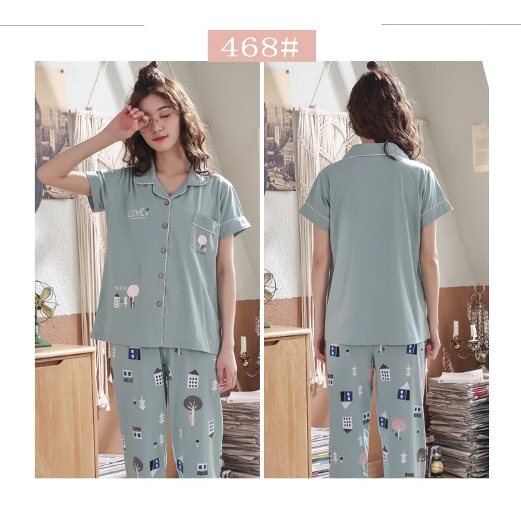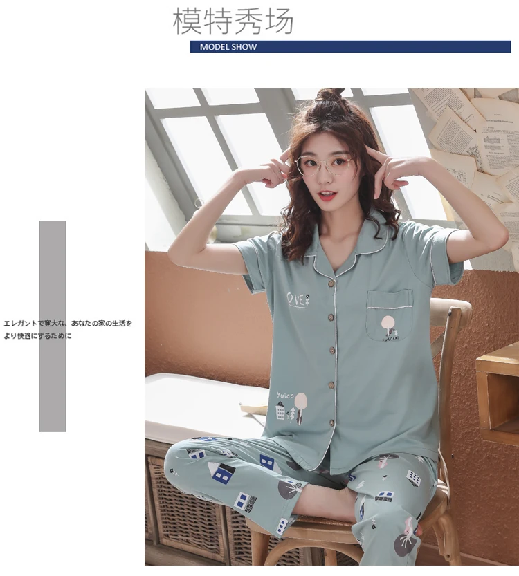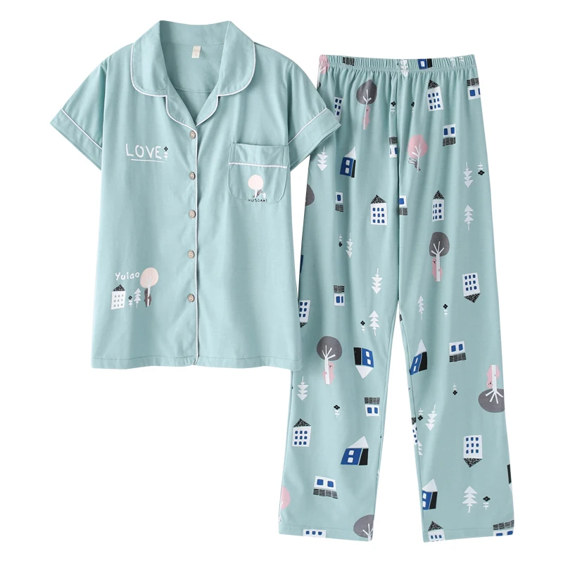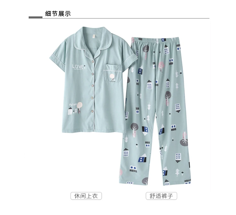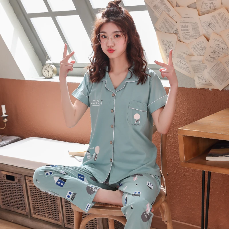 New Women Leisure Summer Short Sleeved Pajamas Set Long Pant Pyjamas 100%Cotton M-3XL Leisure Sleepwear