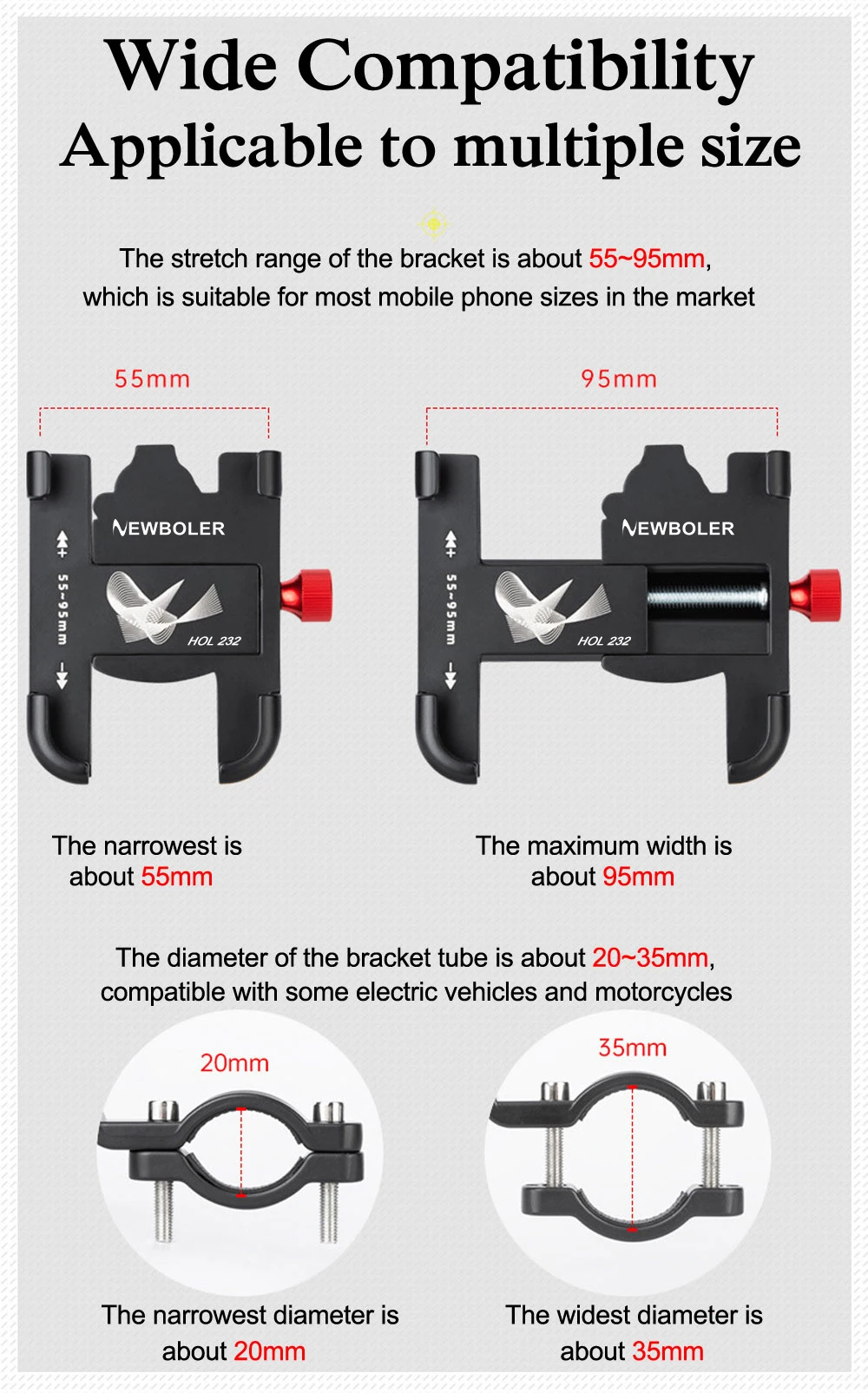 The tube diameter of the bracket is about 20~35mm, compatible with some electric vehicles and motorcycles