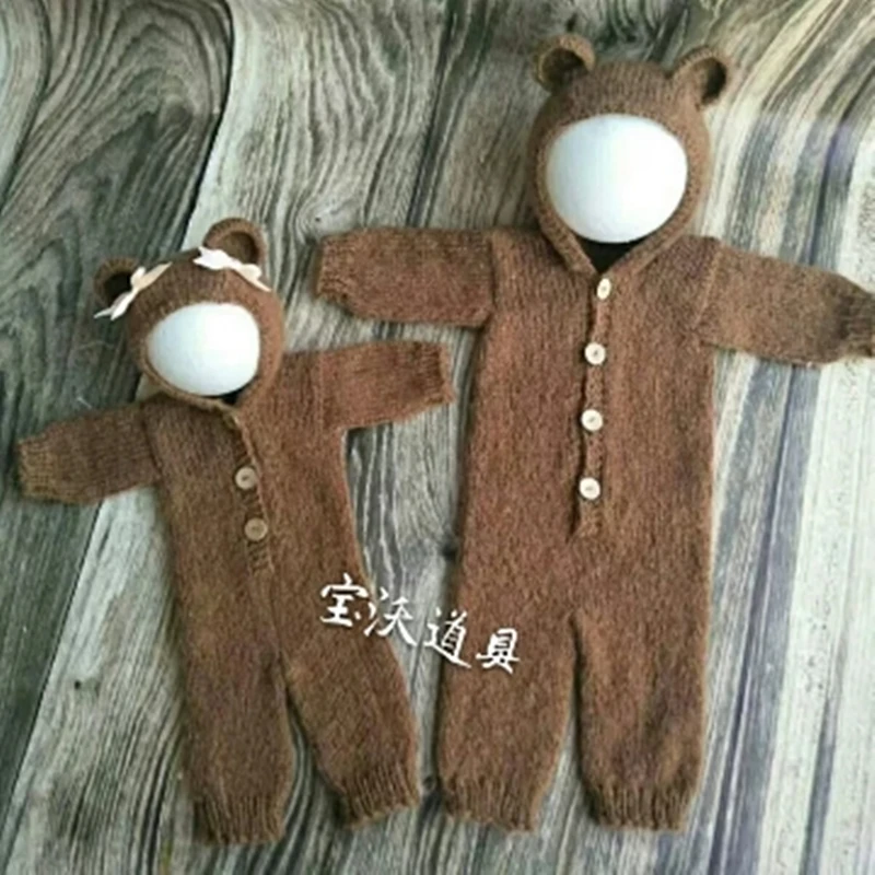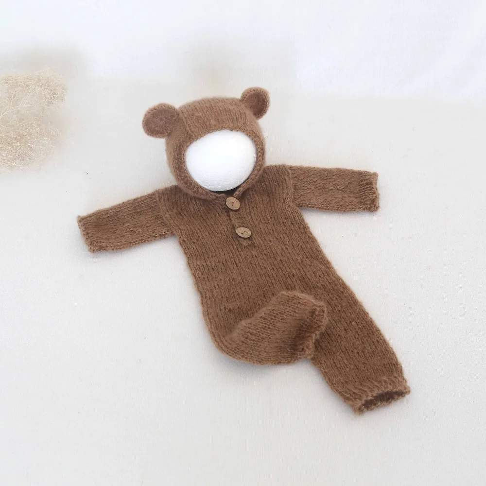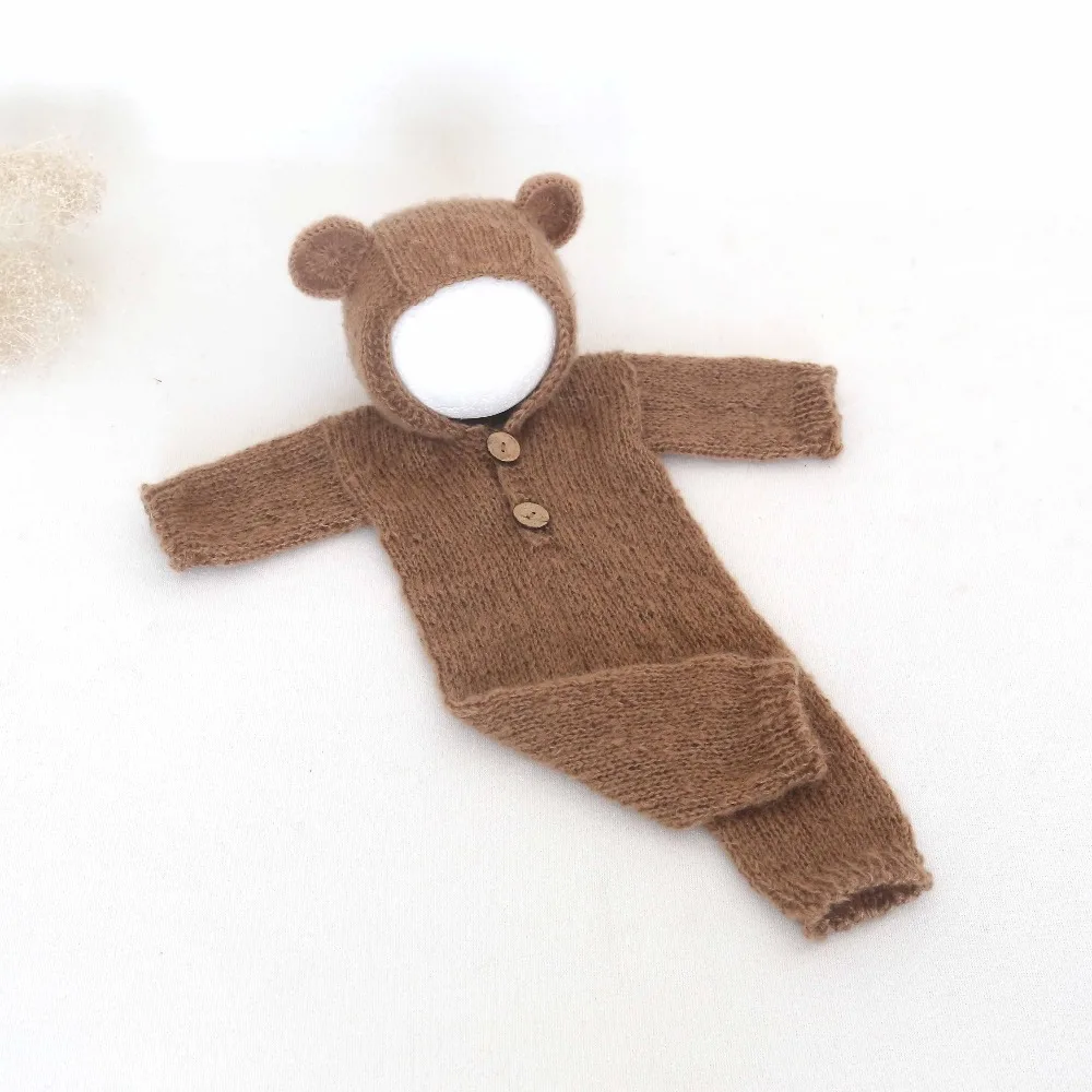 Newborn Footed Romper Knit Bear Outfit Long Sleeved Footed Onesie Photo Prop Baby Sleeper Romper And Bear Hat Set