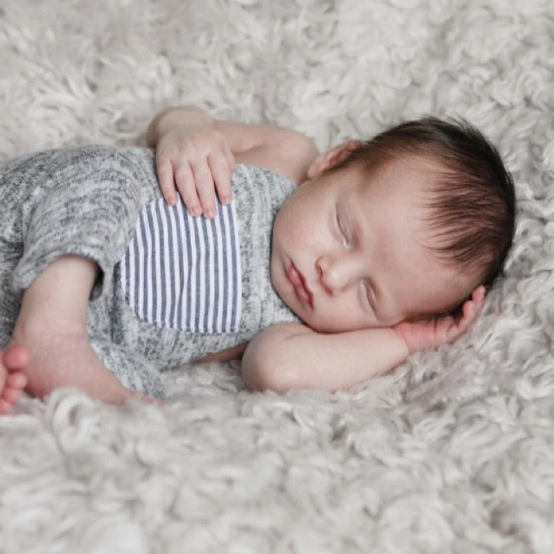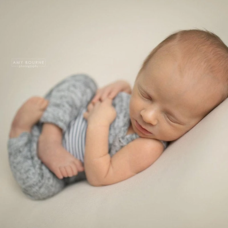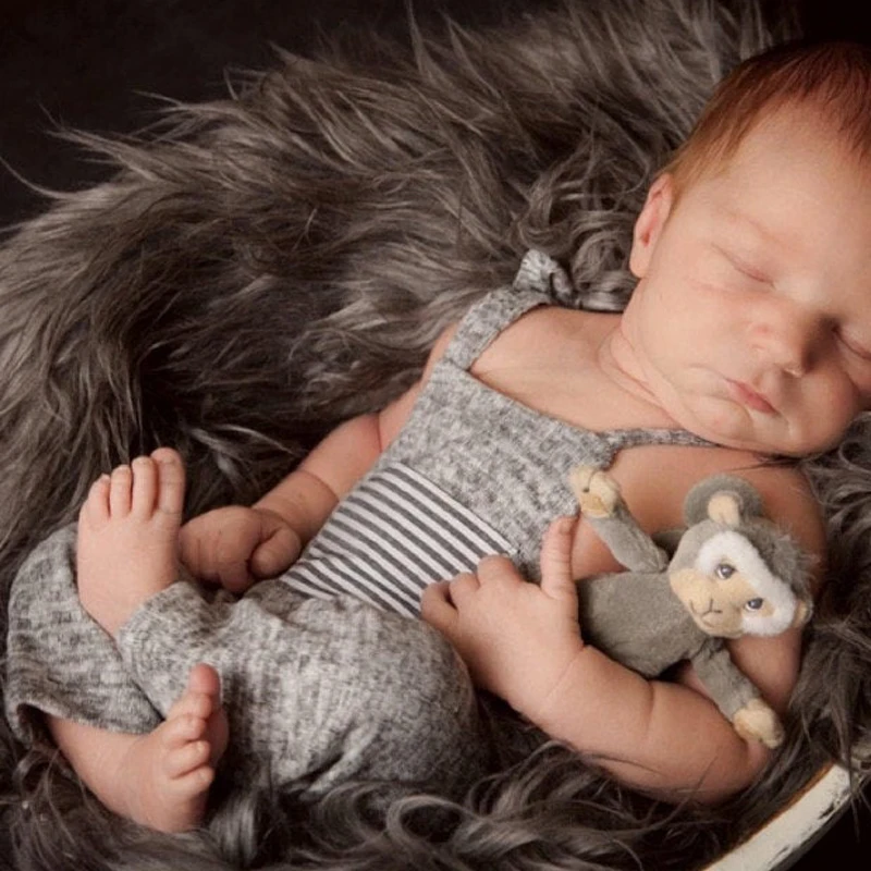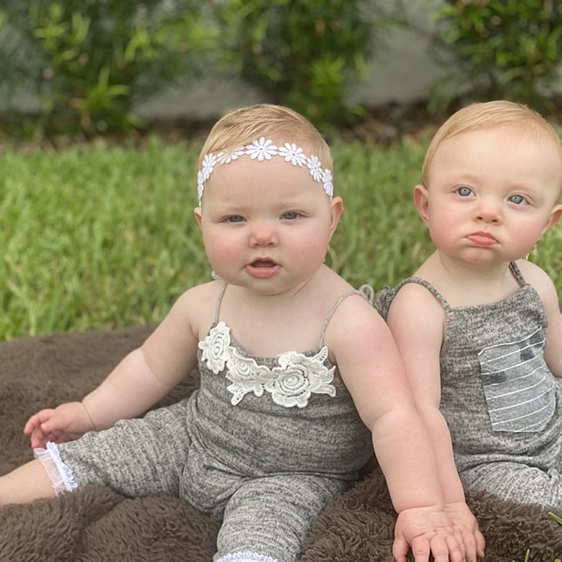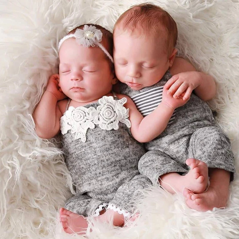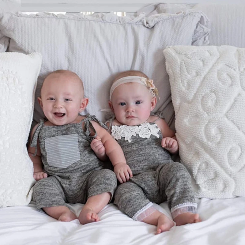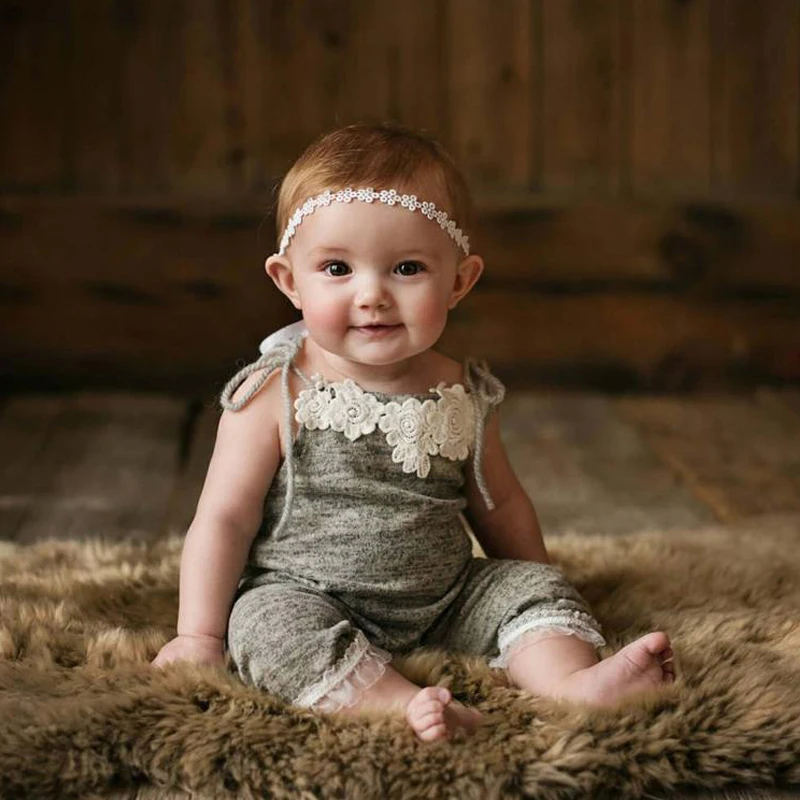 Romper made from light gray jersey fabric, decorated with cream lovely flower lace on the top and ruffled cream lace on the bottom.