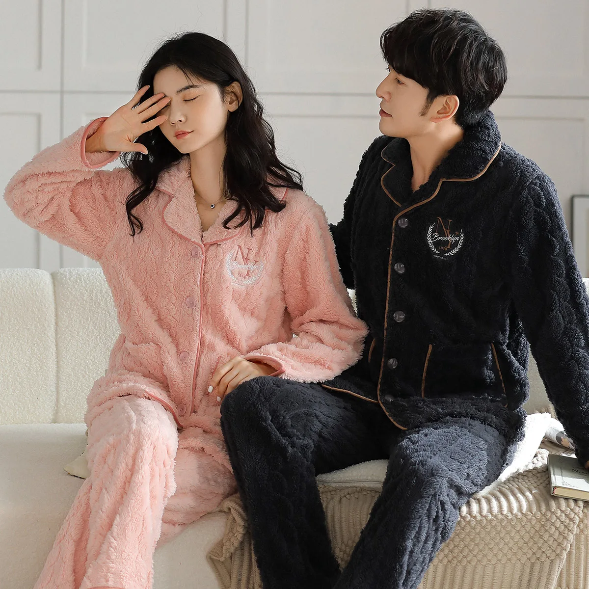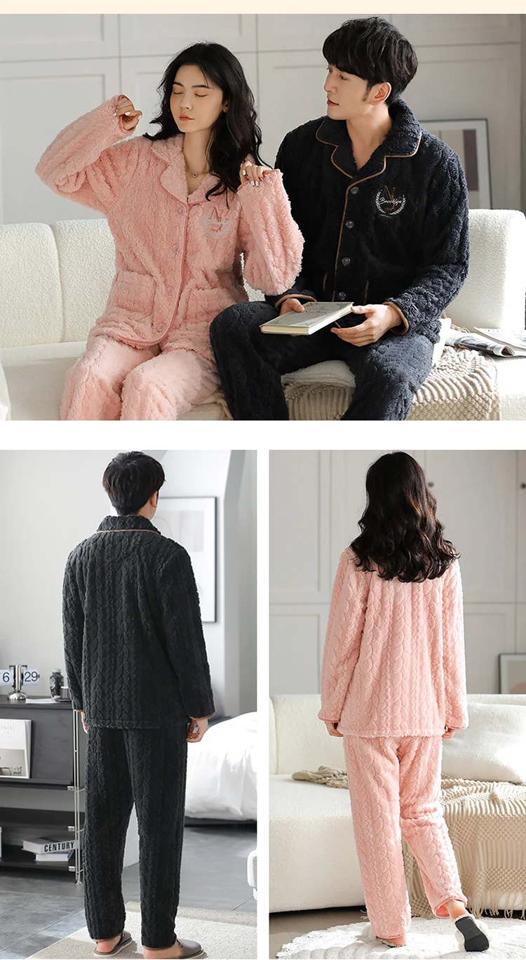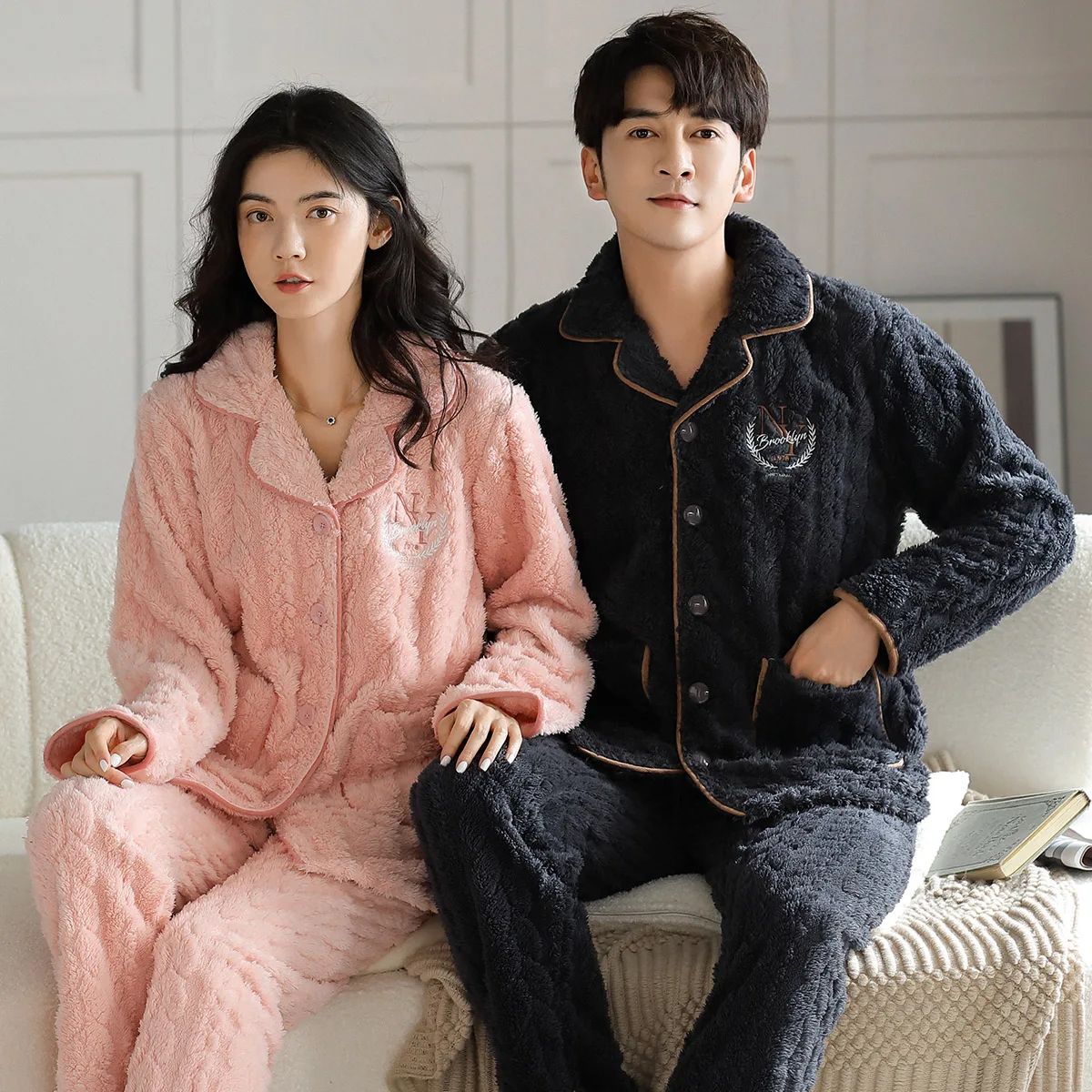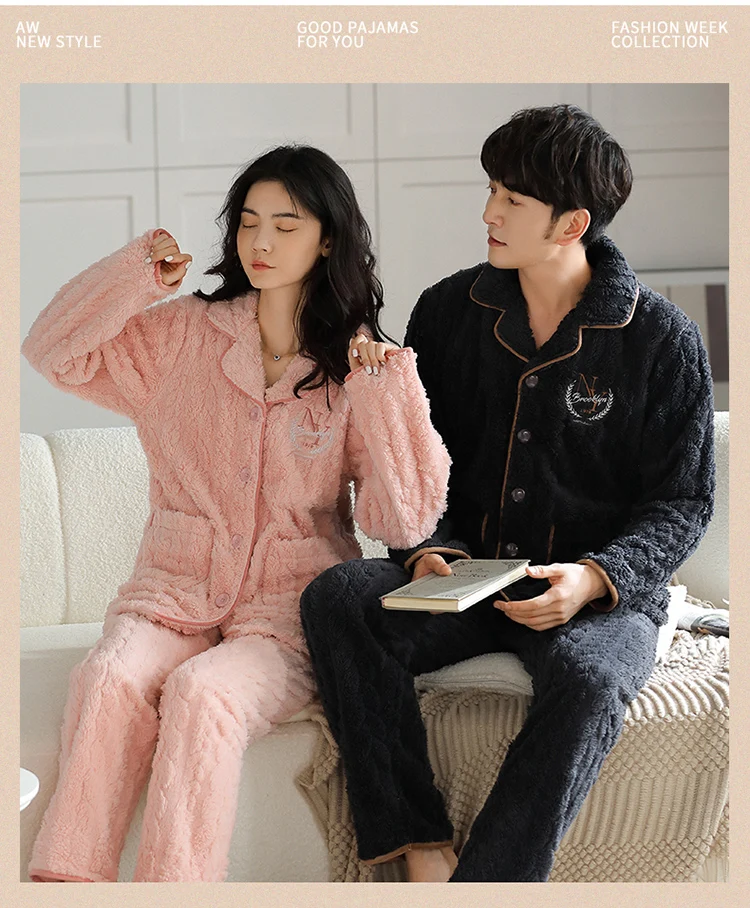 Newest Couple Pajama Set Winter Women Men Turn-down Collar Sleepwear Warm Flannel Pijama