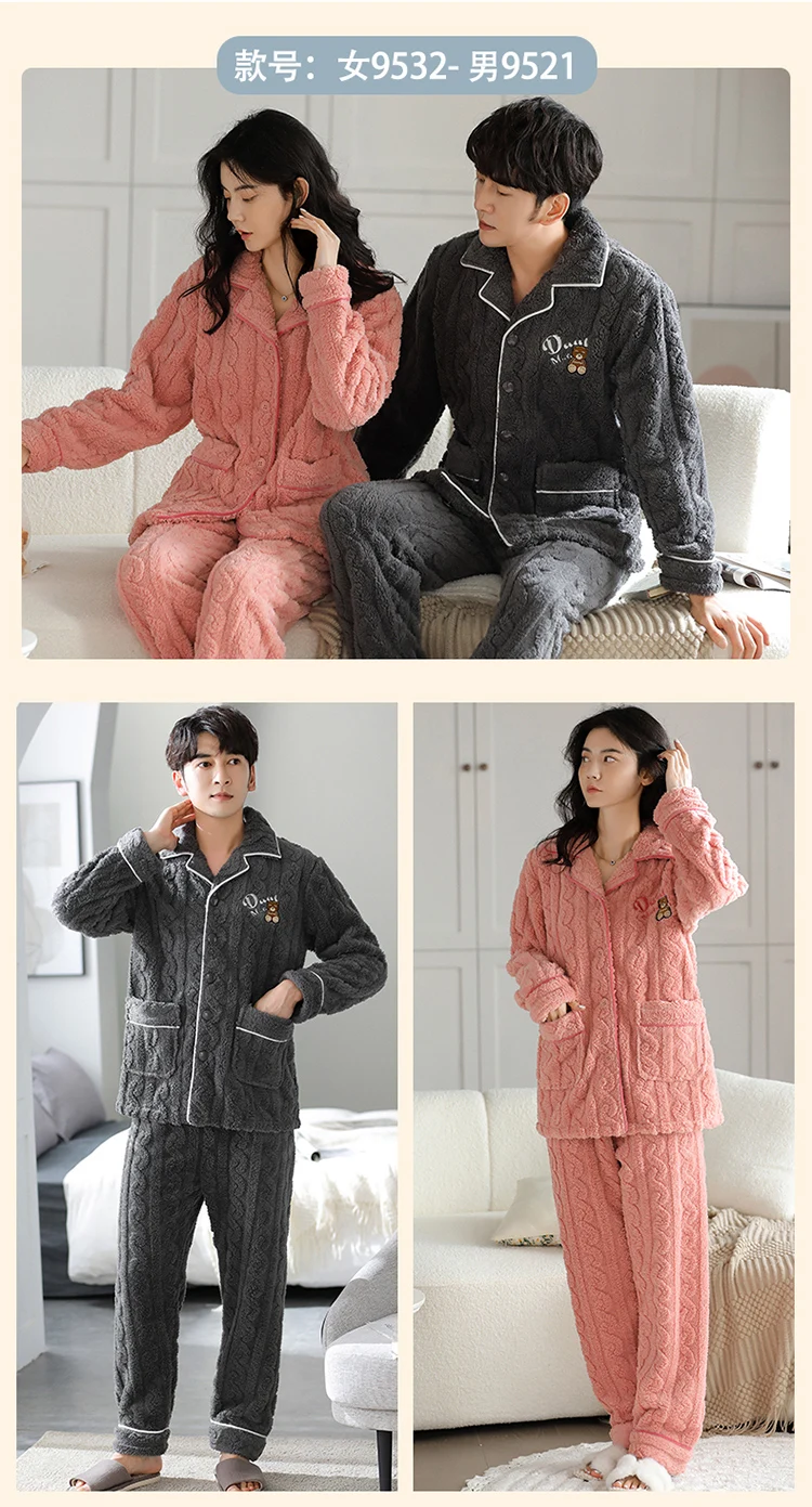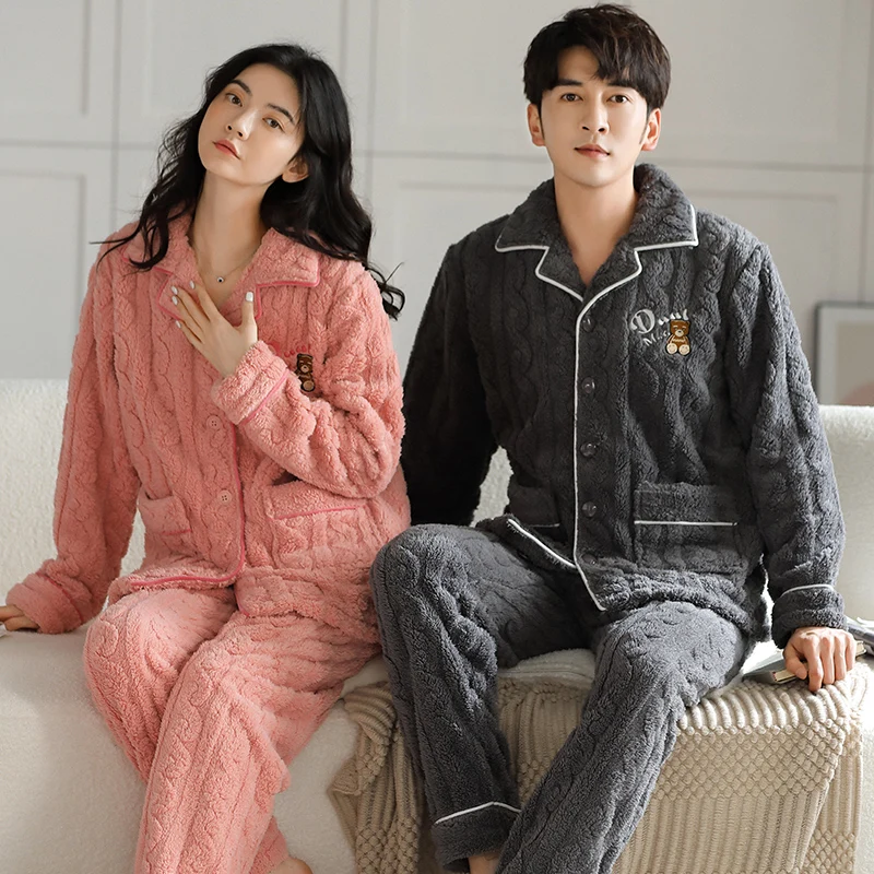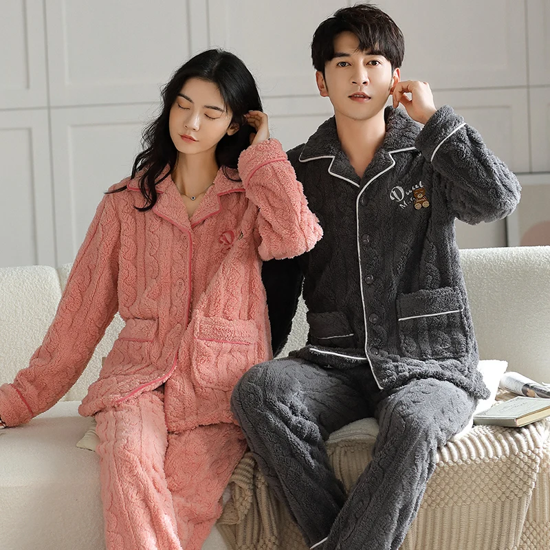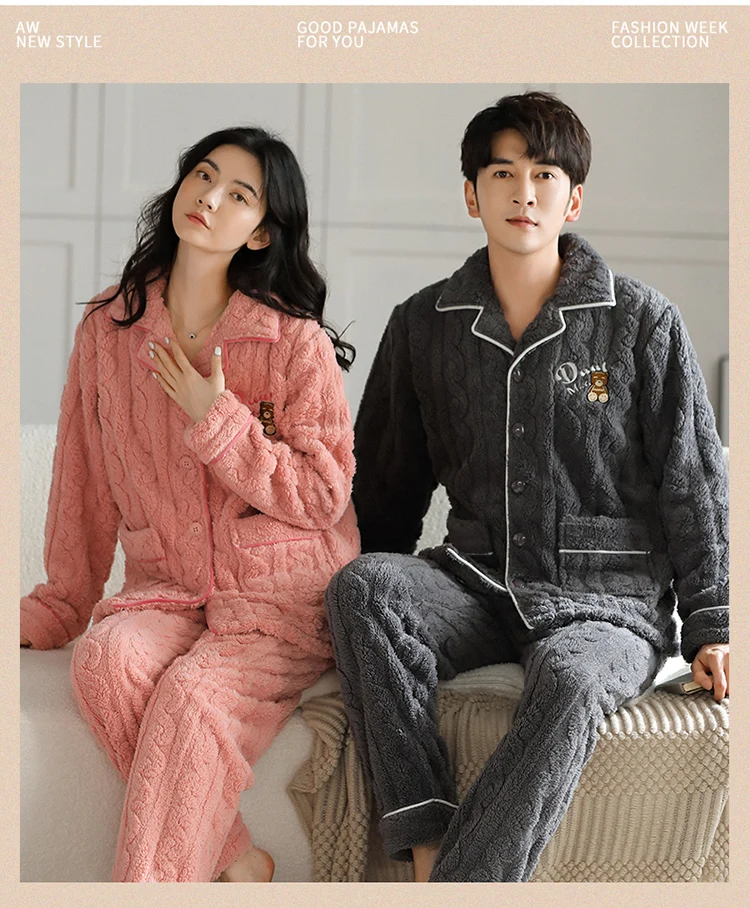 Newest Couple Pajama Set Winter Women Men Turn-down Collar Sleepwear Warm Flannel Pyjamas
