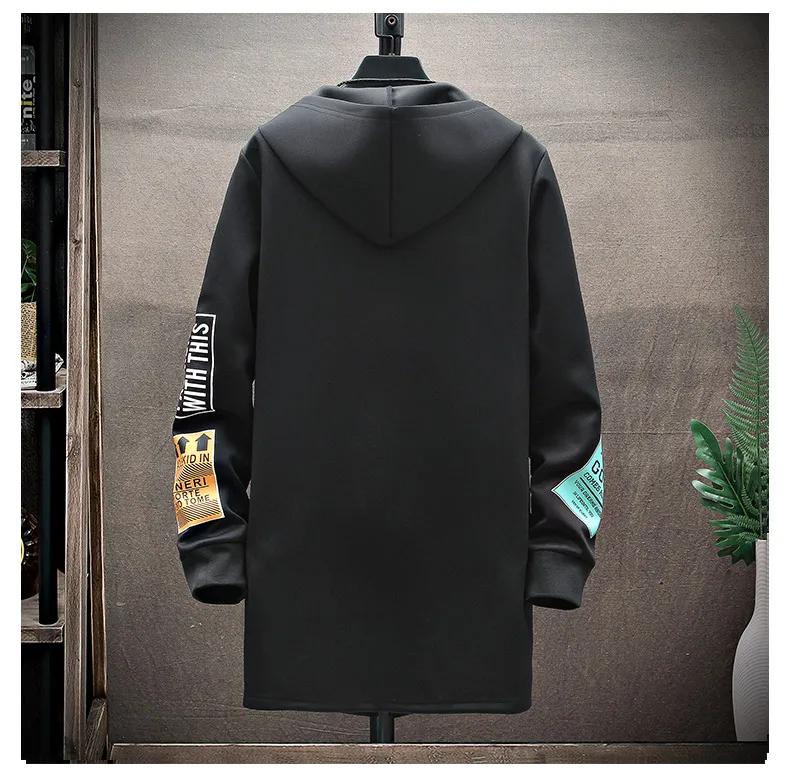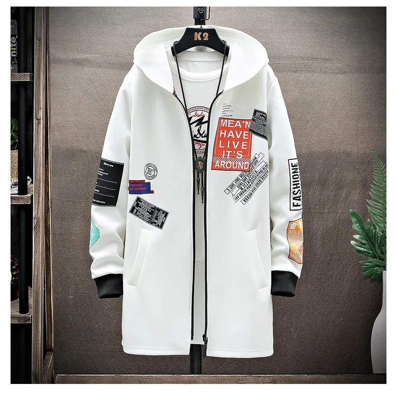Nice Hip Hop Korean Men’s Windbreaker Jackets Men Long Trench Coat Printed Cardigan Casual Hooded Coats Male 2 Color M-5XL