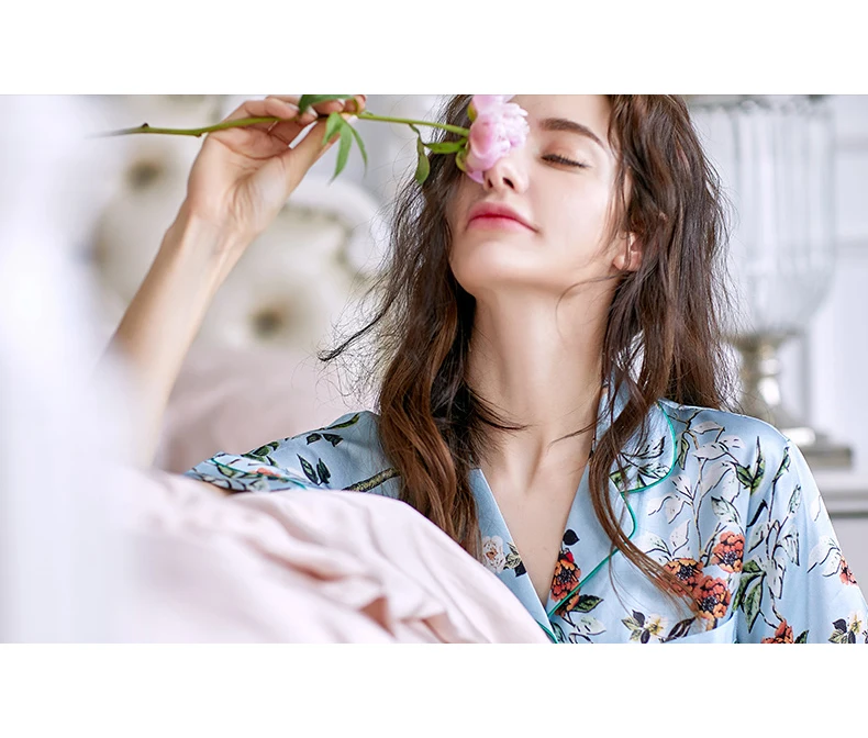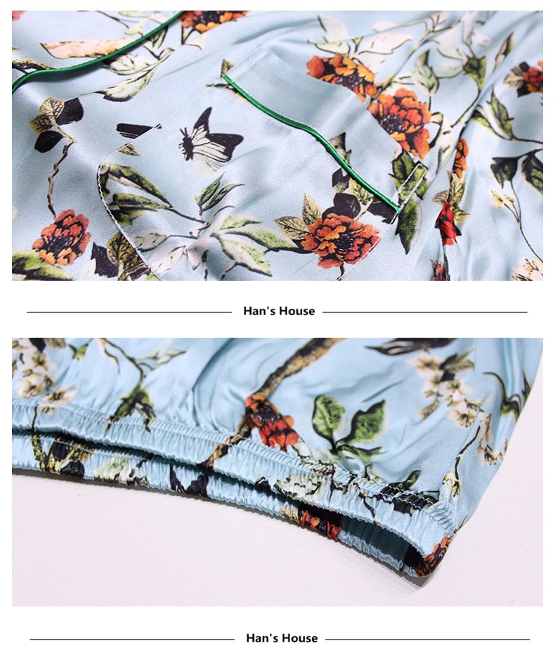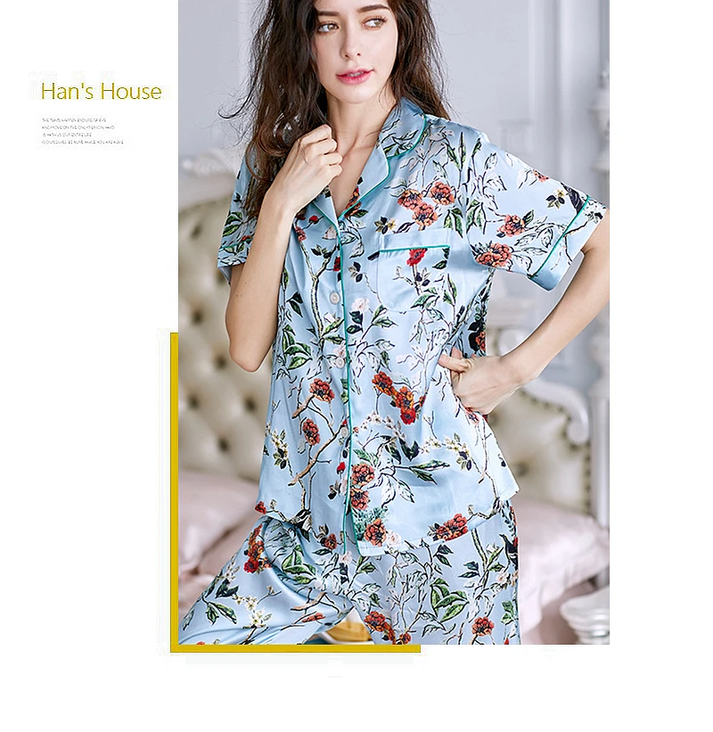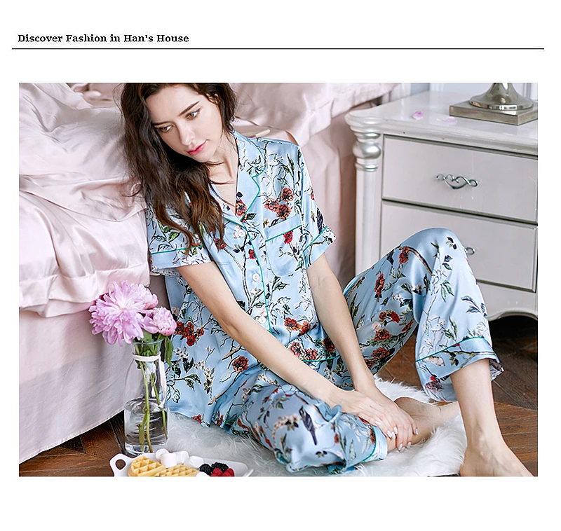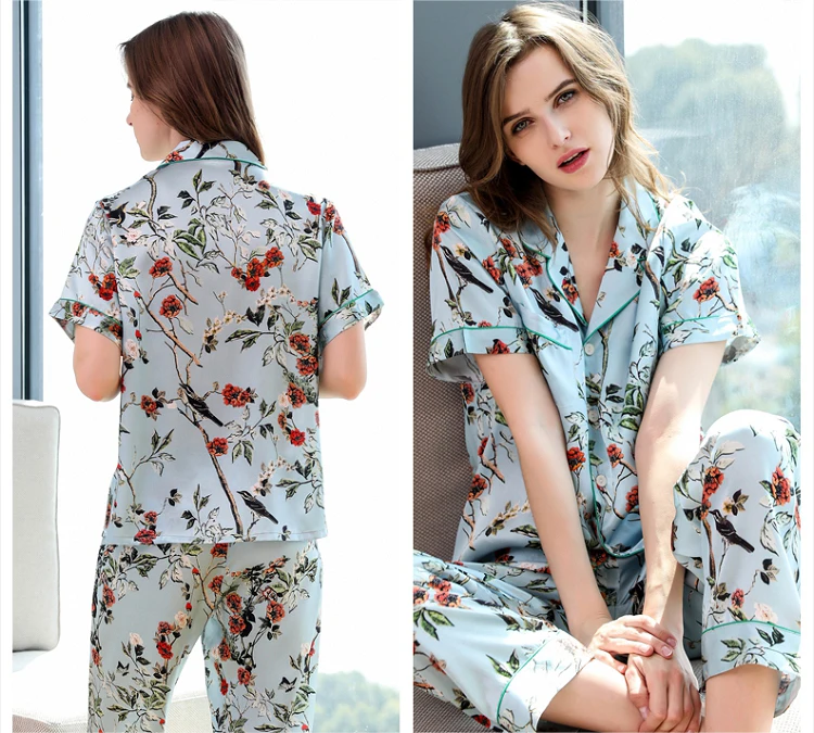 Nightgowns Women 100% Silk Nightcloth Printed Two Pieces Set Short Sleeve Elastic Waist Long Pants Loose Suits All Season