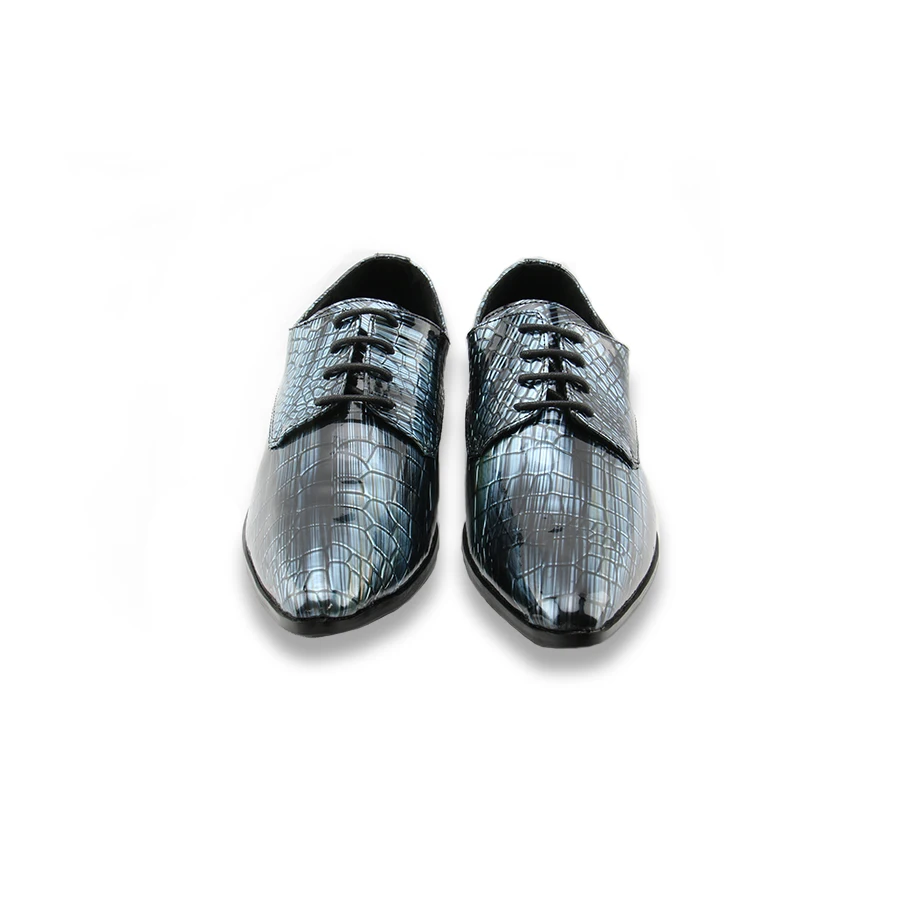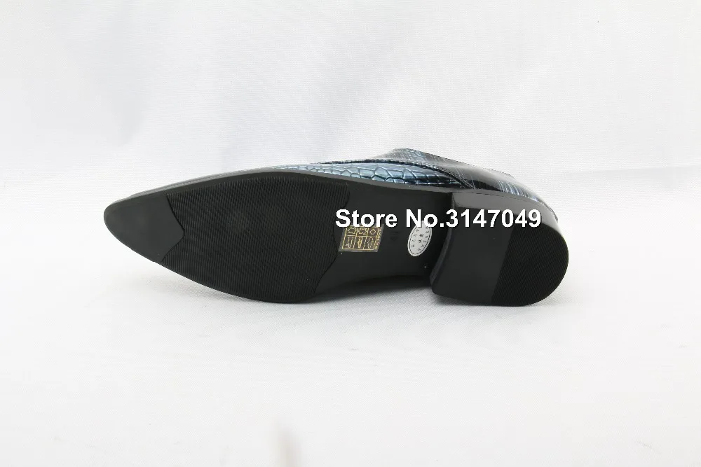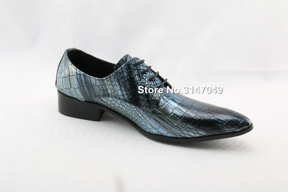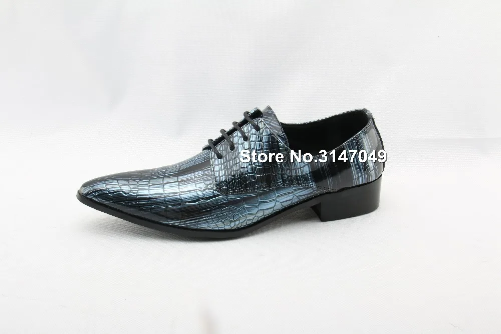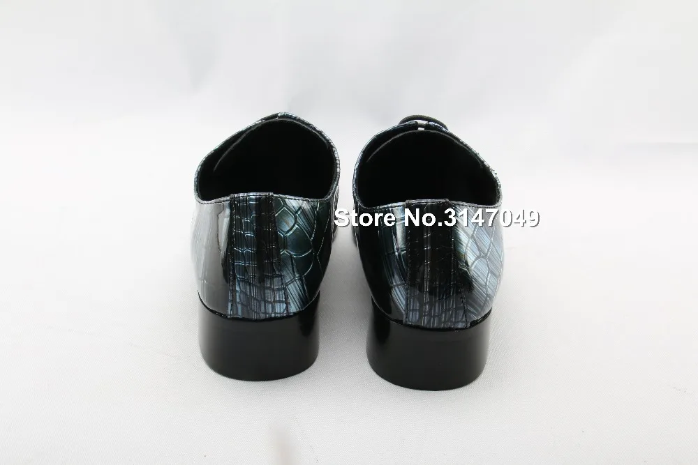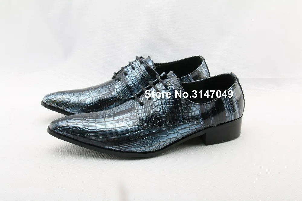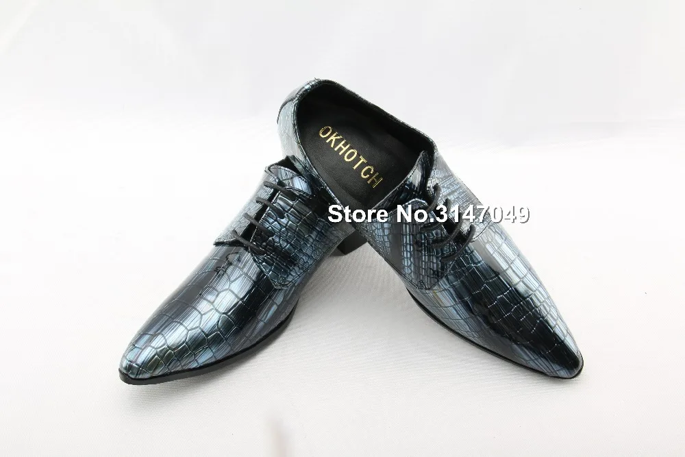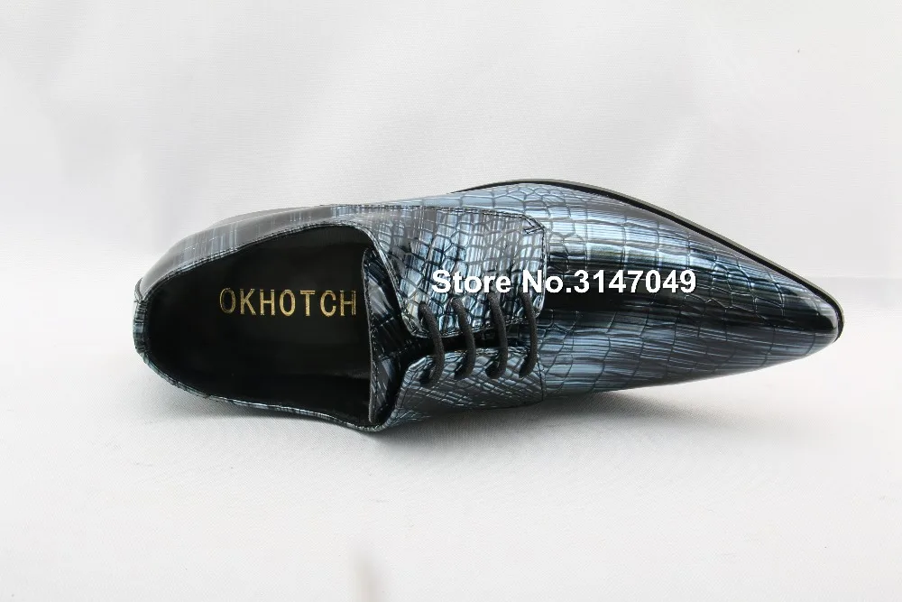 OKHOTCN Shiny Blue Genuine Leather Men Oxford Shoes Lace Up Casual Business Pointed Shoes Brand Men Wedding Dress Party Shoes