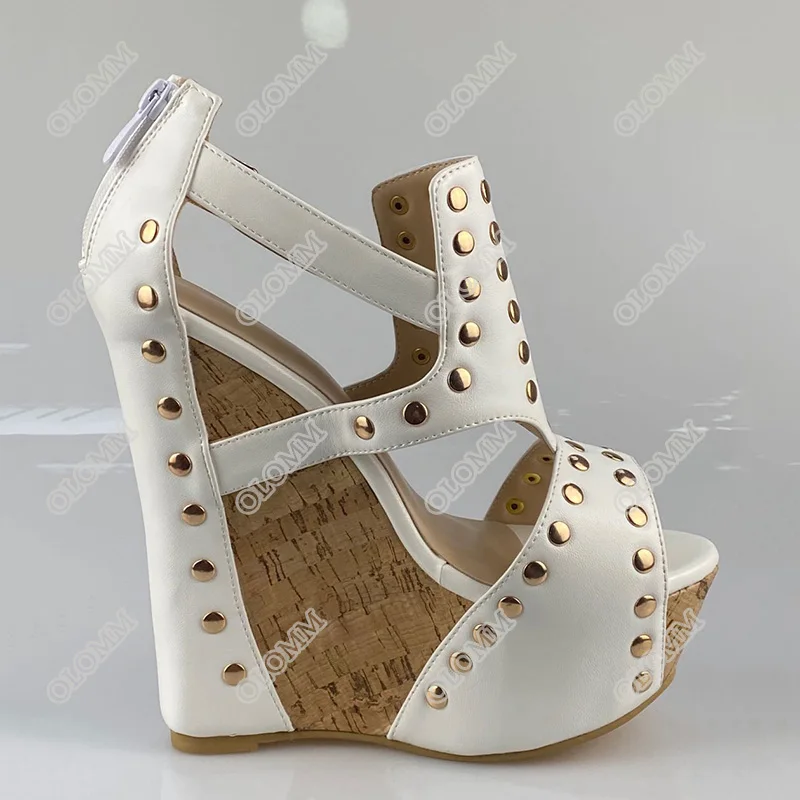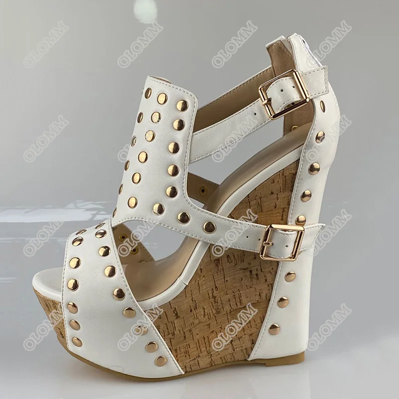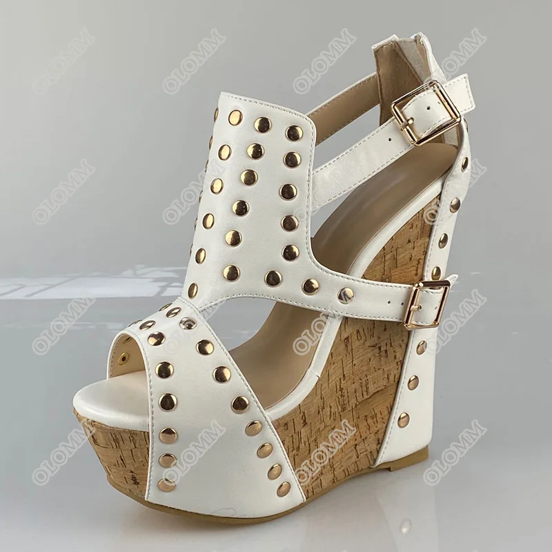 Olomm 2020 Handmade Women Studded Sandals Wedges Heels Sandals Open Toe White Club Wear Shoes Women Shoes US Plus Size 4-10.5.Please Refer to Our Sizing Info When Selecting Size.