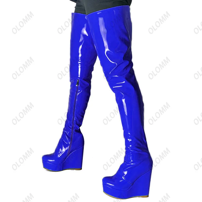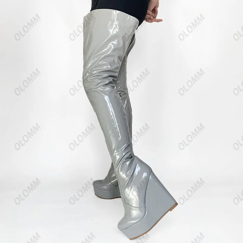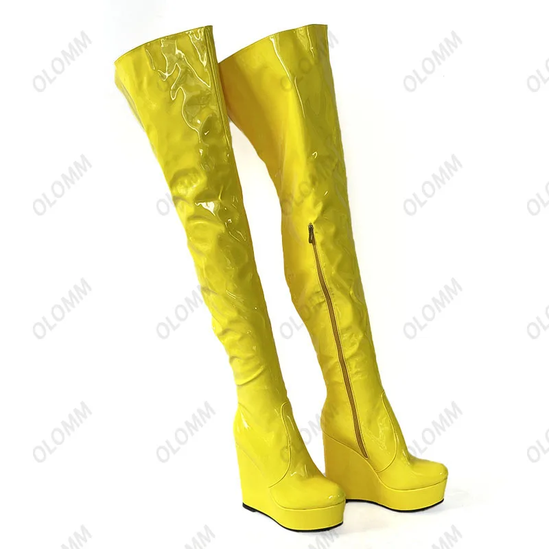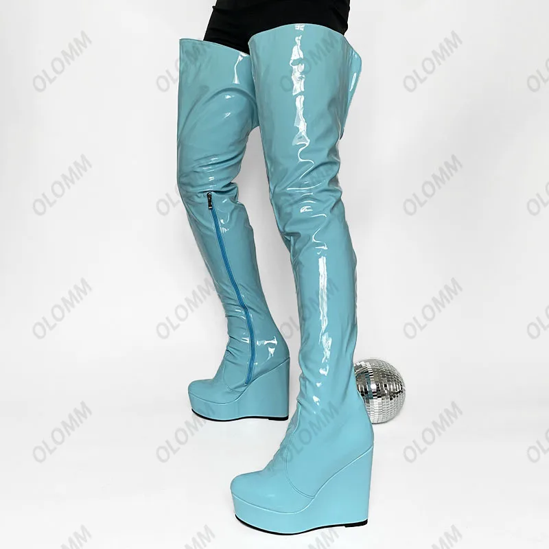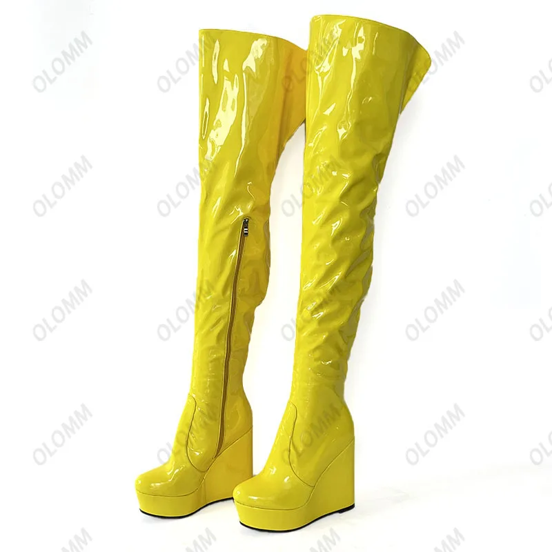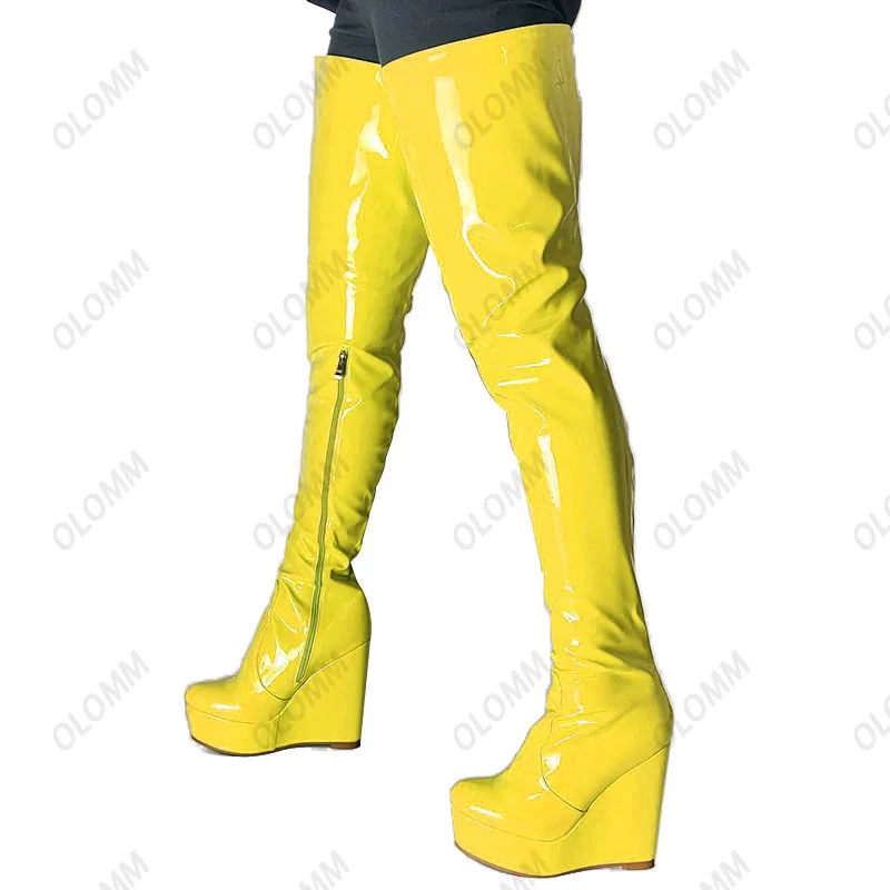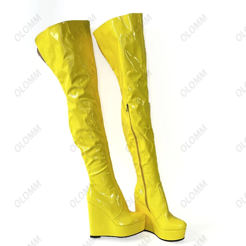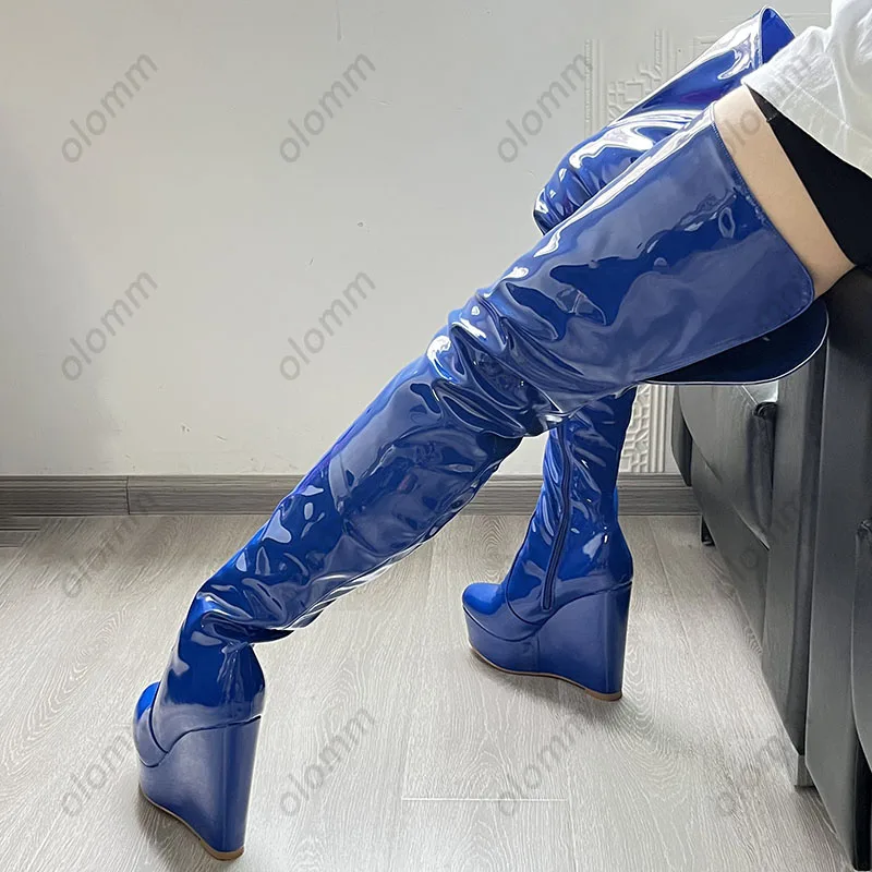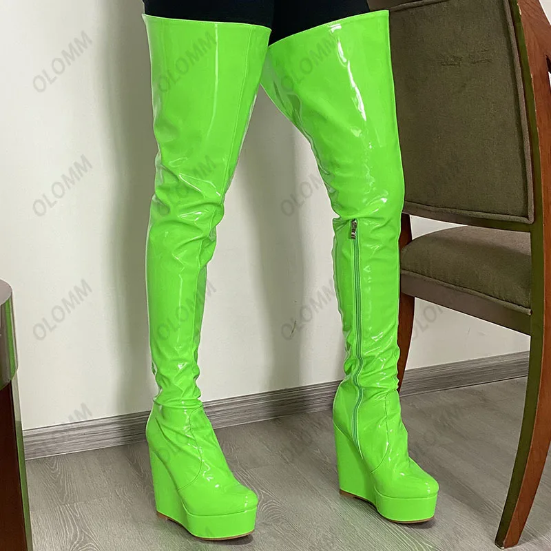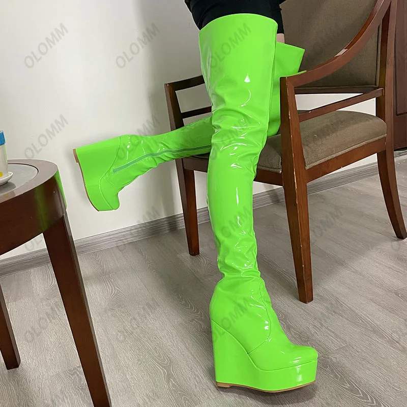 Olomm 2022 Handmade Women Platform Thigh Boots Patent Wedges Heels Round Toe Beautiful Green Shoes Ladies Plus US Size 5-20.Please Refer to Our Sizing Info When Selecting Size.