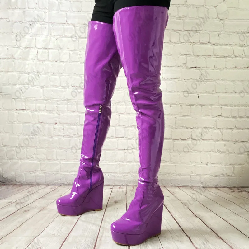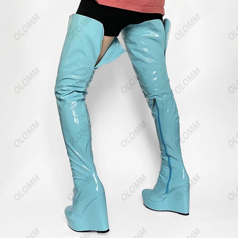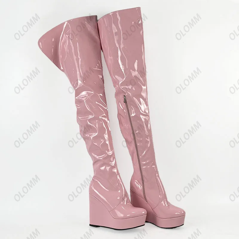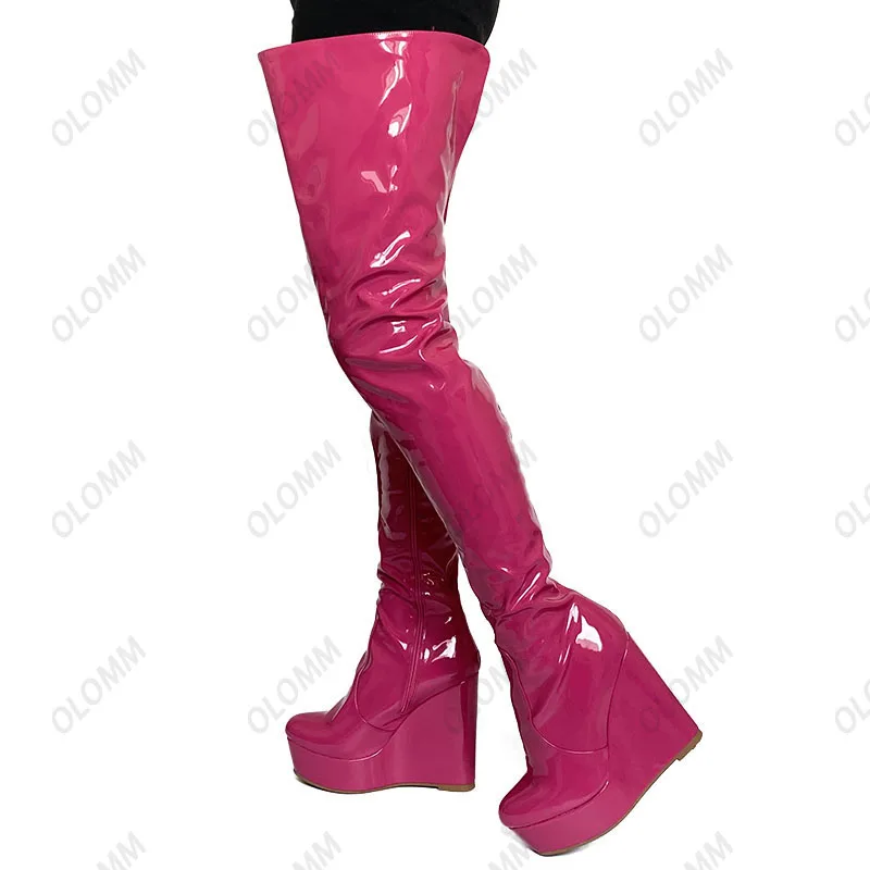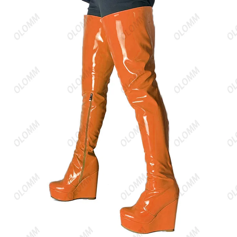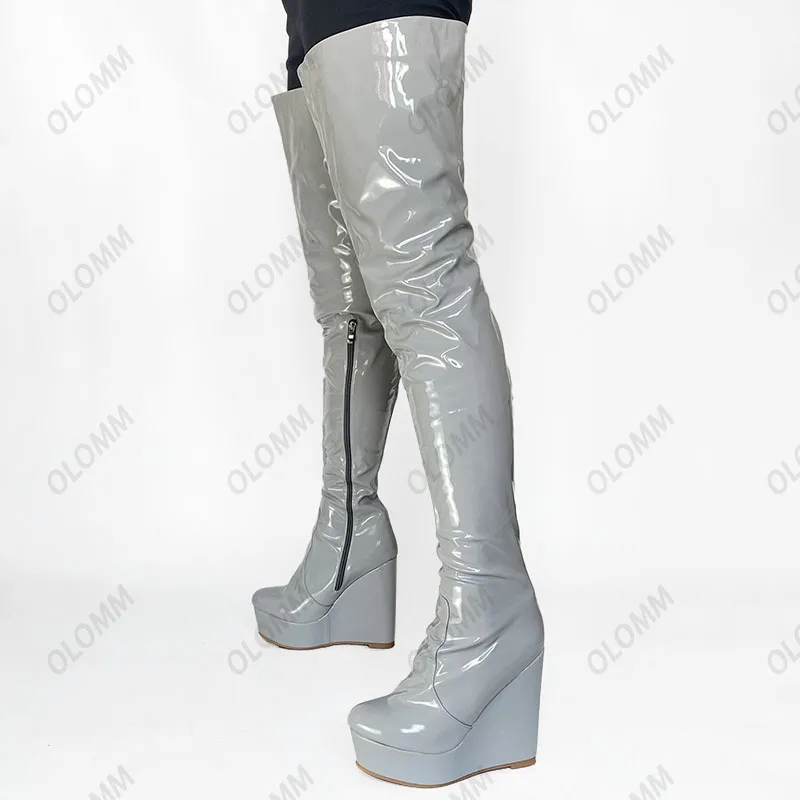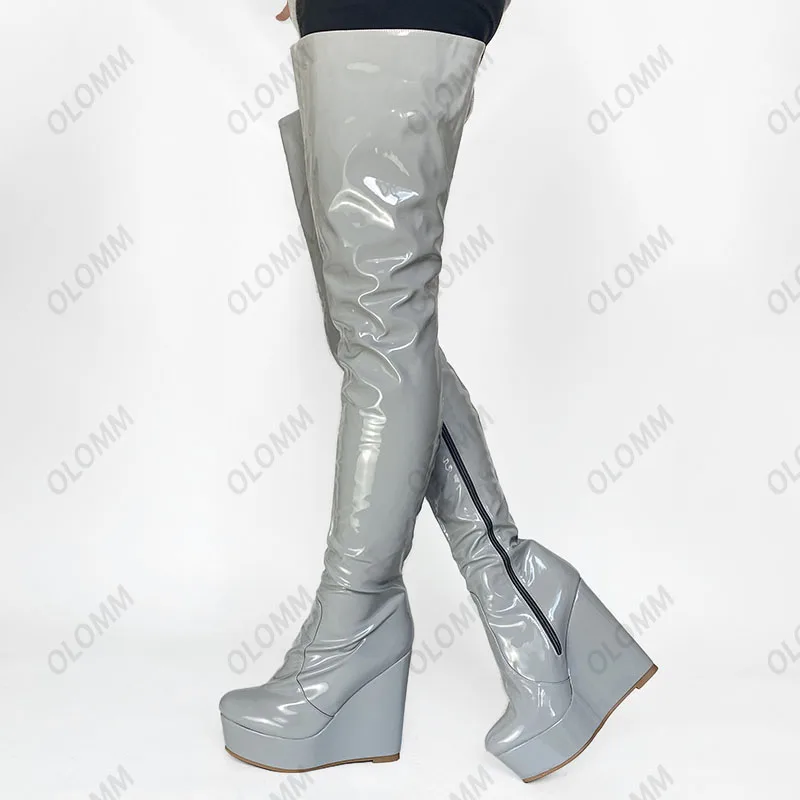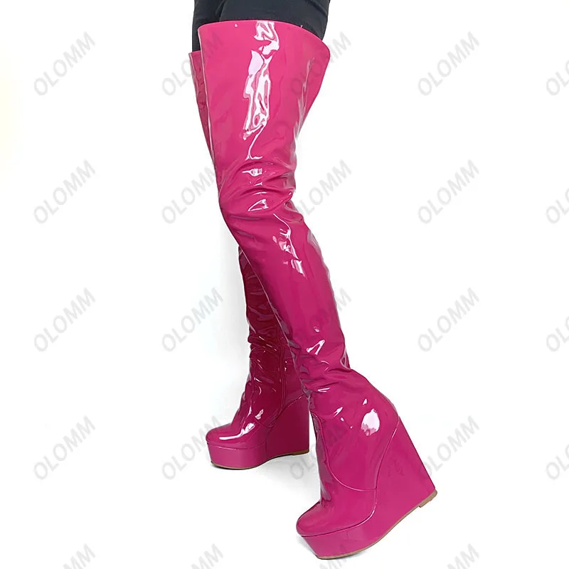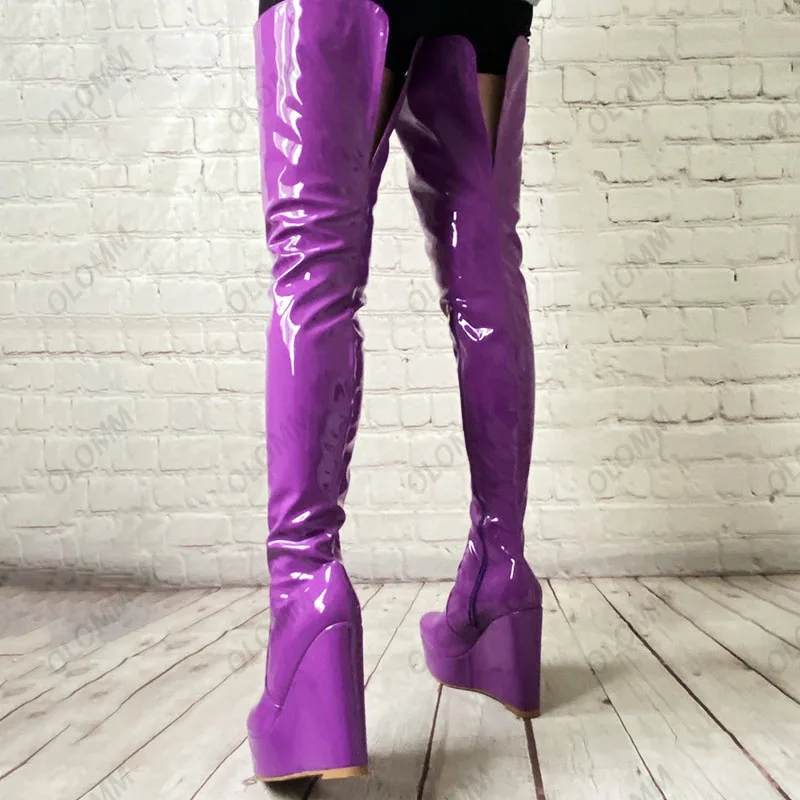 Olomm 2022 Handmade Women Platform Thigh Boots Patent Wedges Heels Round Toe Beautiful Green Shoes Ladies Plus US Size 5-20.Please Refer to Our Sizing Info When Selecting Size.