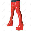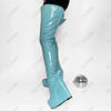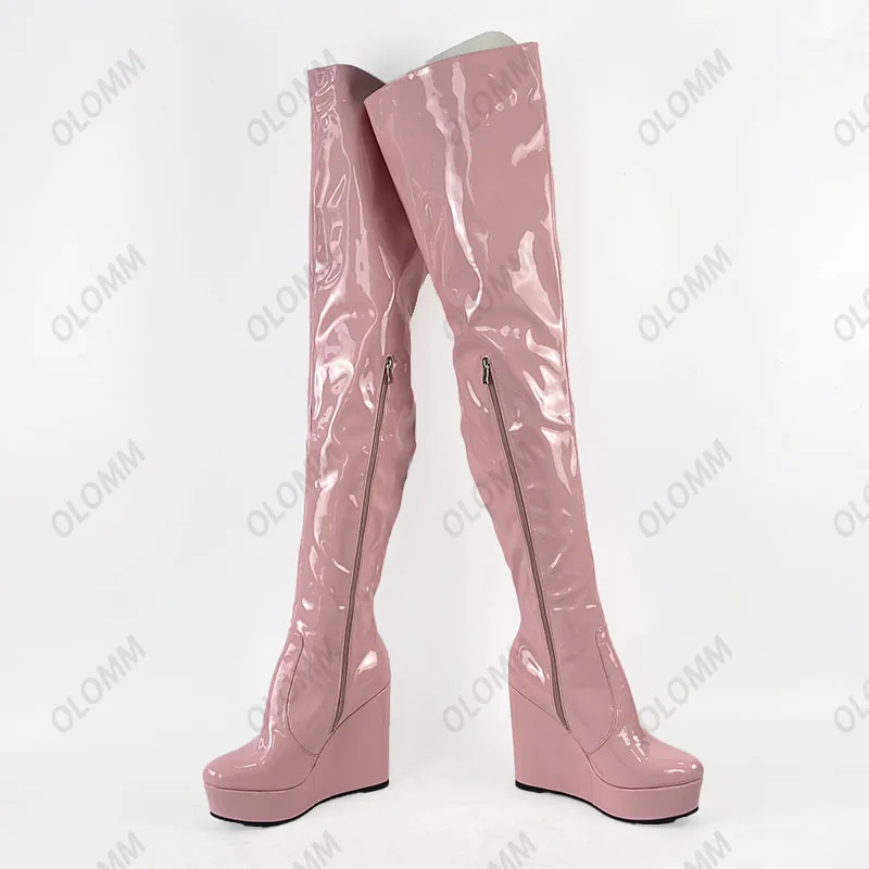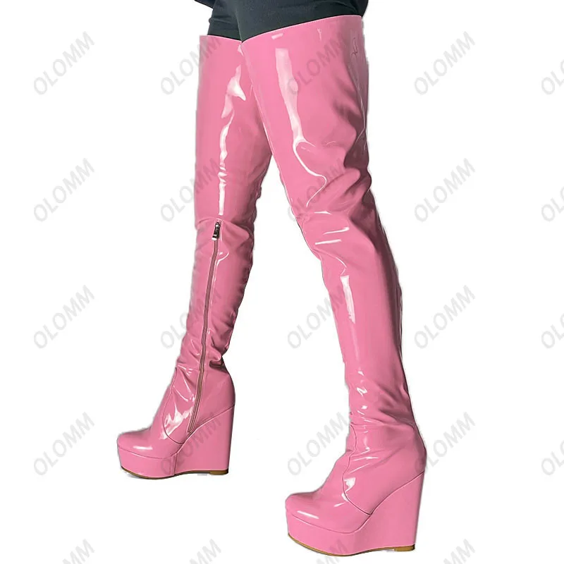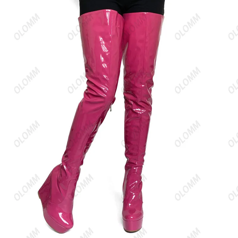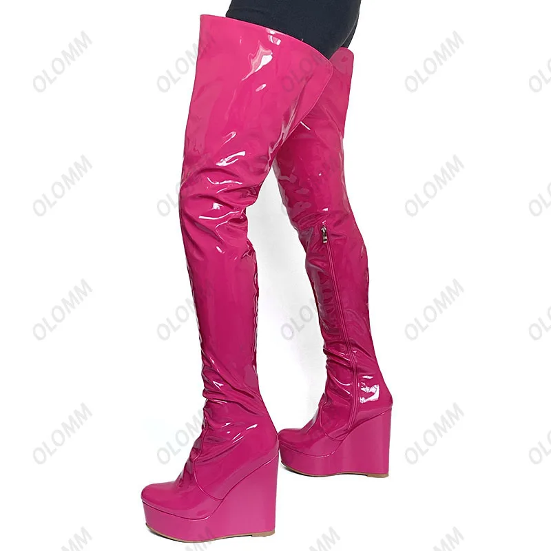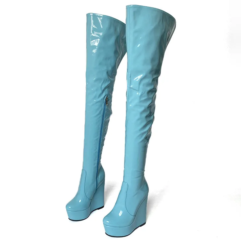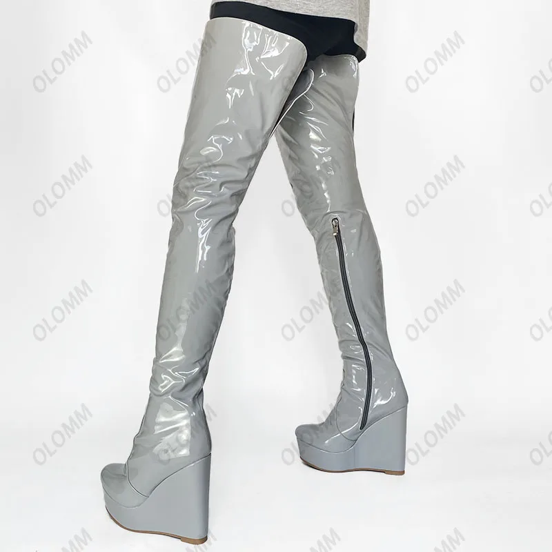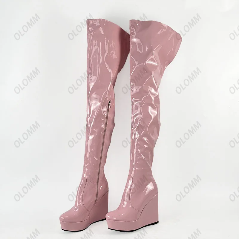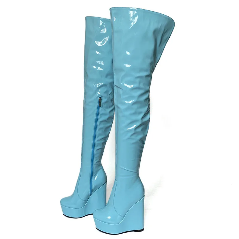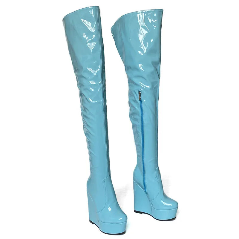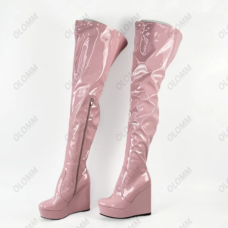Olomm 2022 Handmade Women Platform Thigh Boots Patent Wedges Heels Round Toe Beautiful Green Shoes Ladies Plus US Size 5-20.Please Refer to Our Sizing Info When Selecting Size.