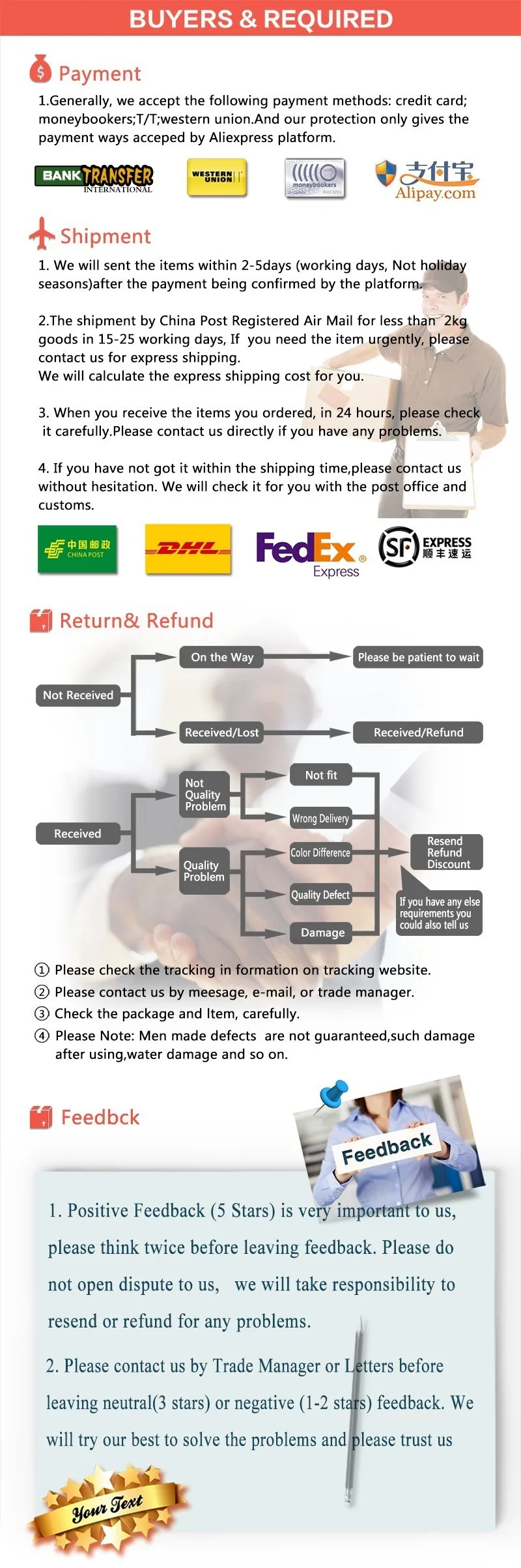 • If you did not receive the product within the guaranteed time( 45 days not including 2-5 day processing) you can request a refund or a reshipment.