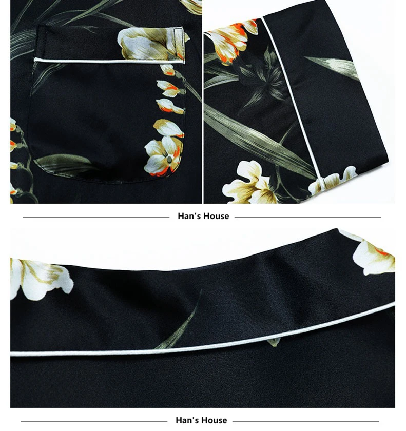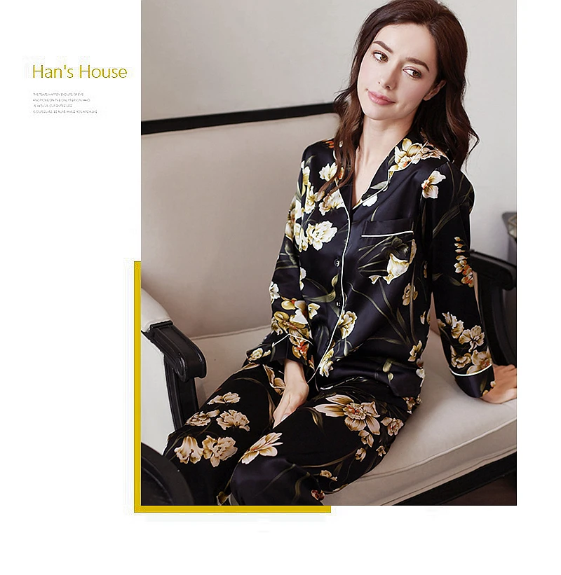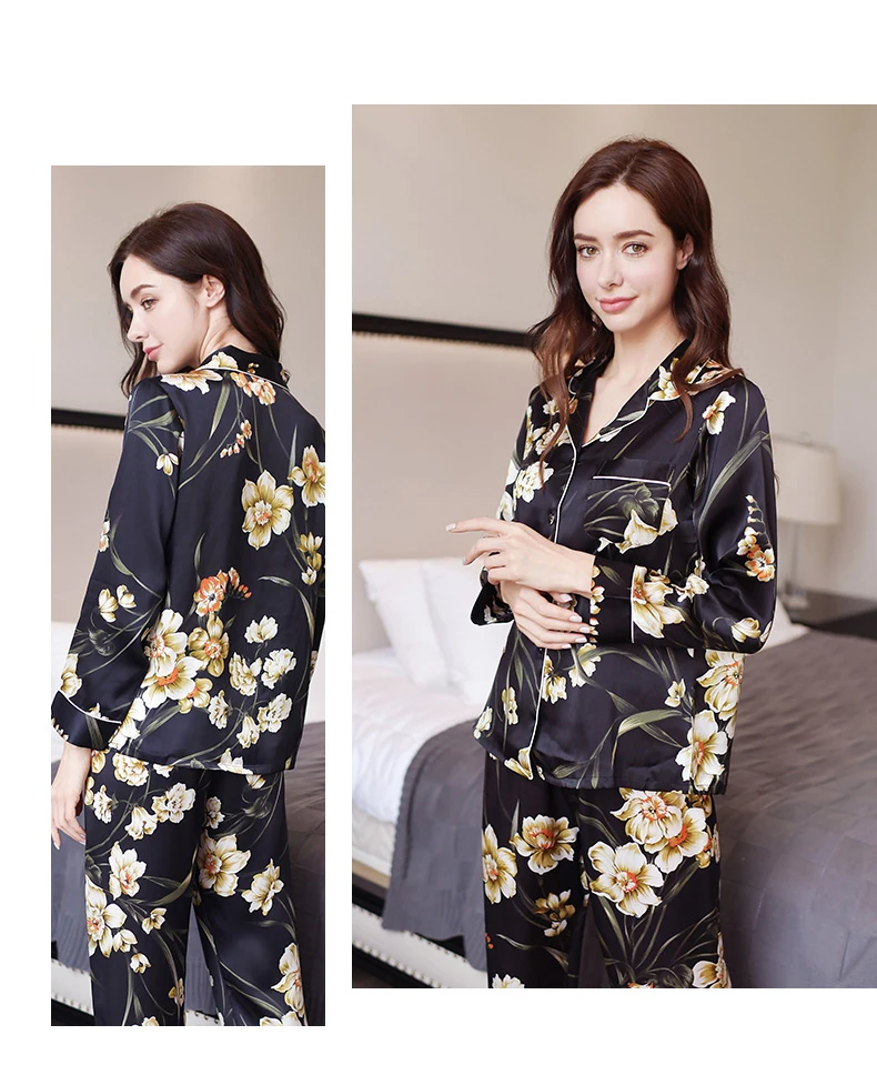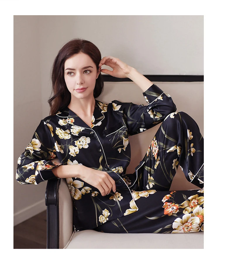Pajamas Women Robe Sets 100% Silk Printed Fabric Sleepwear Two Pieces Set Turn-down Collar Elastic Waist Nightgown Suits