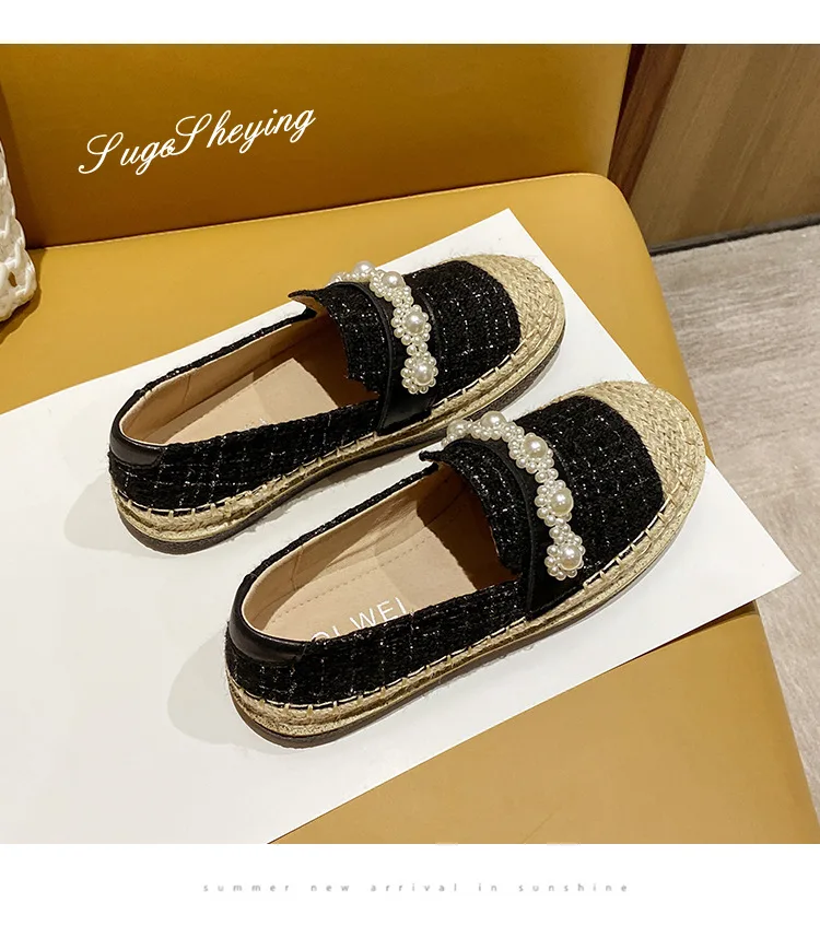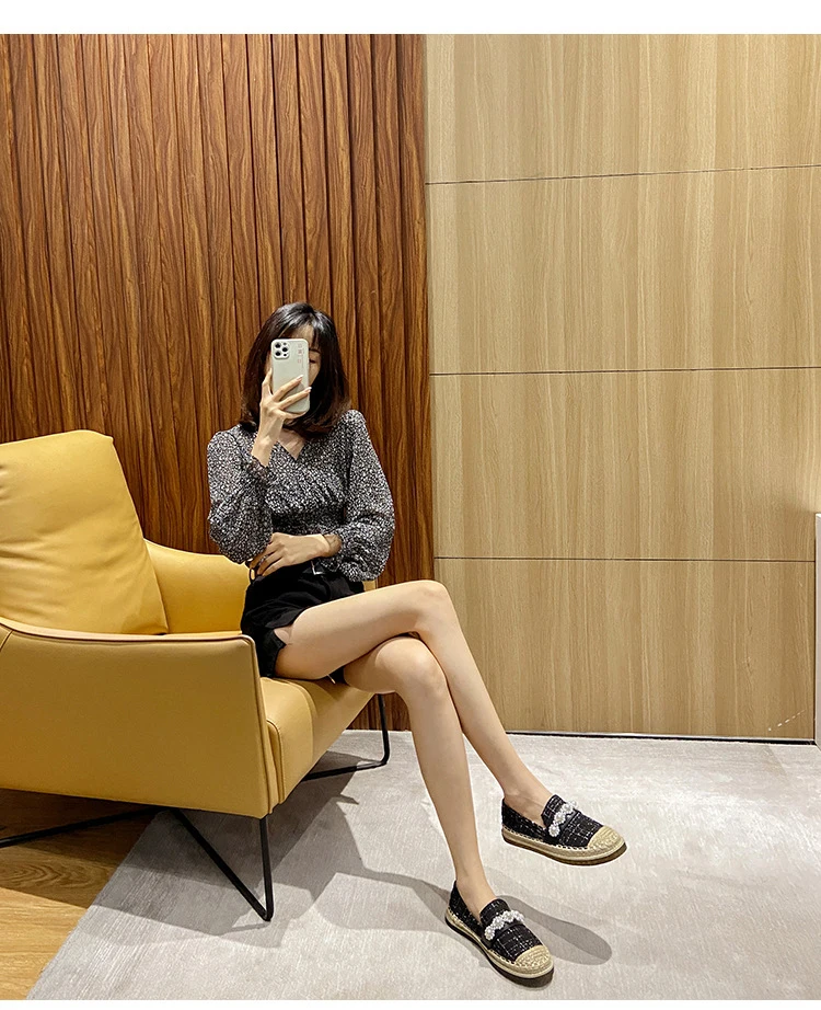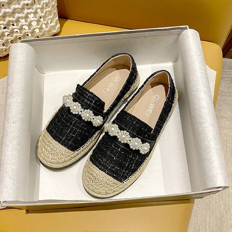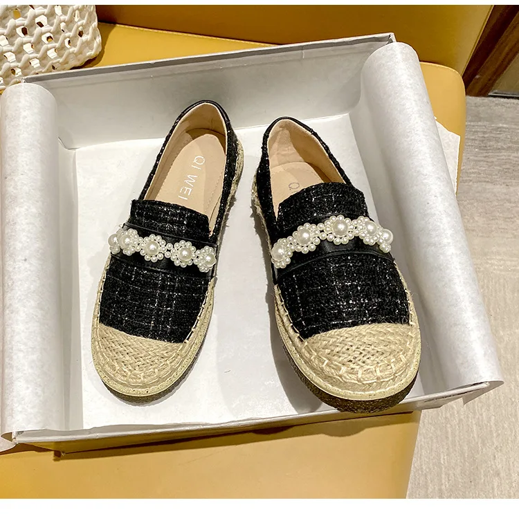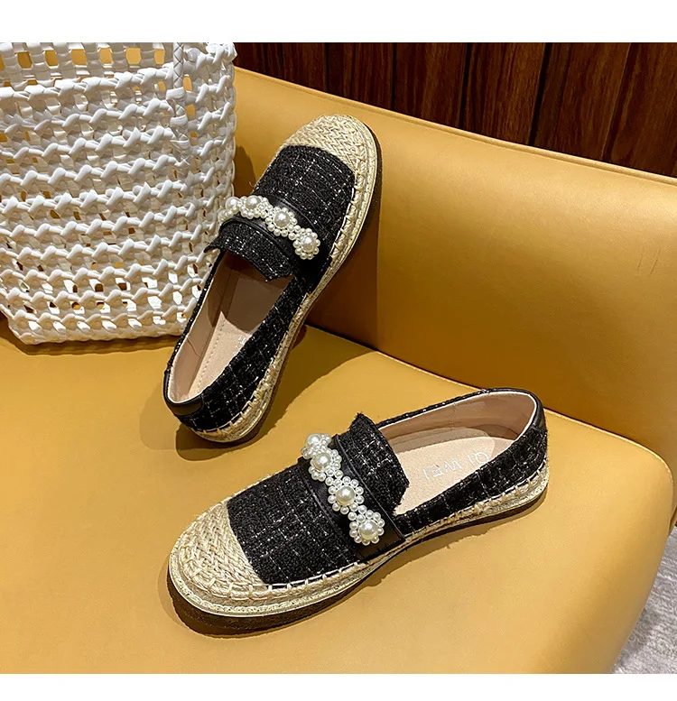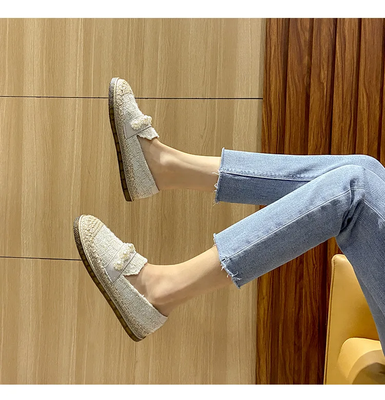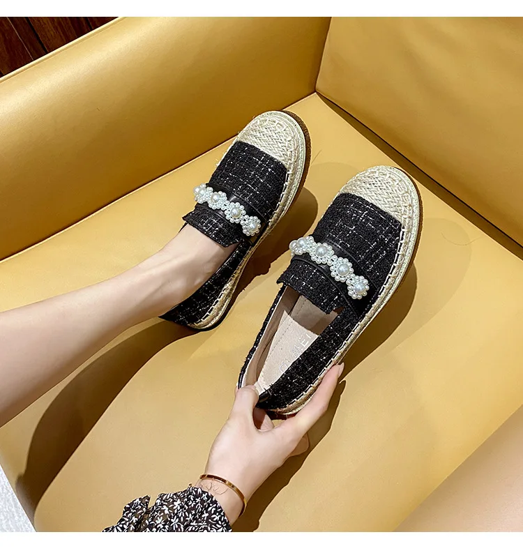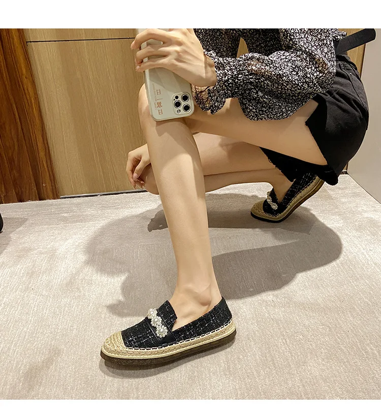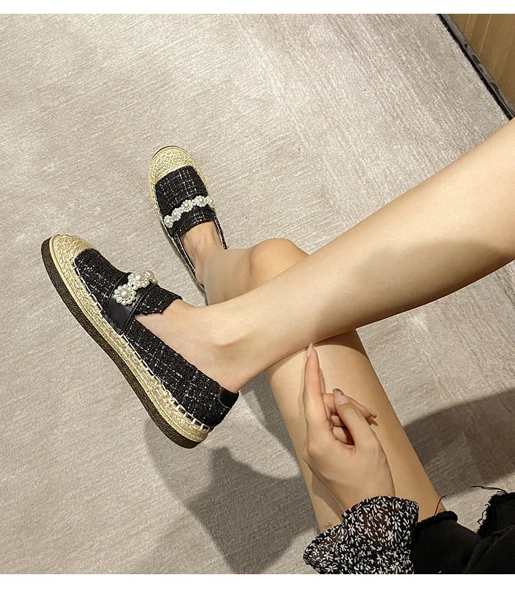 pearl flower decoration espadrilles women flats sequines cloth round toe moccasins famous designer plaid slip on loafers 2022