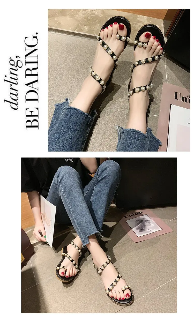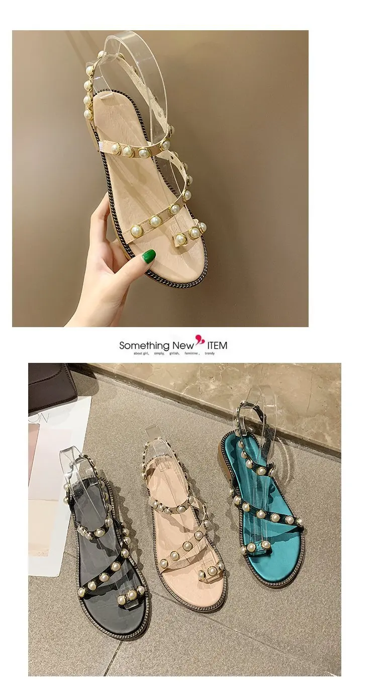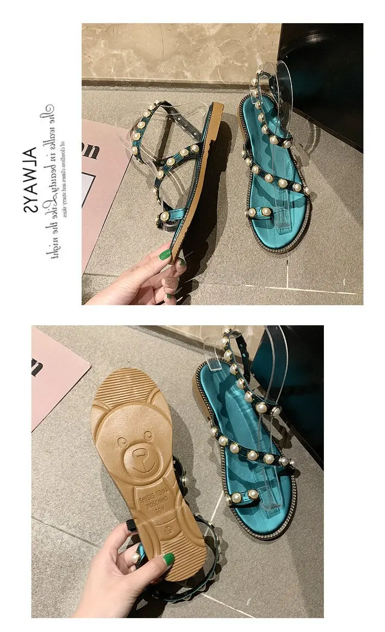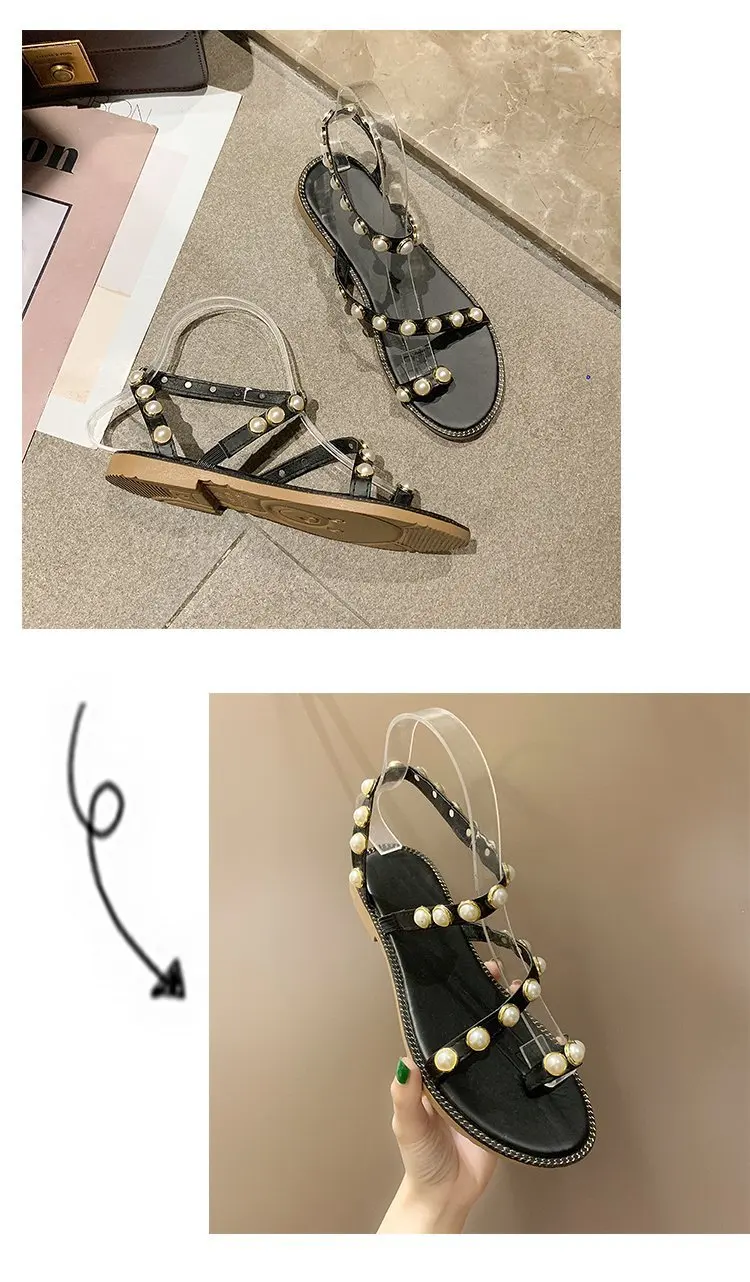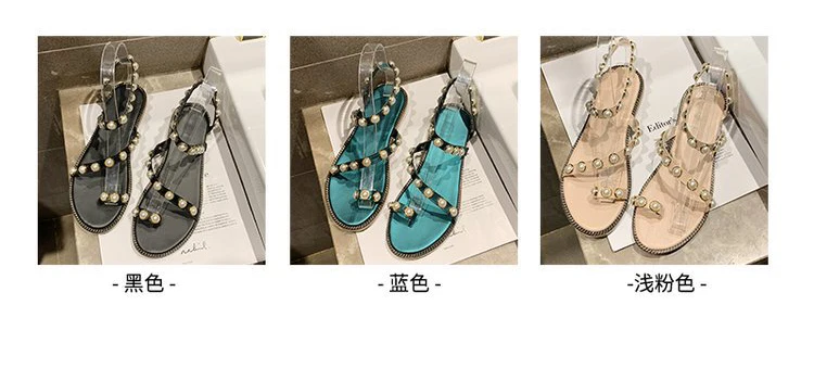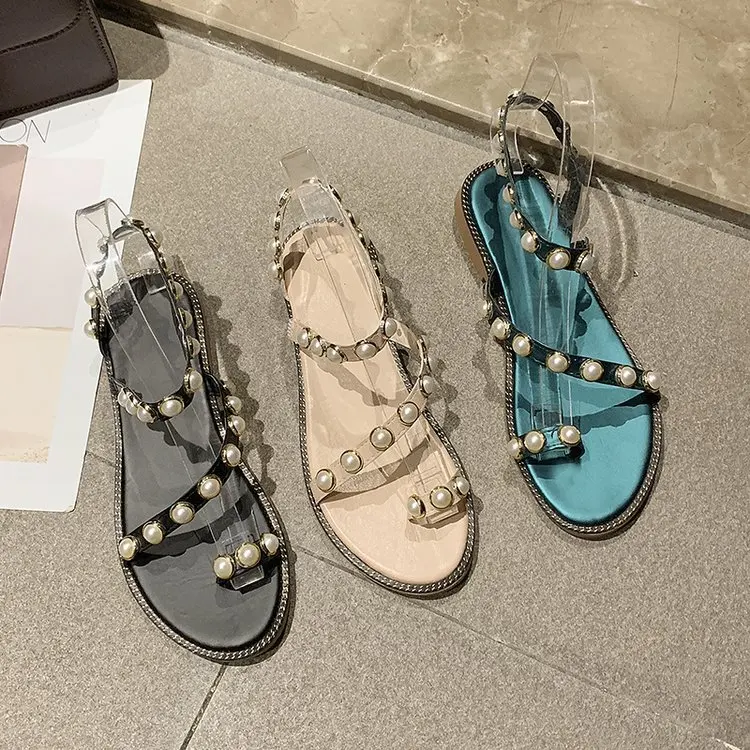 pearl rivets punk sandals women clip toe beading gladiator sandalias mujer slip on lazy shoes woman beach espadrilles sandales